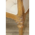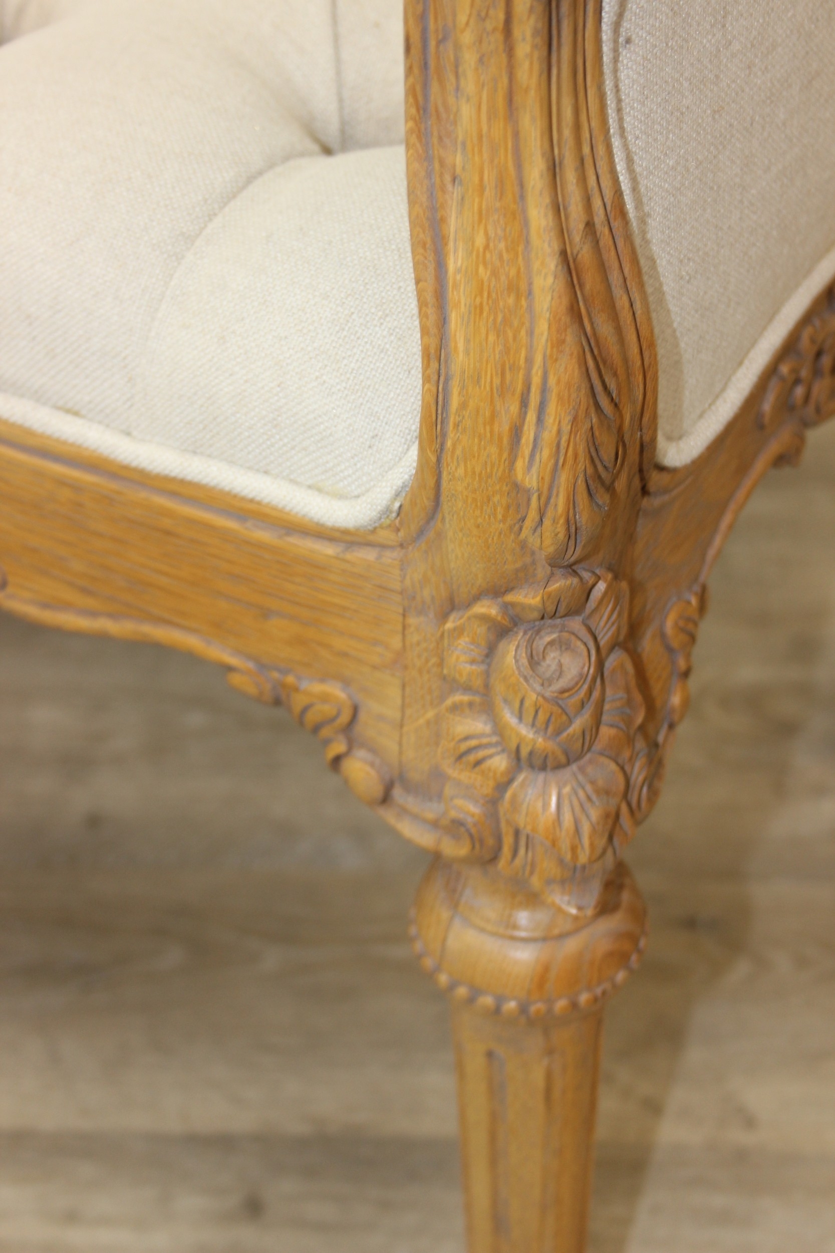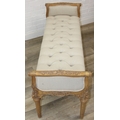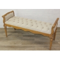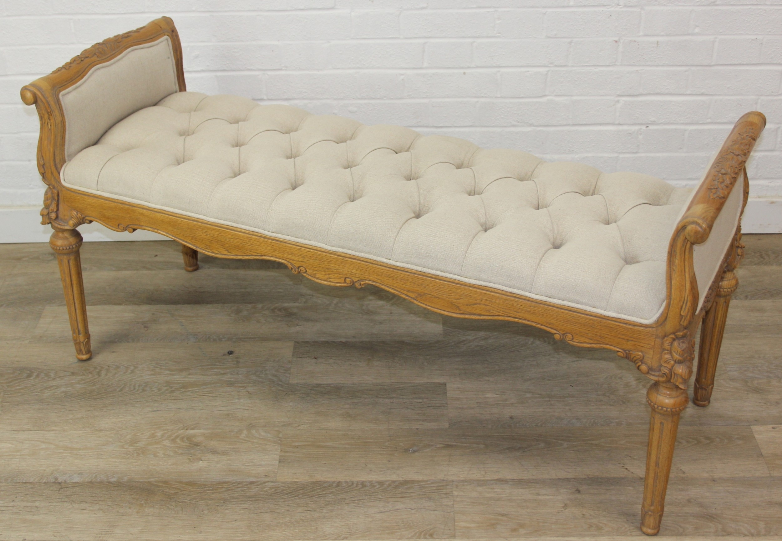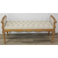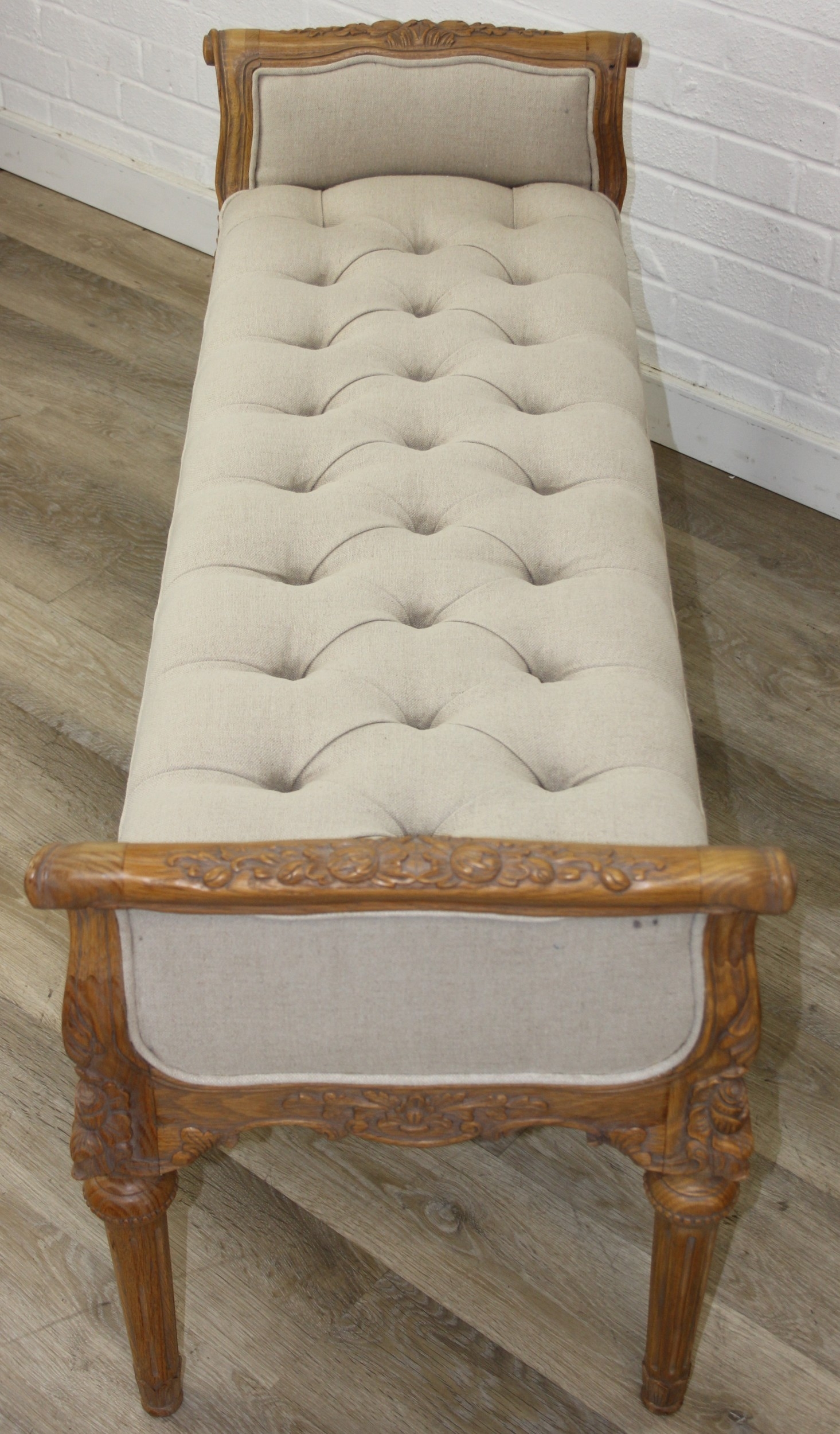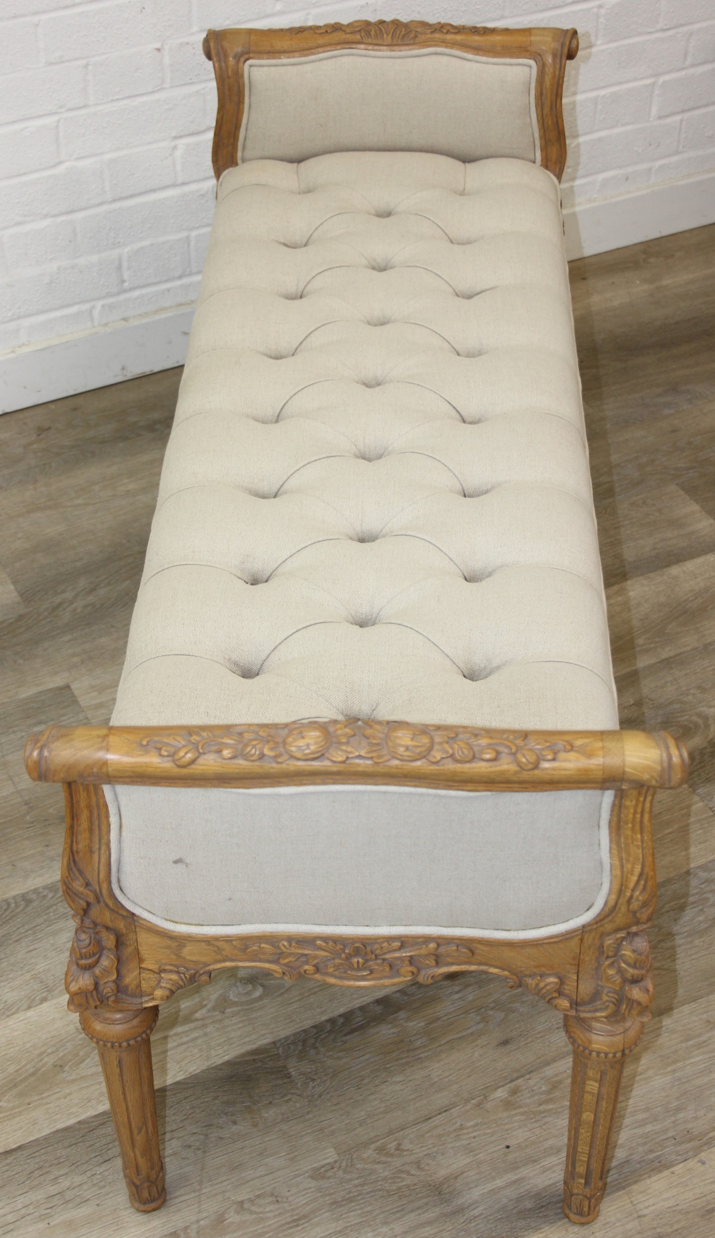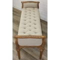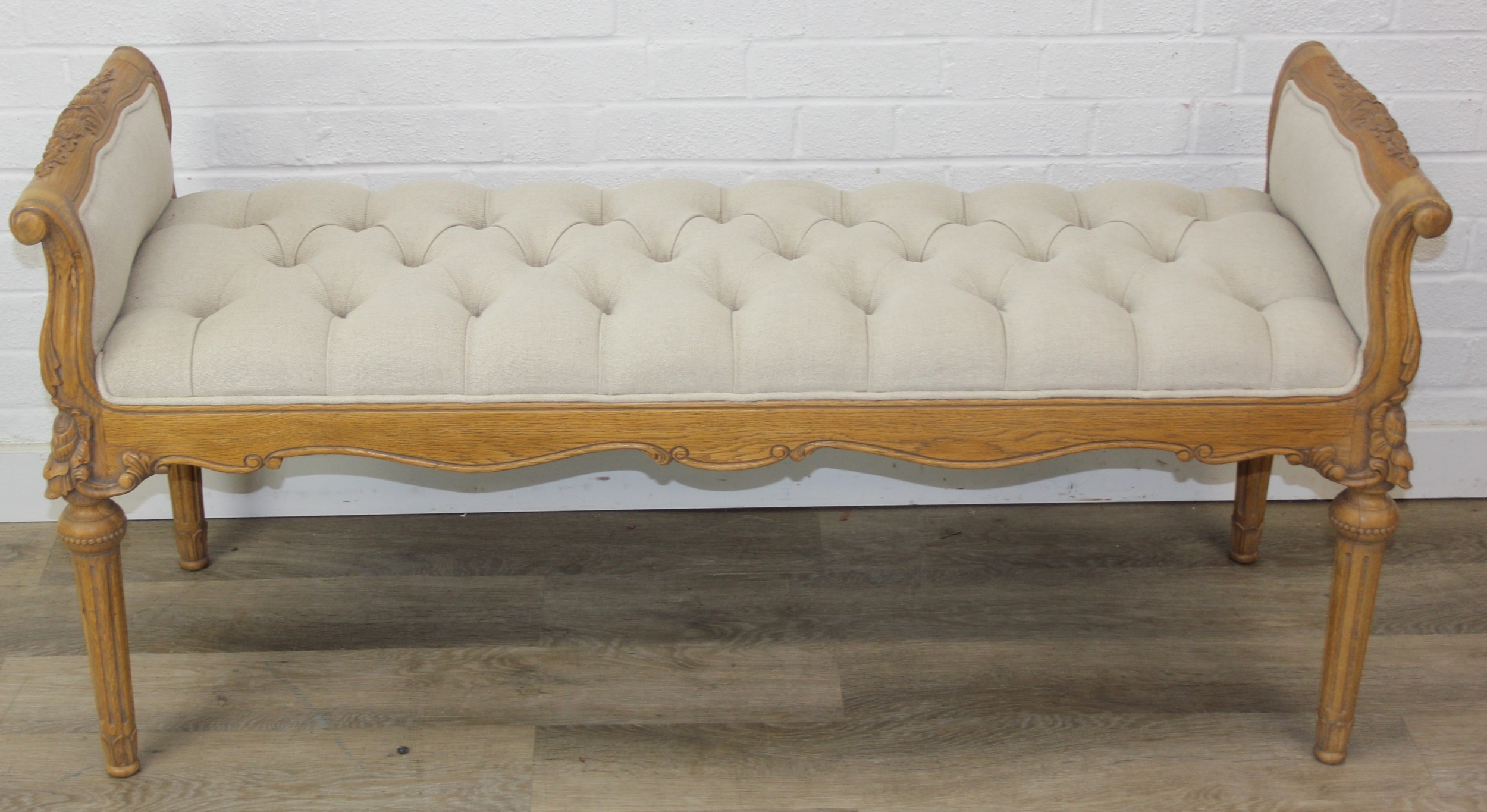An antique style window seat with oatmeal buttoned upholstery and carved wooden exposed frame, reeded legs, 133cm x 48cm x 65cm