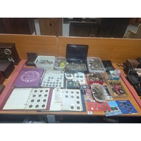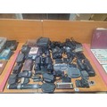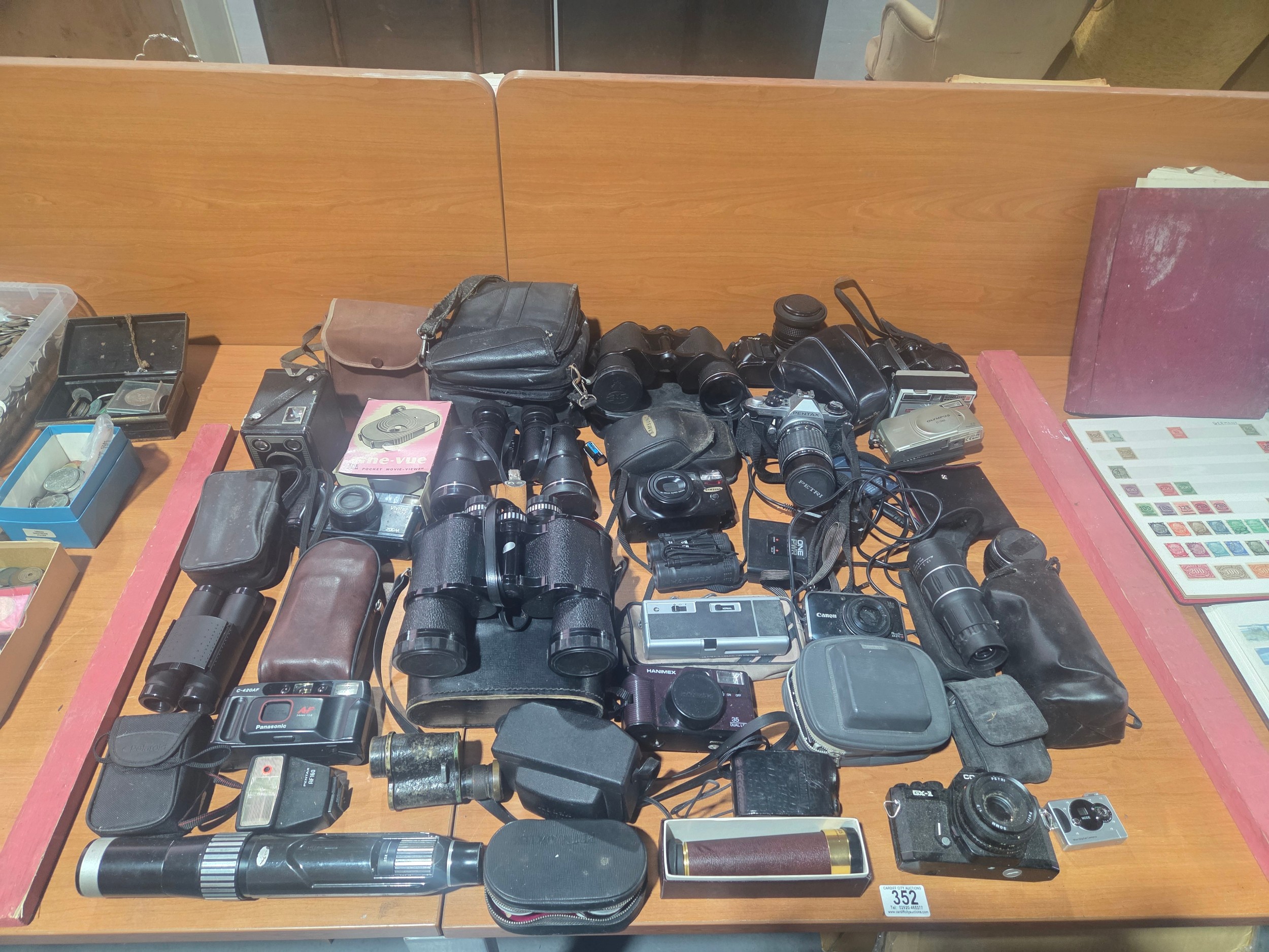 A selection of Canon, Panasonic, Pentax, Olympus cameras and lenses with binoculars