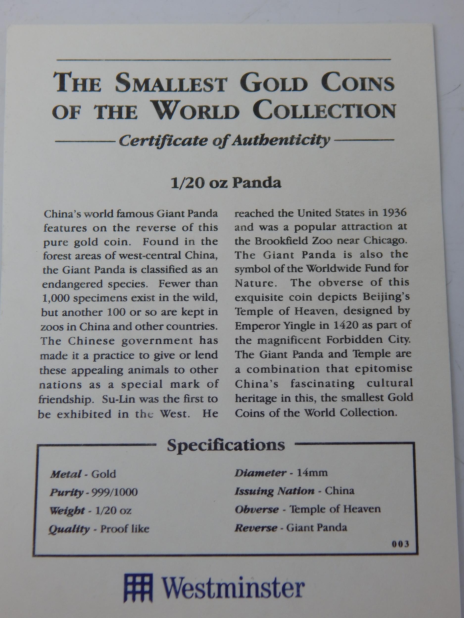 China 1/20 ounce Panda 999 Fine Gold with COA