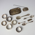 A selection of silver, including a Victorian silver dressing table tray, William Comyns & Sons Ltd, Birmingham 1893, with embossed decoration, 11.5cm wide, an Edwardian silver whistle, Sampson Mordan & Co Ltd, Chester 1905, 4.5cm long, an early 19th century silver fancy back teaspoon, 11.5cm long, and further silver pieces, gross weight 6ozt (qty) (at fault)