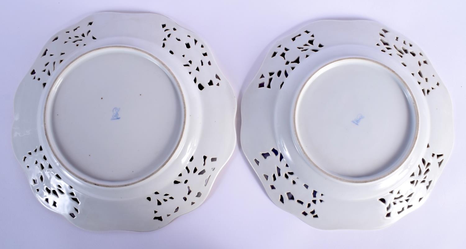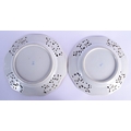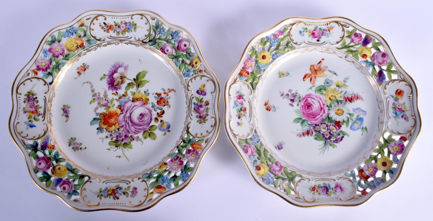 A PAIR OF EARLY 20TH CENTURY DRESDEN RETICULATED PORCELAIN PLATES painted with flowers. 26 cm wide.