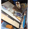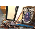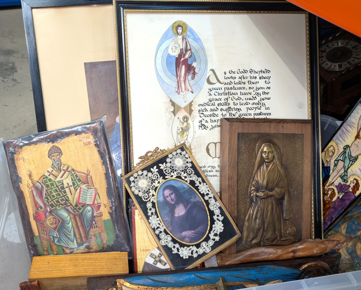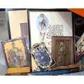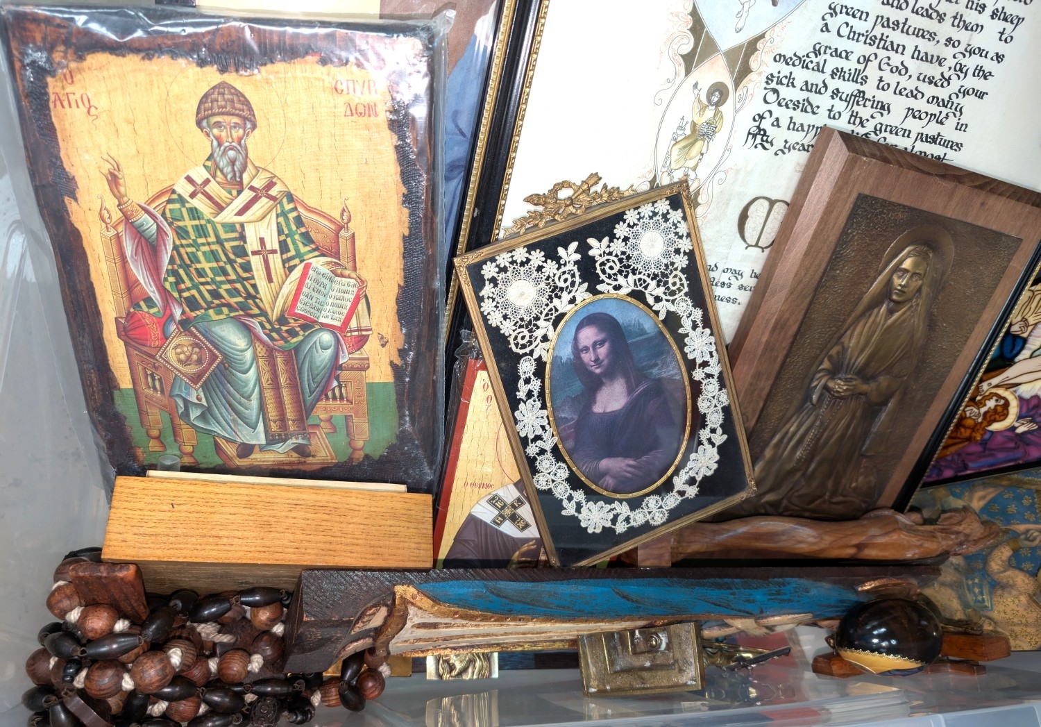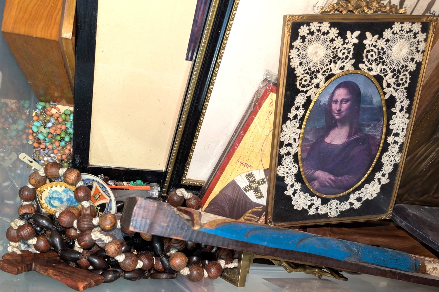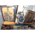 A collection of rosary bead necklaces, religious icons panels, brass crucifix etc.
