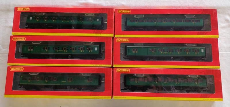 SELECTION OF HORNBY OO GAUGE SR MAUNSELL CARRIAGES INCLUDING R4390 - 1ST CLASS COACH 7211, R4341A - BRAKE COMPOSITE COACH 6592, R4342A - 4 COMPARTMENT BRAKE 3RD CLASS COACH 3722 AND OTHERS.