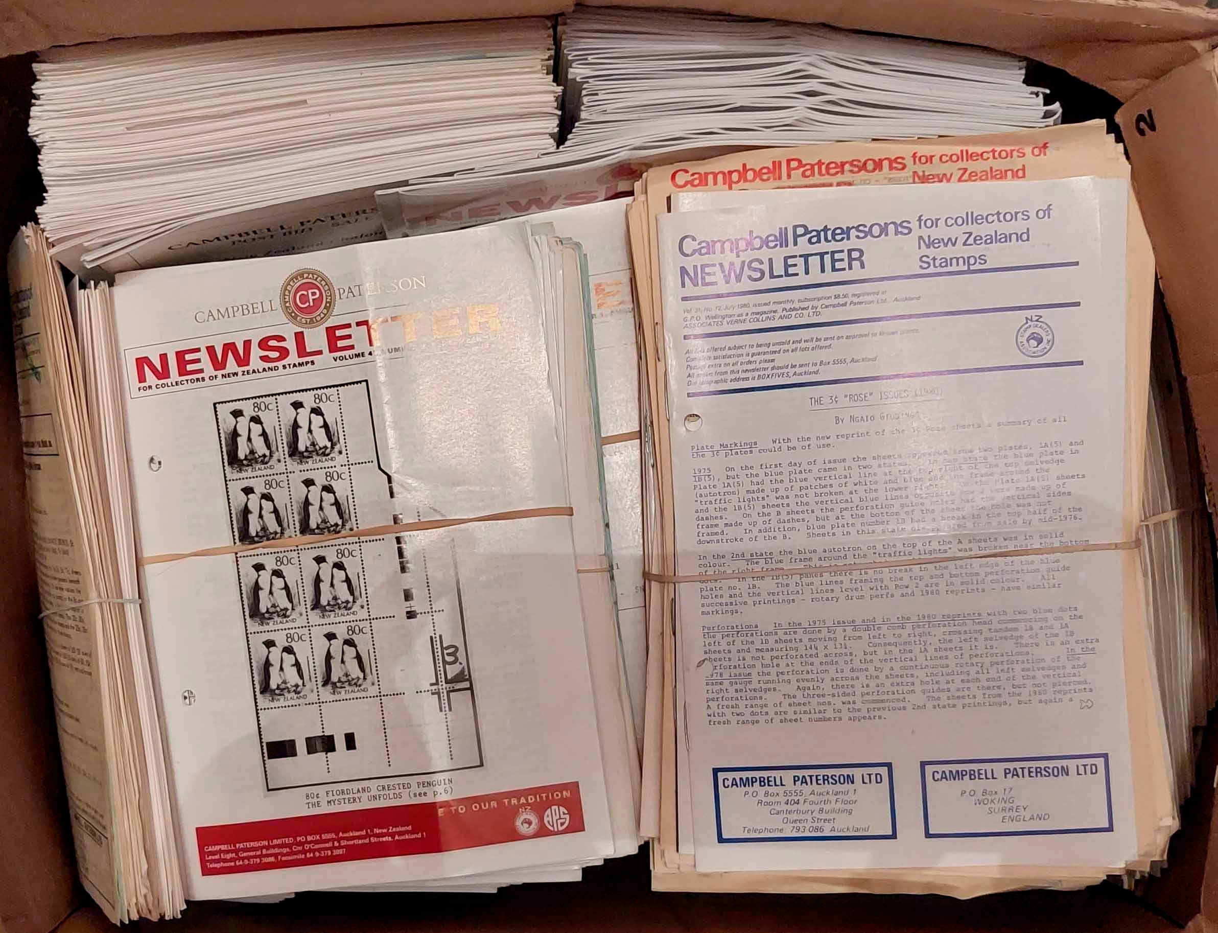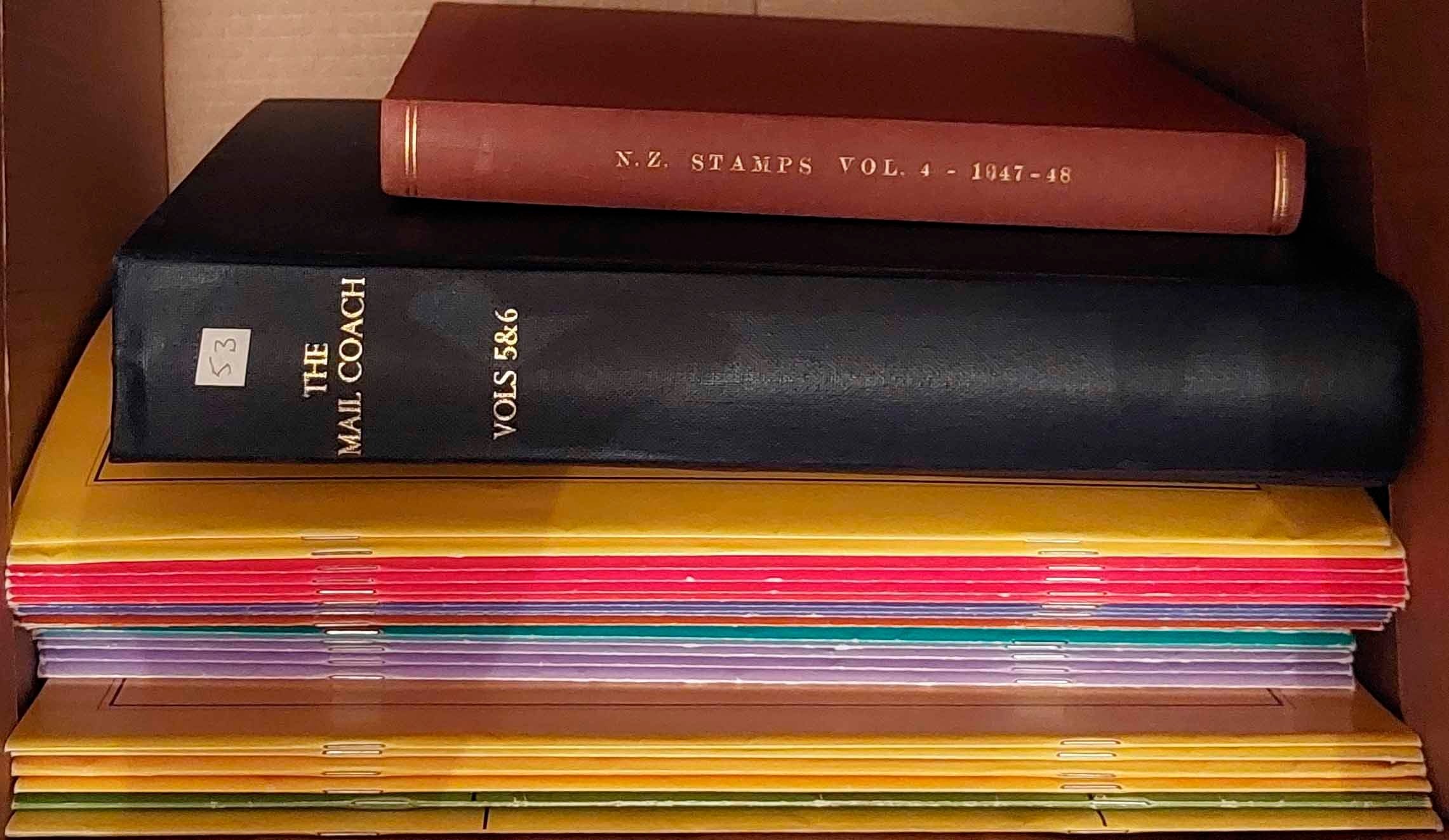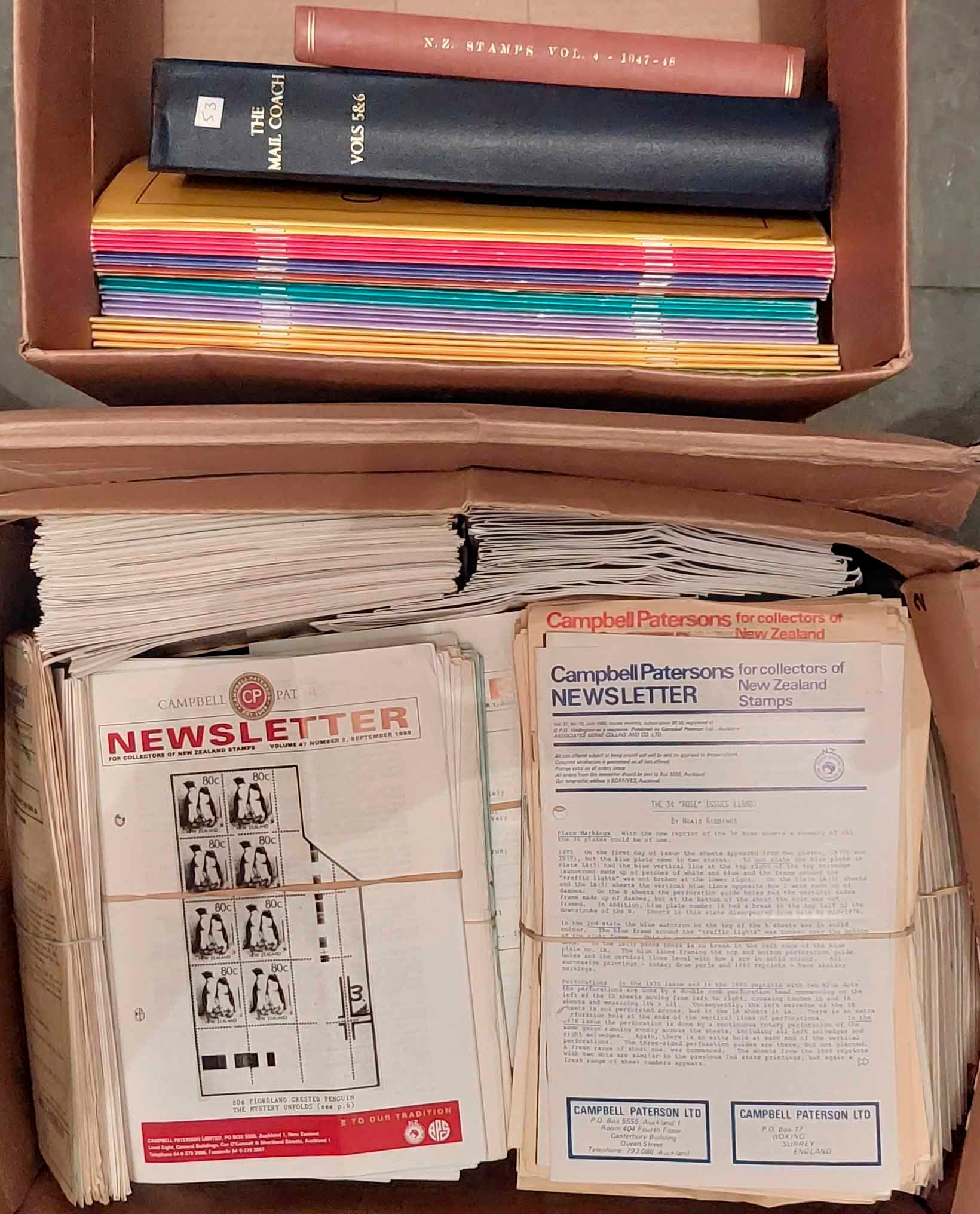 NEW ZEALAND MAGAZINE MISCELLANY: Two cartons inc. The Mail Coach vols. 5 & 6 (bound); New Zealand Stamps 1947-48 (bound); New Zealand Stamp Collector (28 loose issues between 2004-14); and Campbell Paterson Newsletters (990 loose issue, between 1967-2022). (Qty) Cross Reference: NEW ZEALAND