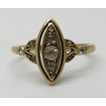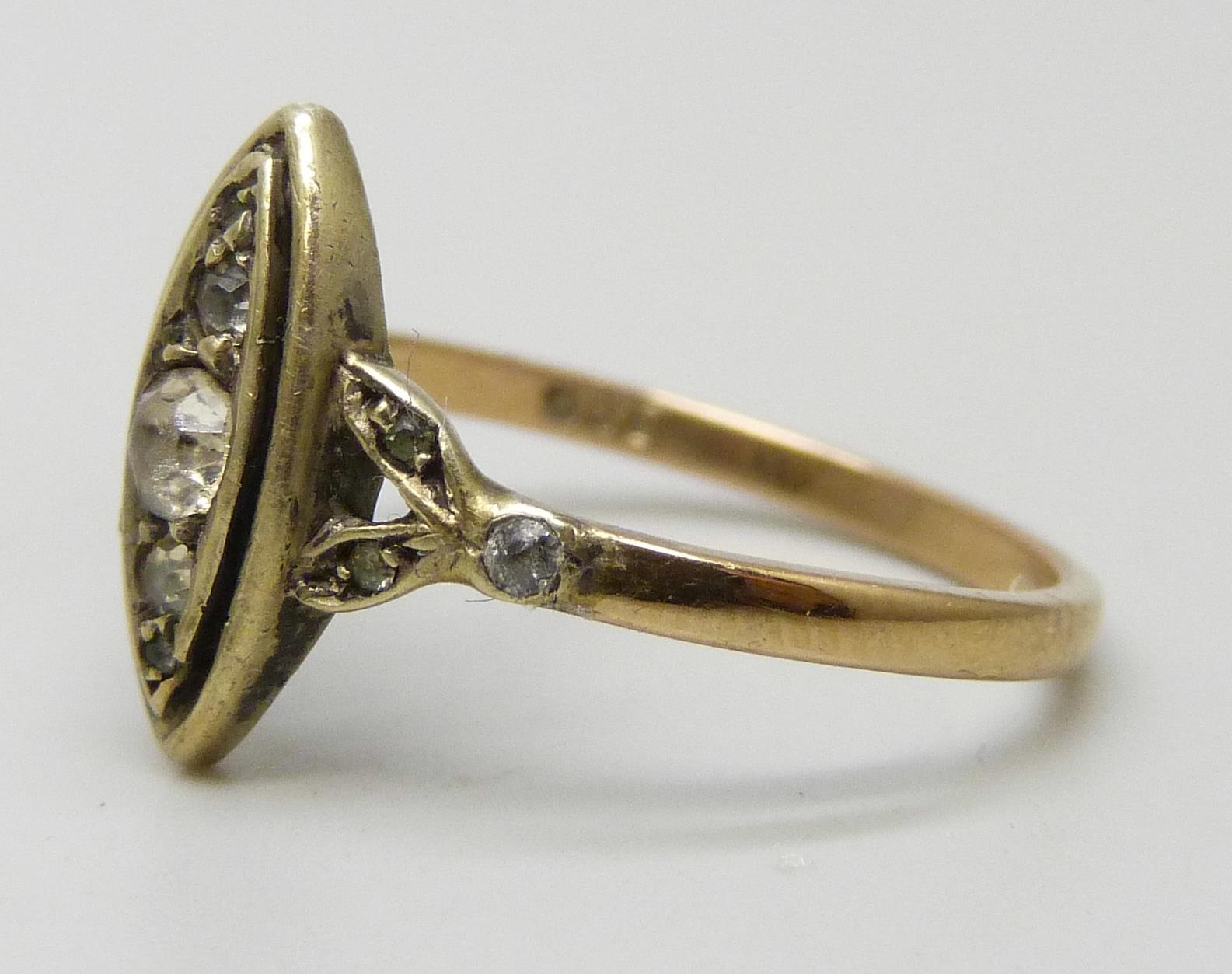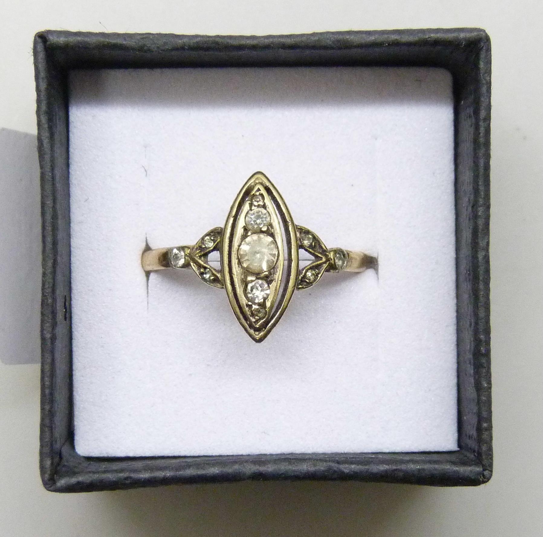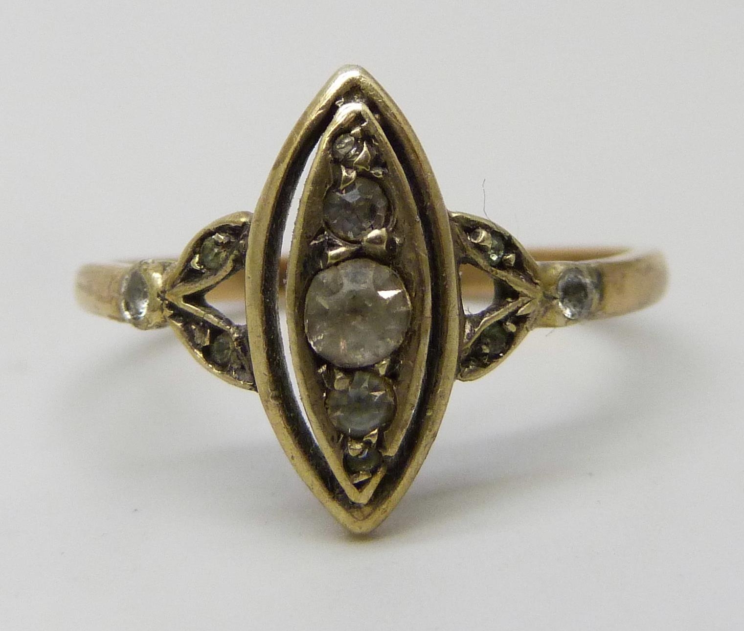 A marquise shape ring, the shank 9ct with an attached gilt metal replacement setting area, 2.2g, P