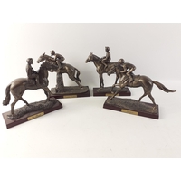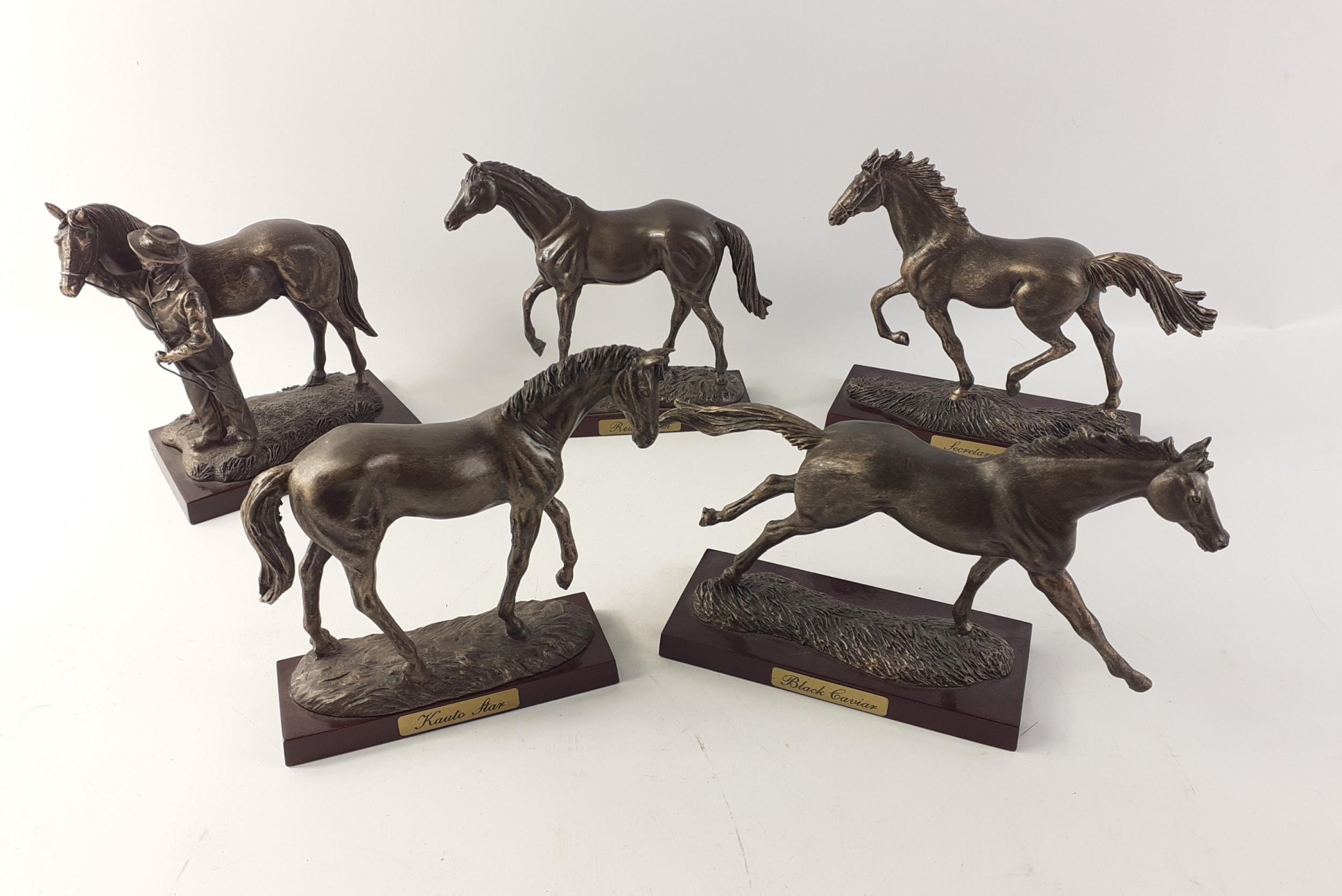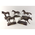 A collection of five bronze effect resin models of race horses on plinths. Each stands approx 14cm high and all are in good order with the exception of Red Rum which has ear damage.