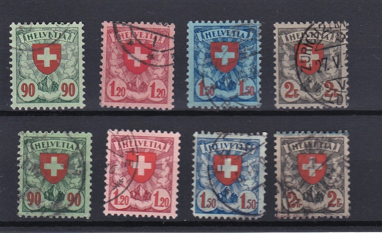 Switzerland 1924-1934 SG 329-332 fine used set, 329a-332a fine used set, Michel 194X - 197X and 194Z - 197Z. Cat £68+
