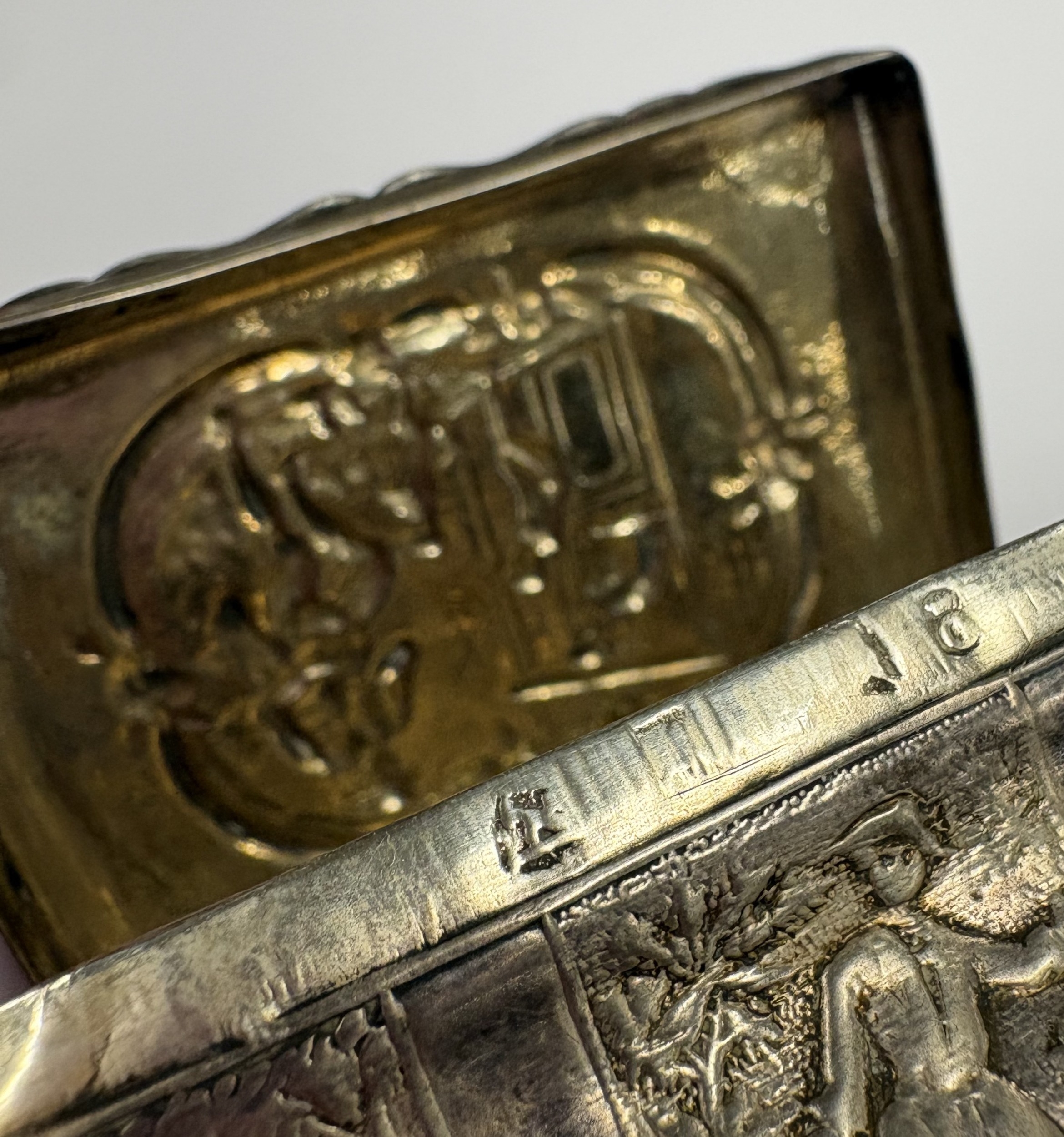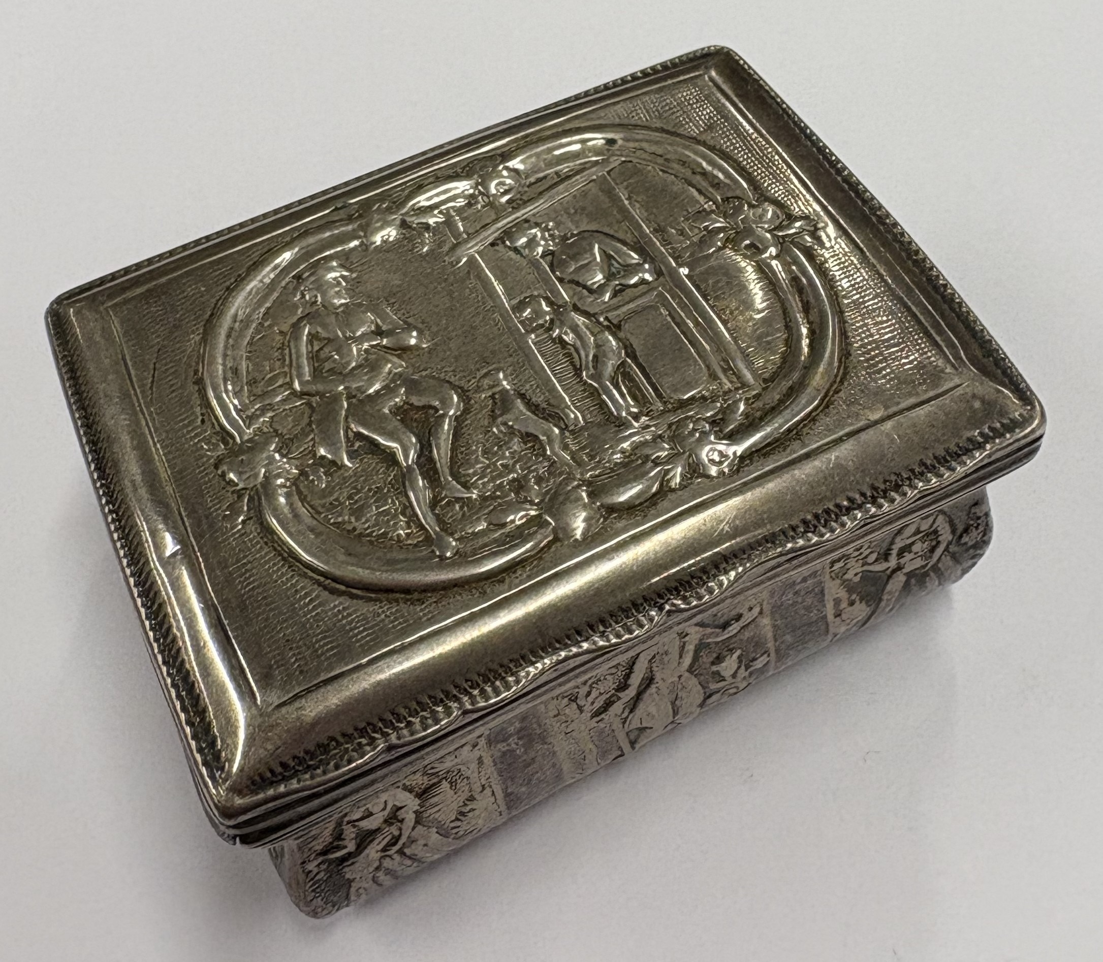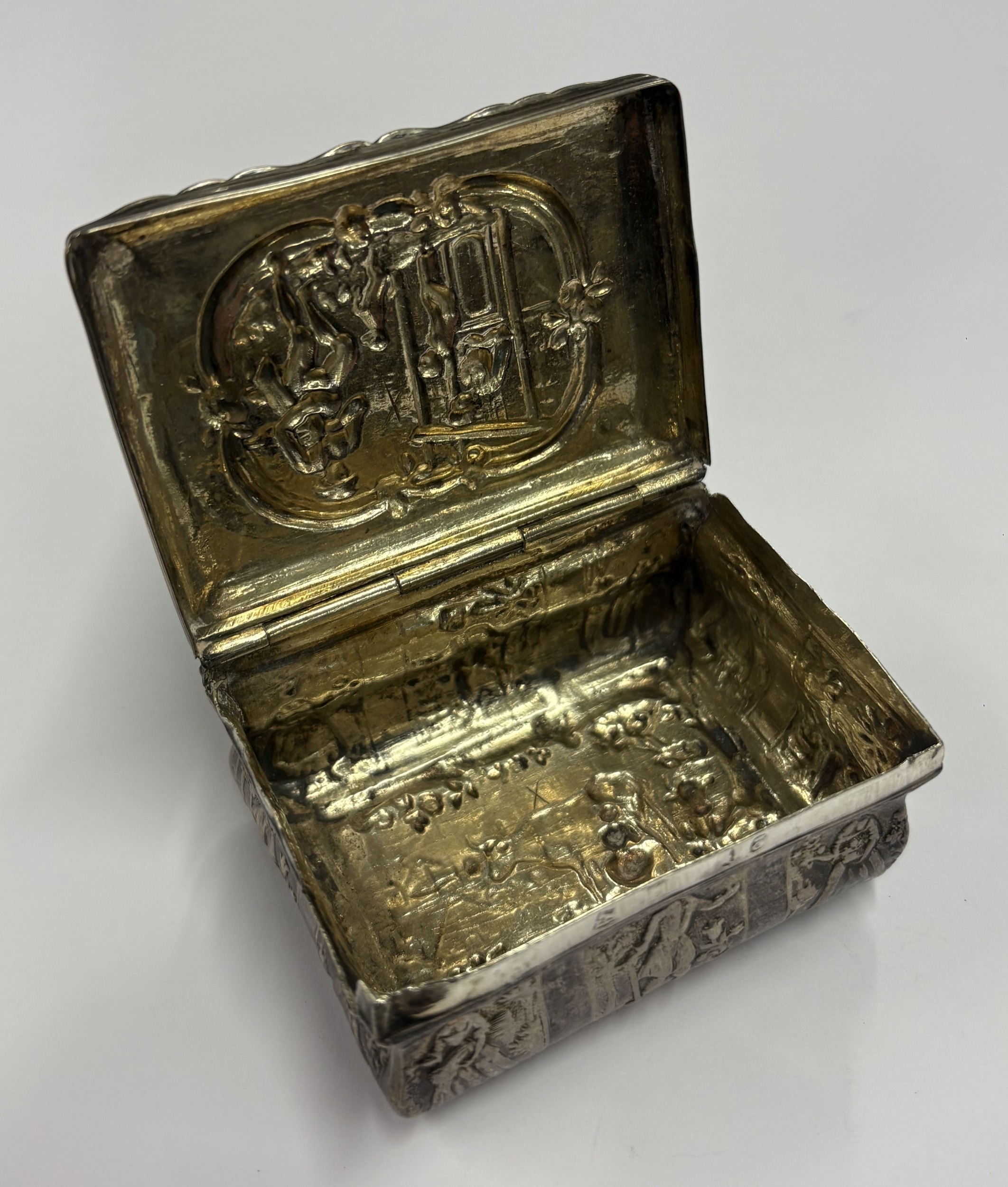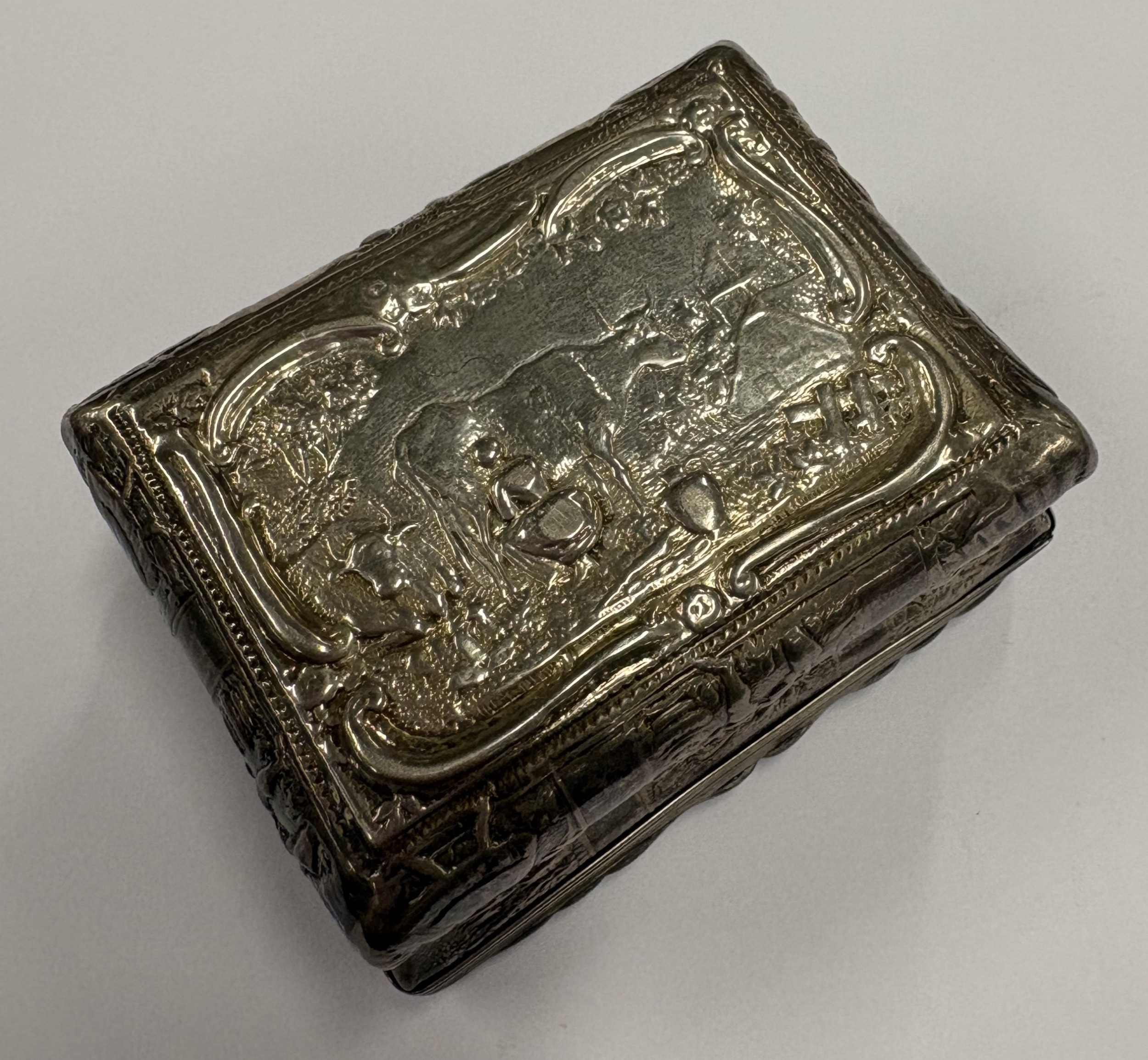 A Continental silver snuff box with chased decoration, marked to side. Approx. 61 grams. Est. £120 - £150.