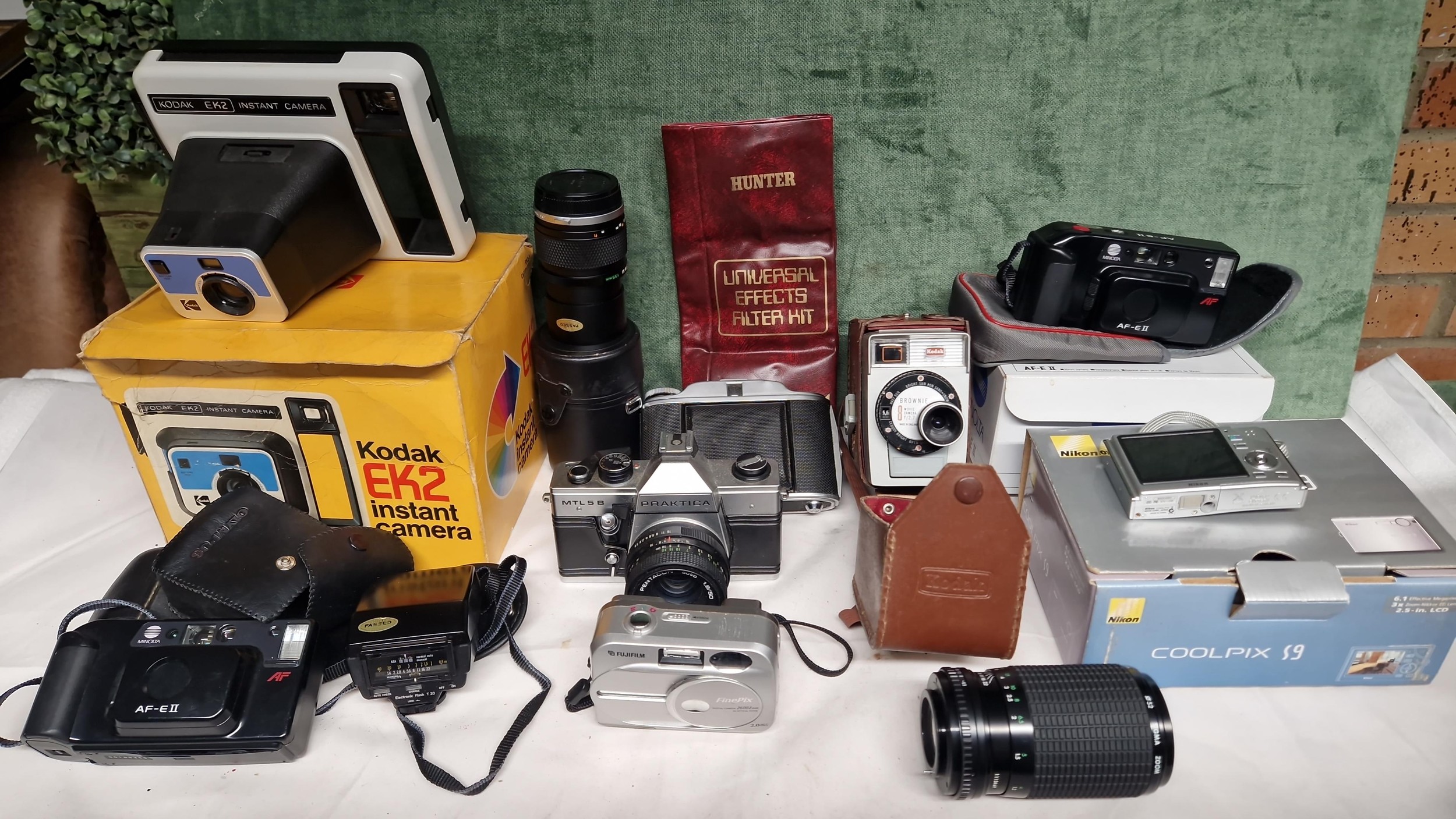 LARGE QTY VARIOUS CAMERAS ETC INC BOXED KODAK EK2, PRACTIKA NTL5B, COOLPIX S9, MINNOLTA AFE11, VINTAGE KODAK BROWNIE ETC ETC