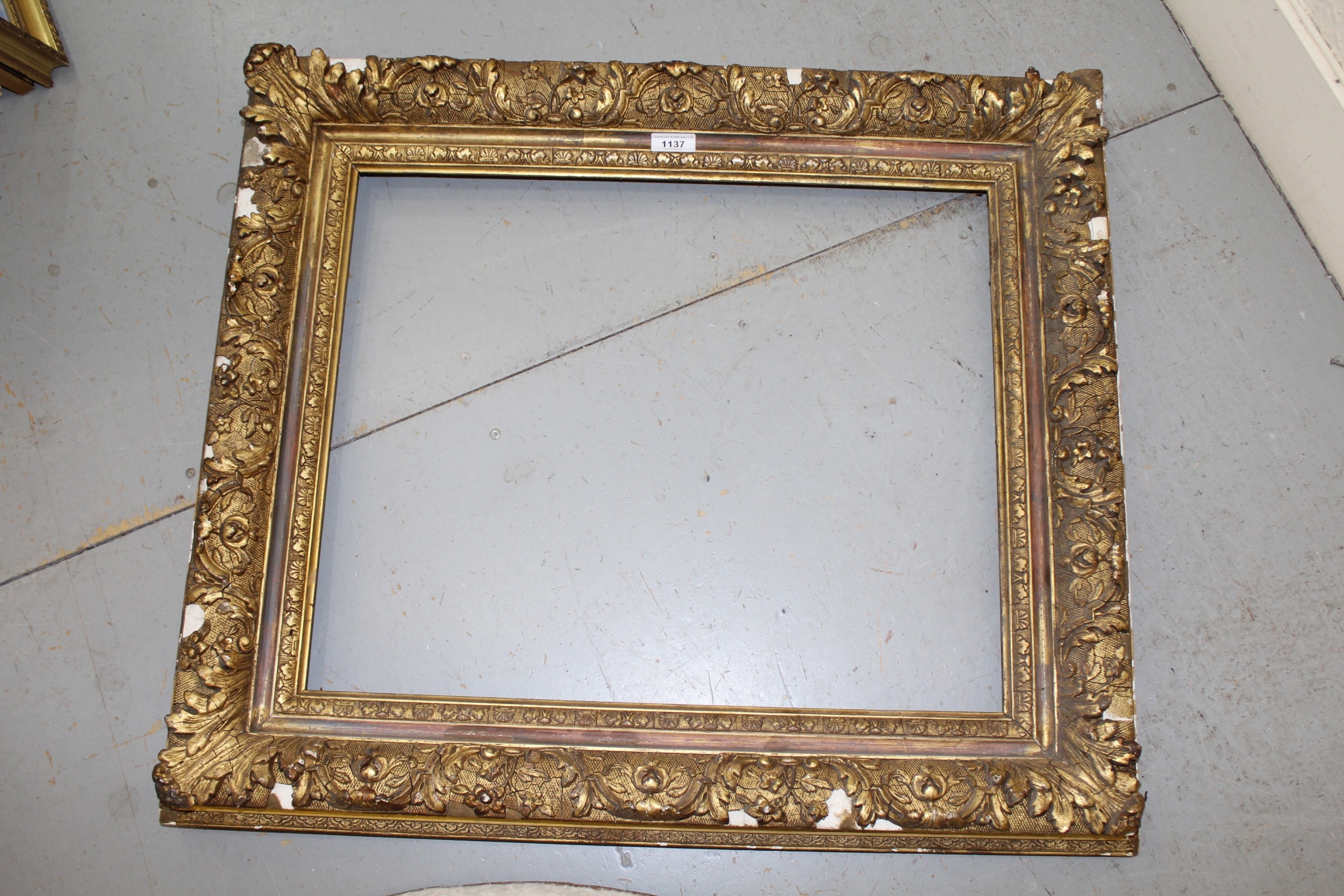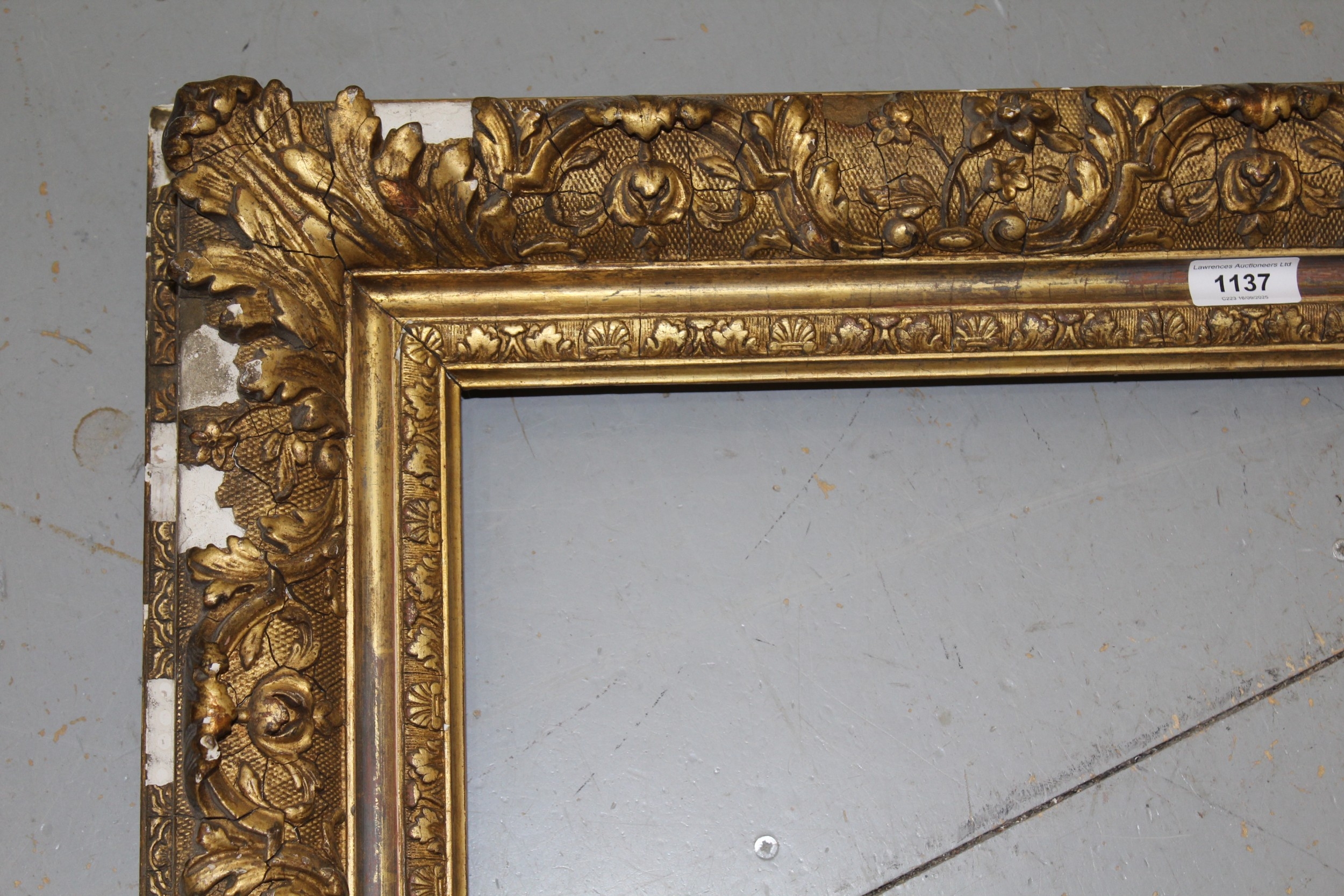 19th Century giltwood and composition picture frame having elaborate scroll and leaf decoration, rebate 56 x 46cm