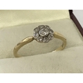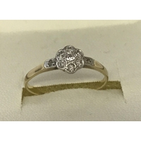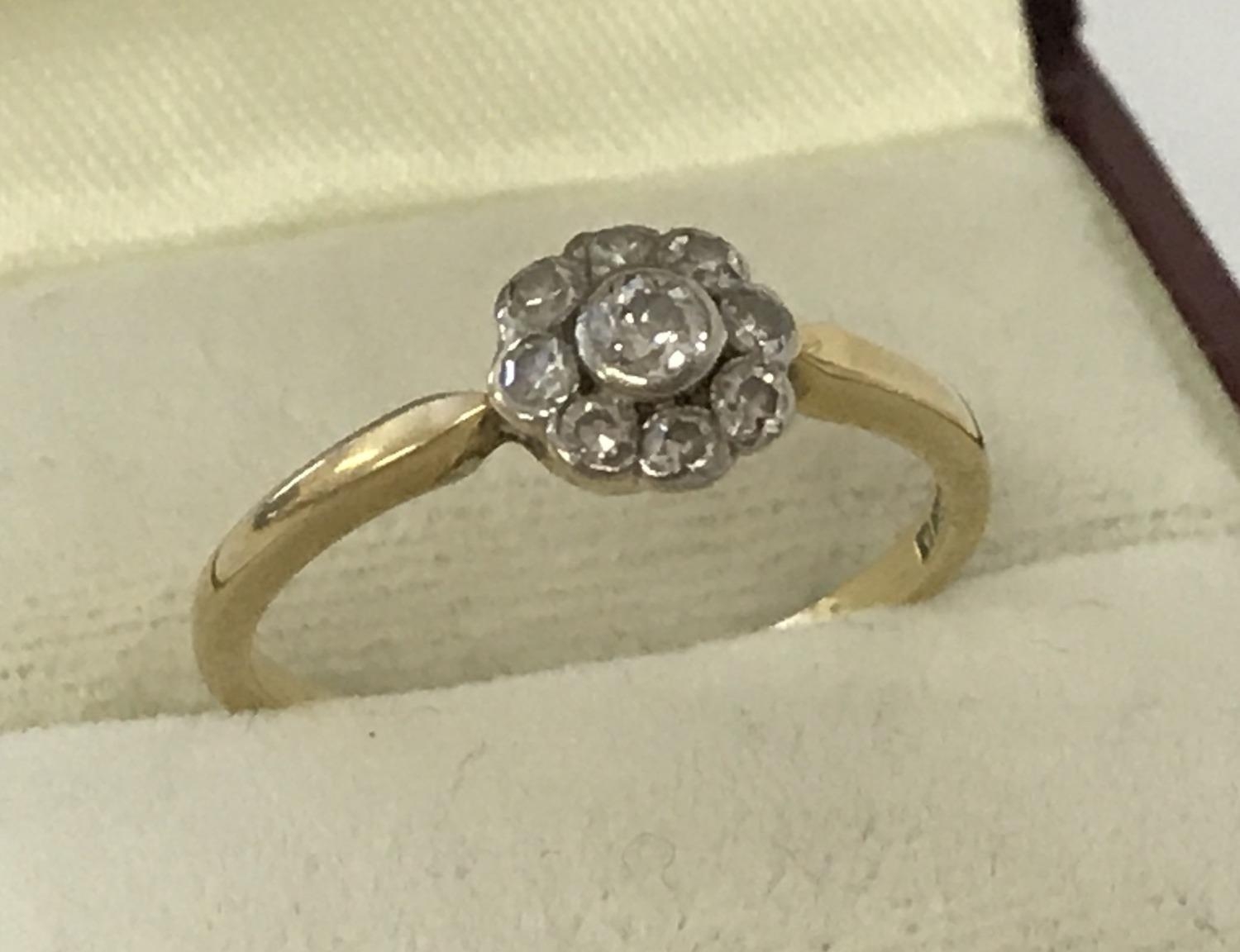 A vintage Art Deco style 18ct diamond set dress ring of flower head design. Central round cut diamond surrounded by 8 smaller round cut diamonds. Diamonds total approx .25 ct. Ring size R. Total weight approx.2.5
