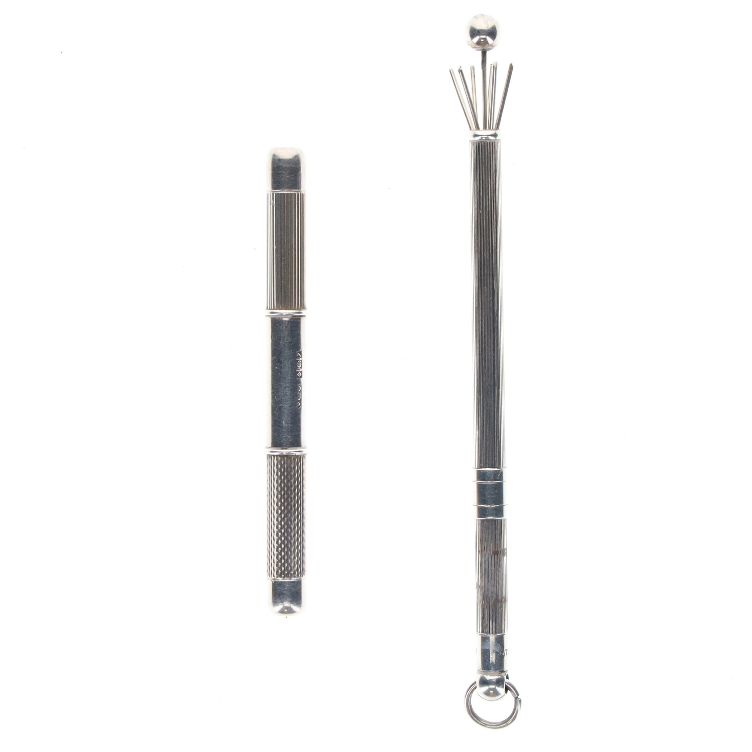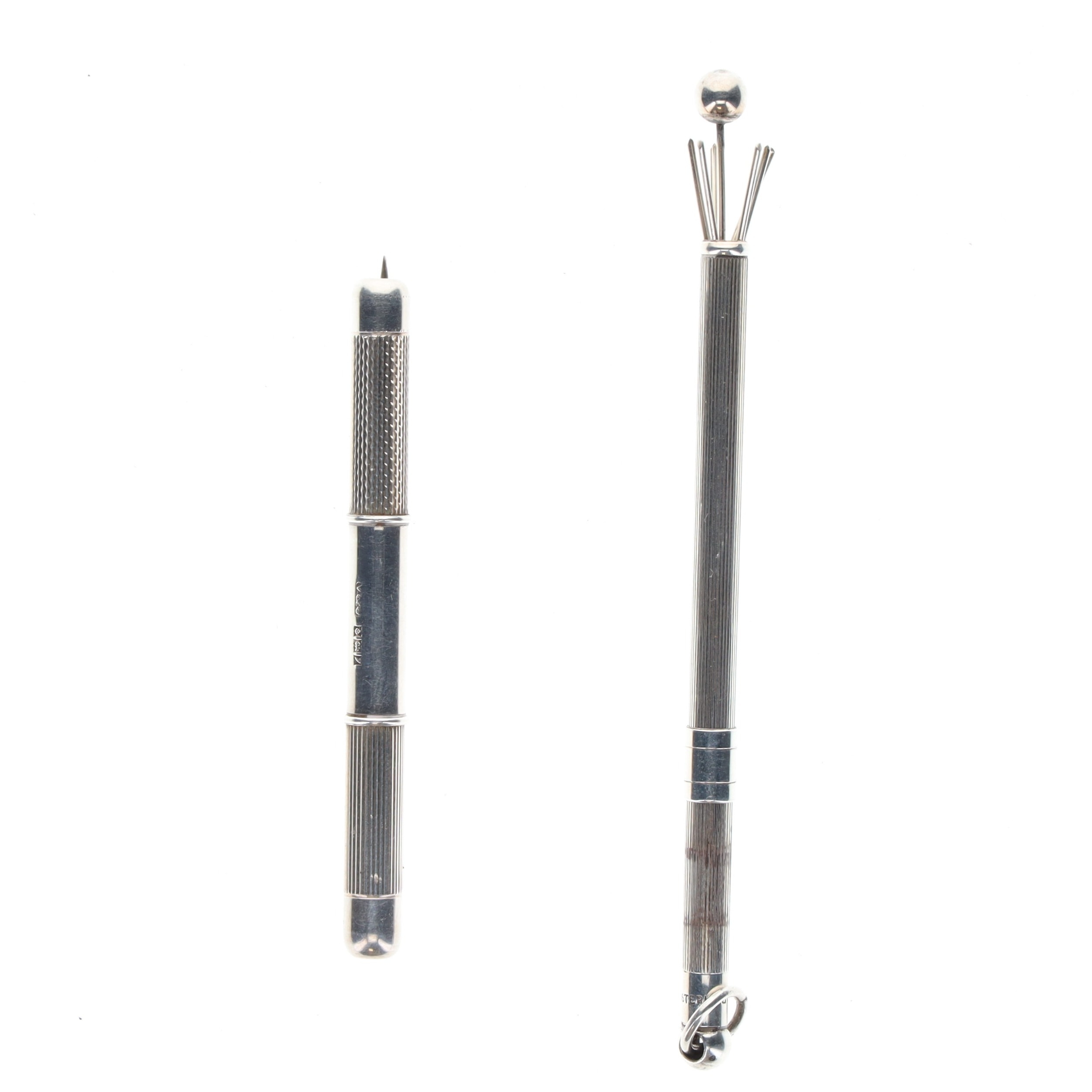 Silver Dual Pocket Toothpick Corkscrew and Swizzle Stick. Visible signs of age and tarnishing throughout.
