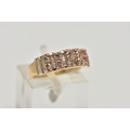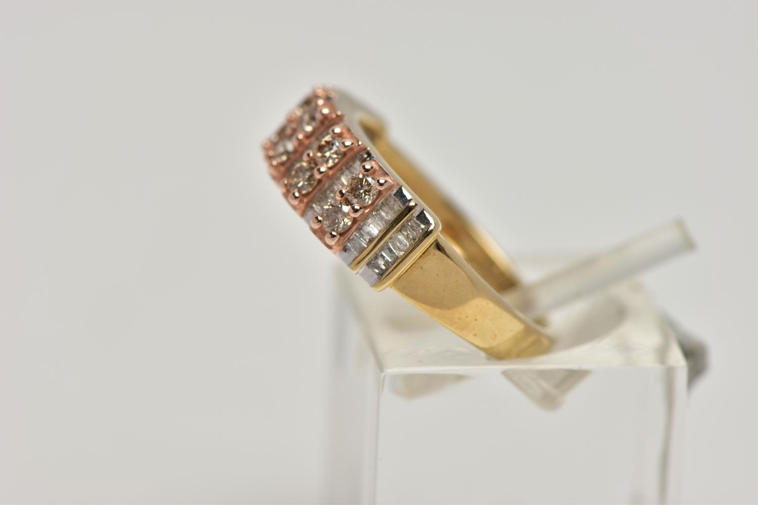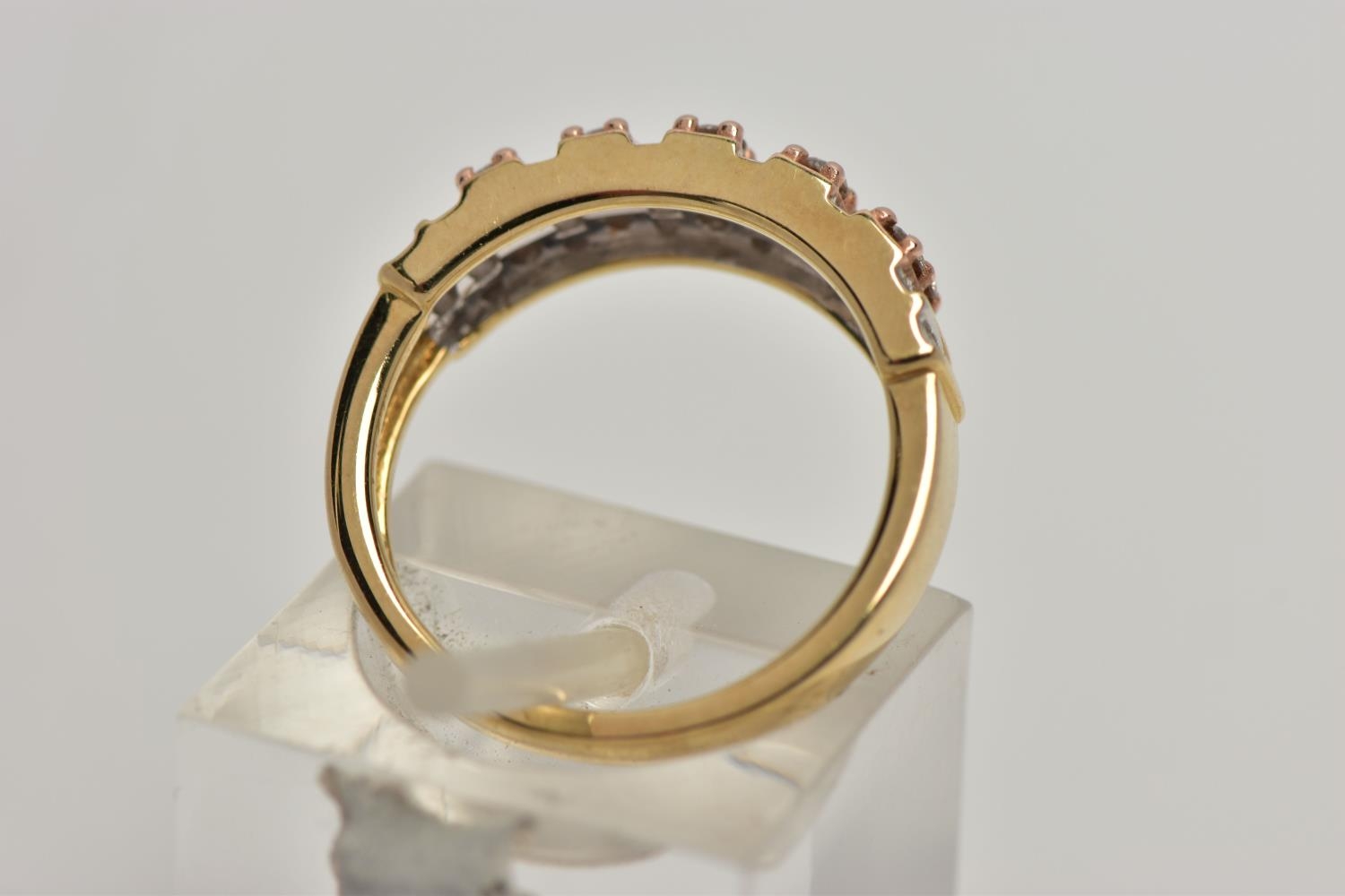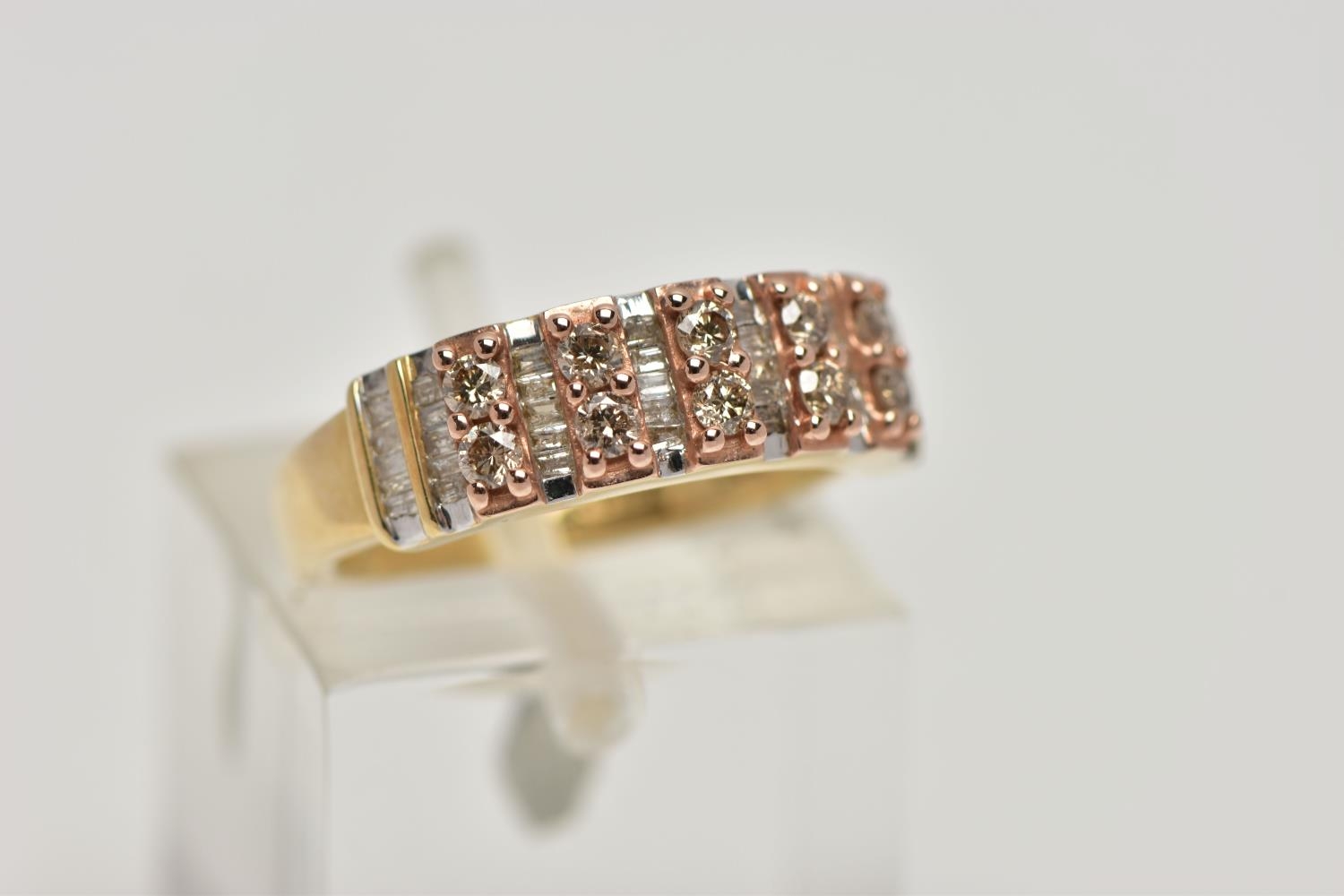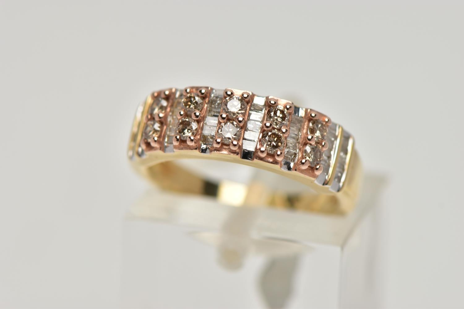 A 9CT GOLD, DIAMOND HALF ETERNITY RING, designed with five sections each set with two brown round brilliant cut diamonds, interspaced with rectangular tapered cut diamonds, polished band hallmarked 9ct Birmingham, ring size J, approximate gross weight 3.2 grams (condition report: all diamonds are intact with some having minor chips or nibbles, general light wear, overall condition good)