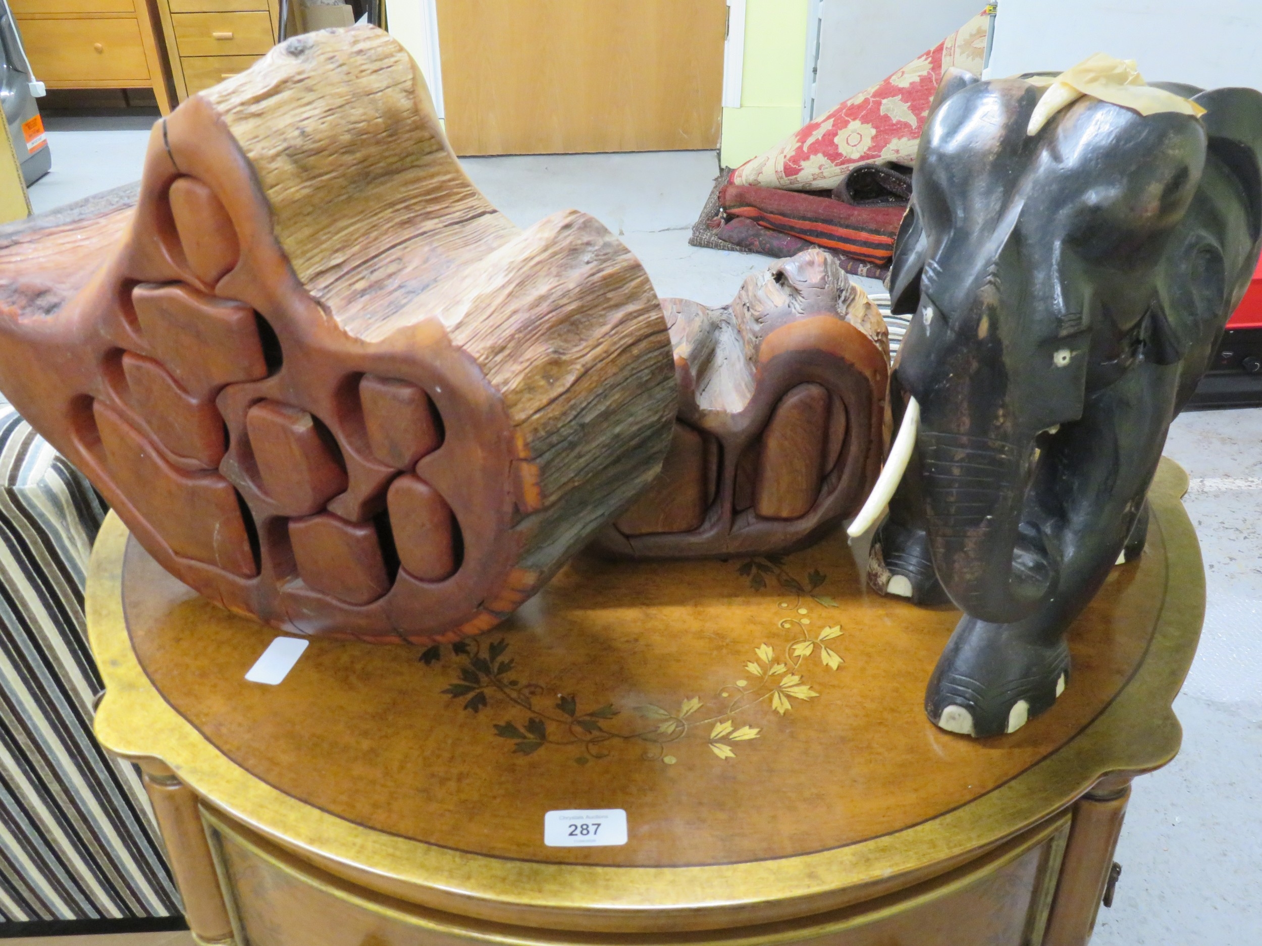 Two unusual miniature chests of drawers, plus a well carved wooden elephant