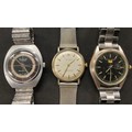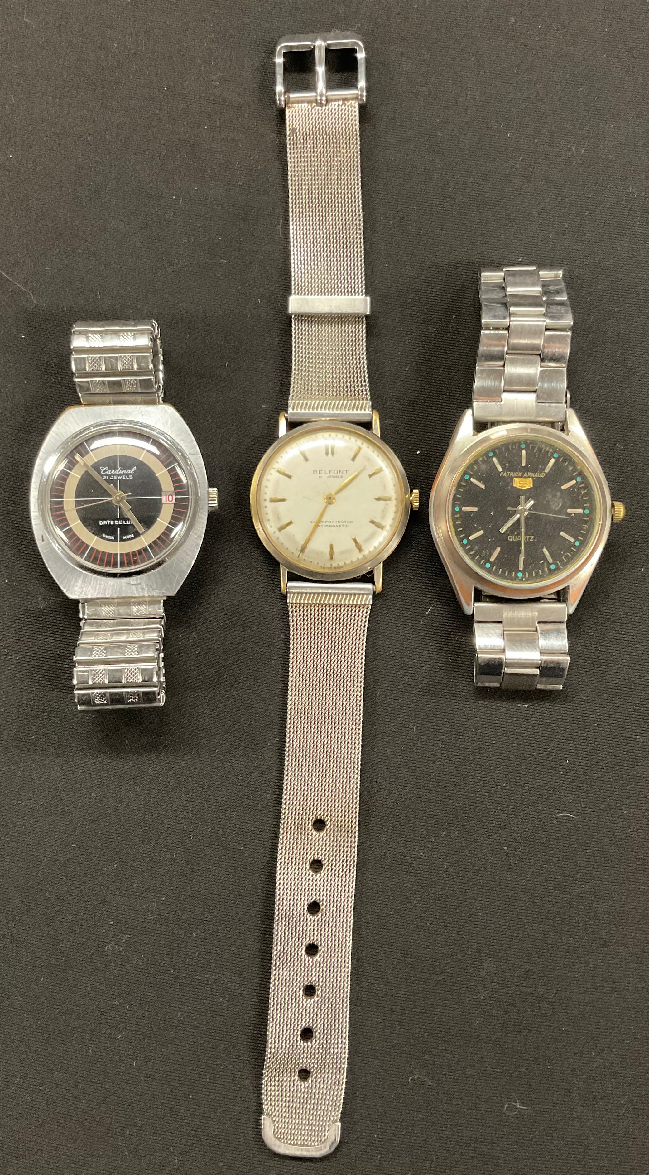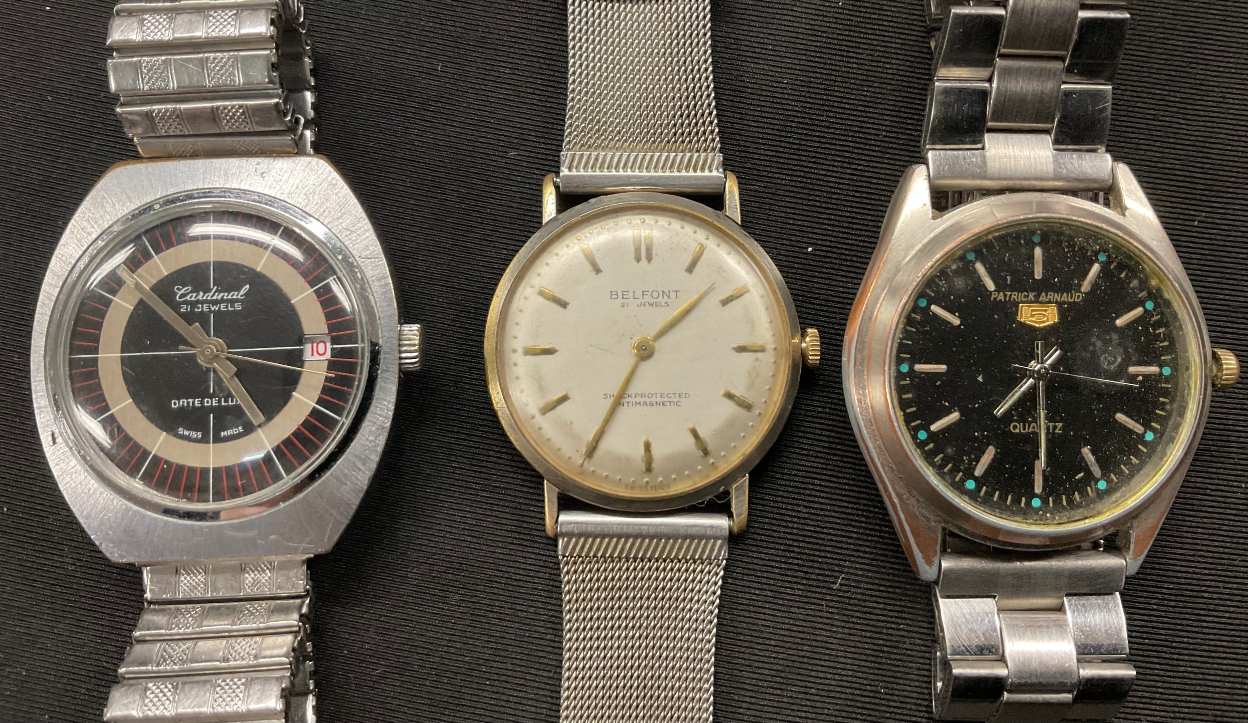 Watches - a Cardinal Date Deluxe gentleman’s wristwatch, 36mm silver and black TV dial, thin baton markers, 21 jewel movement, cal 215A; another, a Belfont 21 jewel wristwatch, 32mm silvered dial, gold block baton markers; others, a Patrick Arnaud gentleman’s wristwatch, 35mm blackened dial, 5 quartz movement (3)