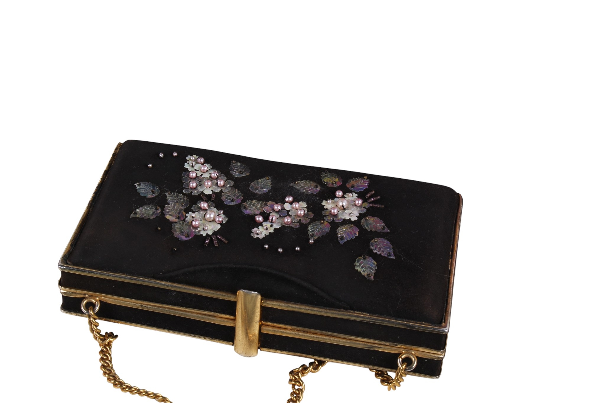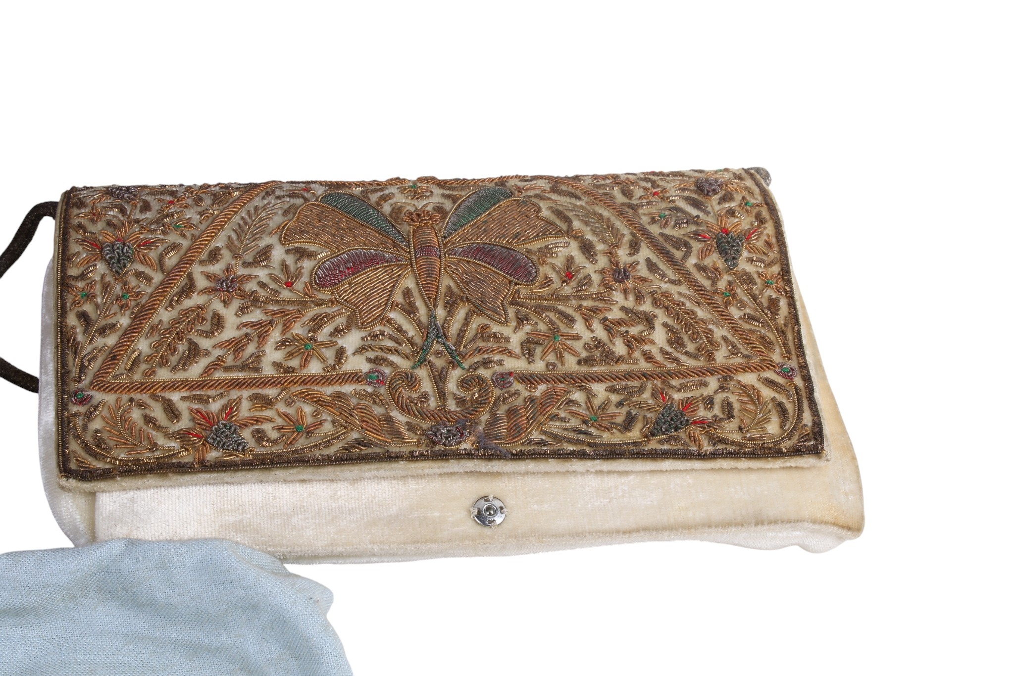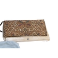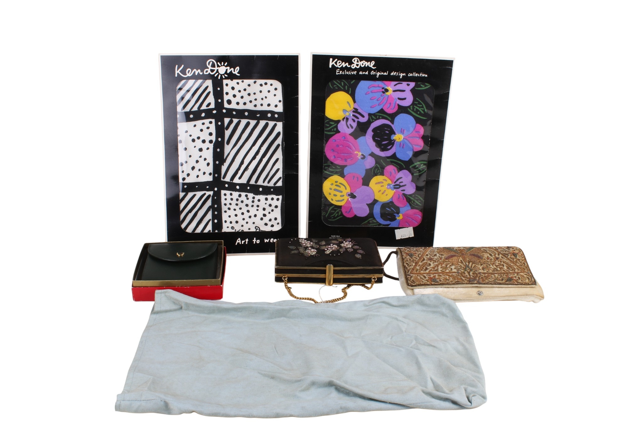 A collection of women's fashion textiles. Including two handbags, a wallet and two silk scarves by Australian designer Ken Done.