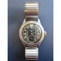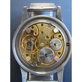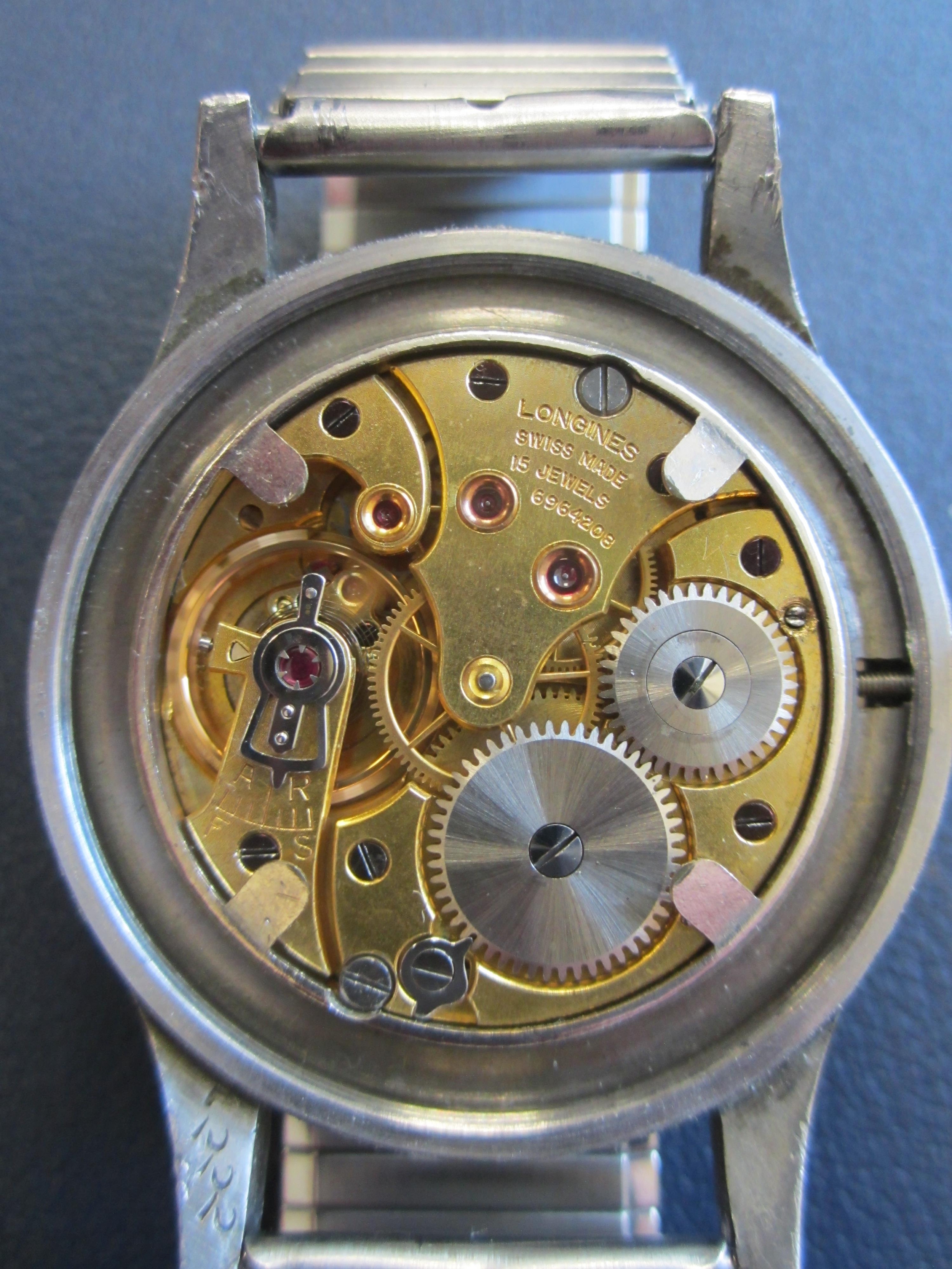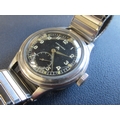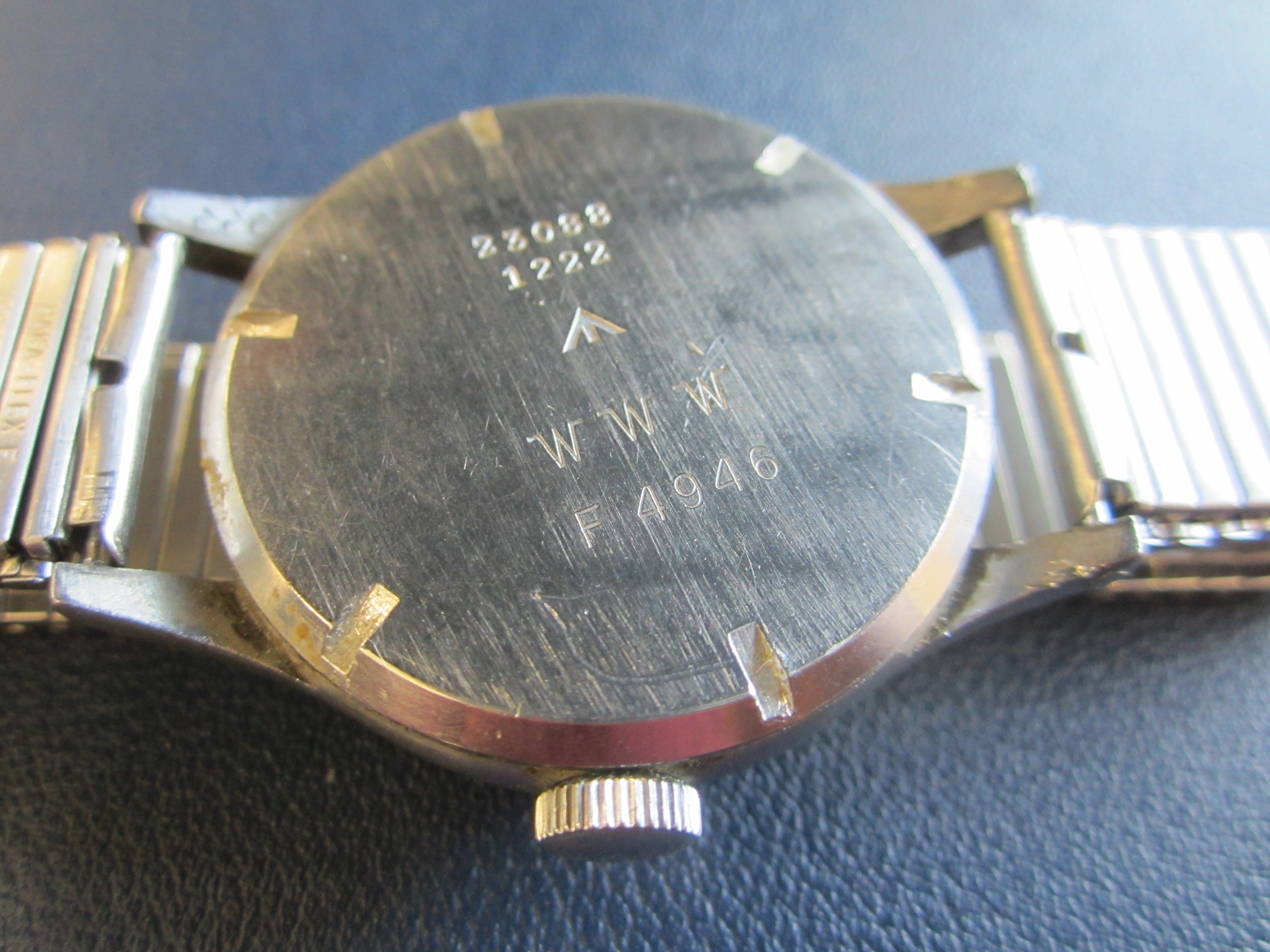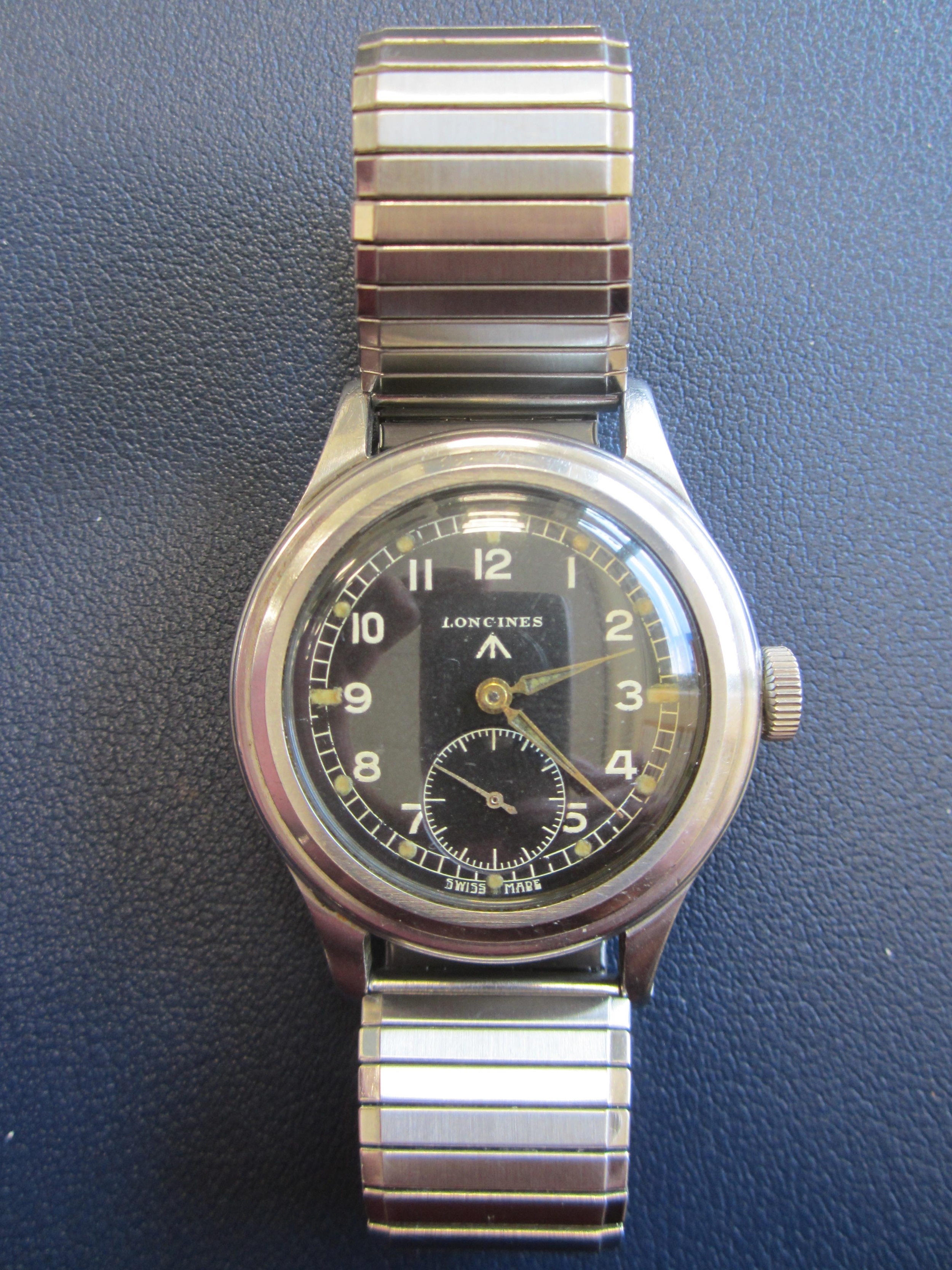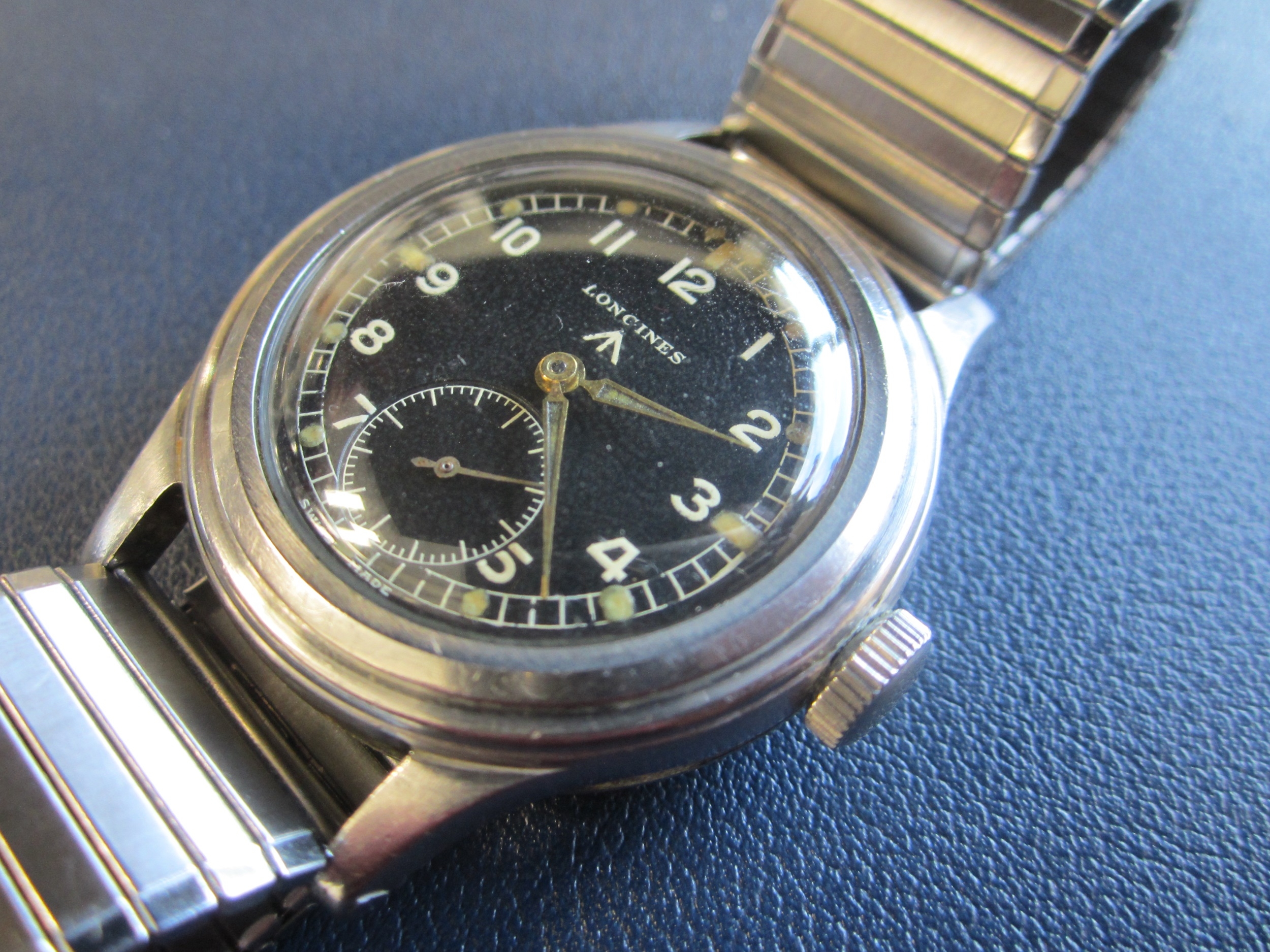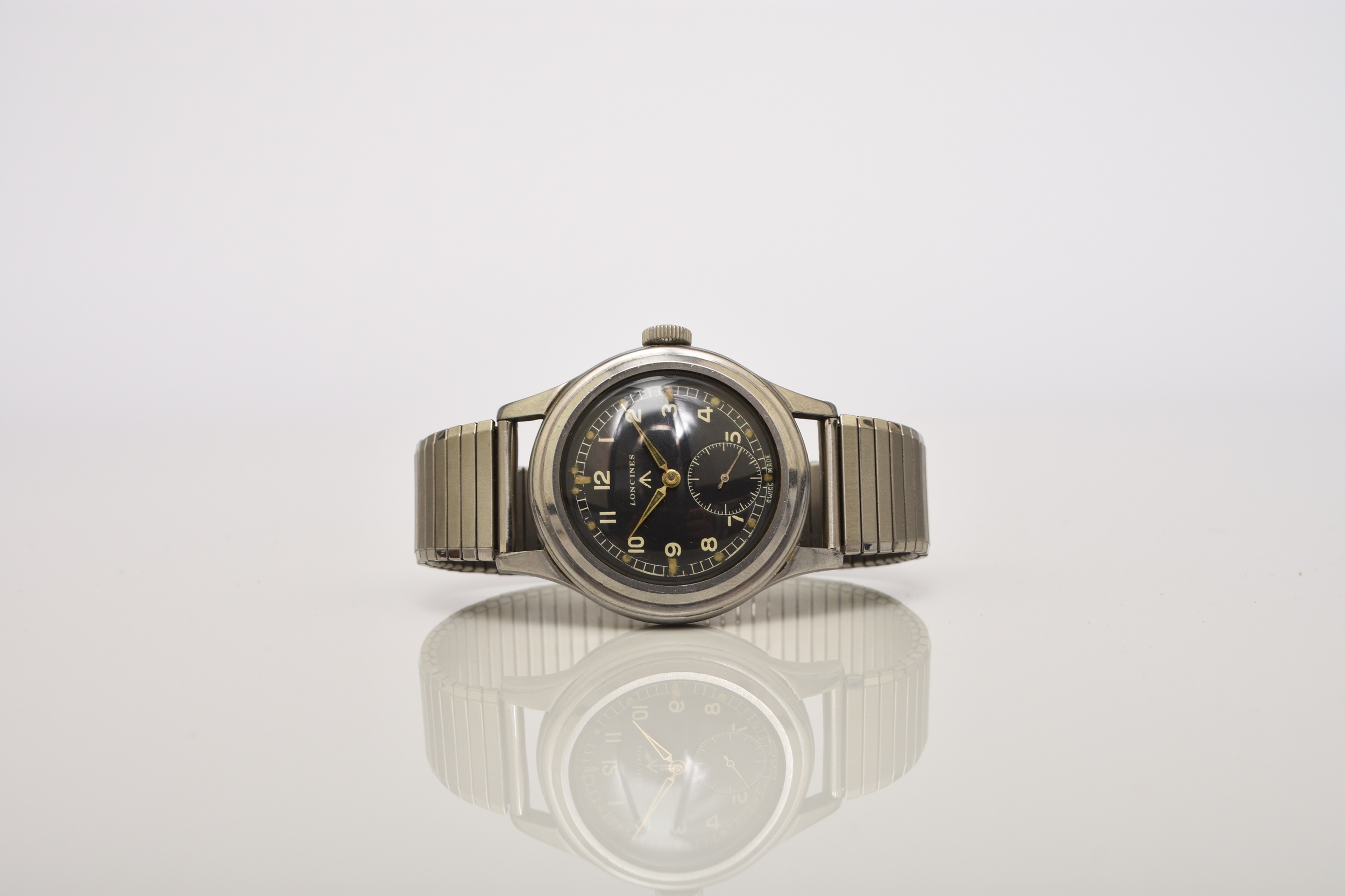 Longines: A stainless steel manual wind military issue wristwatch Model: Dirty Dozen Reference: 23088 Date: Circa 1945 Movement: Cal.12.68Z 15 jewel, manual, number 6964208 Dial: Black, Arabic hour markers with luminous dots, white outer minutes track, subsidiary seconds at 6, replacement polished gold pointed hands with luminous inserts Case: Brushed tonneau form, stepped bezel, pull-out crown, screw-down back engraved 23088/1222 ↑ WWW F4946 Strap/Bracelet: Associated stainless expanding bracelet Size: 37mm Footnote:During the Second World War the British Ministry of Defence commissioned 12 watch companies to produce watches that were fit for military action. These companies were Buren, Cyma, Eterna, Grana, Jaeger-LeCoultre, Lemania, Longines, IWC, Omega, Record, Timor, and Vertex. The term 'Dirty Dozen', after the 1967 film, has been coined to describe these watches. It is estimated that approximately 150,000 watches were produced with around 8,000 examples delivered by Longines. Each was stamped with the military broad arrow mark and the initials WWW standing for 'Watch, Wrist, Waterproof'. The Longines model has latterly become known as the ‘Greenlander’, although the watch was never issued for the British North Greenland Expedition and the name derives from an erroneous attribution in a military watch book, as the author believed that the model was worn by soldiers on this expedition. Condition:• Case and back: Micro-abrasions, small scratches and tiny dints, consistent with age and use. • Crystal: Some small scratches. • Dial: Fair to good with some tiny losses to print. Lume possibly re-touched. • Hands: Replacements - fair condition with tip of minute hand slightly bent. • Strap: Minor signs of wear. • Movement: Winds, sets and runs. Unless otherwise stated, all watches are likely to have been serviced and/or repaired in their lifetime and may have had parts replaced. While a watch may be described as 'working' at the time of the report, they are not guaranteed for timekeeping - it is advised that all watches are inspected and serviced by a qualified jeweller or horologist before full use.