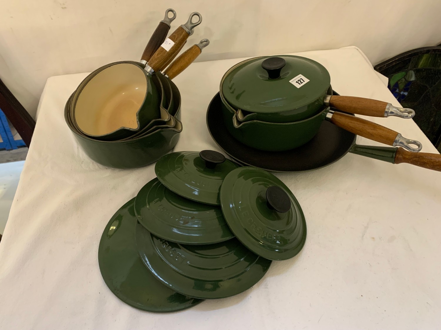 Qty of green Le Creuset saucepans and including 4 graduated saucepans with lids