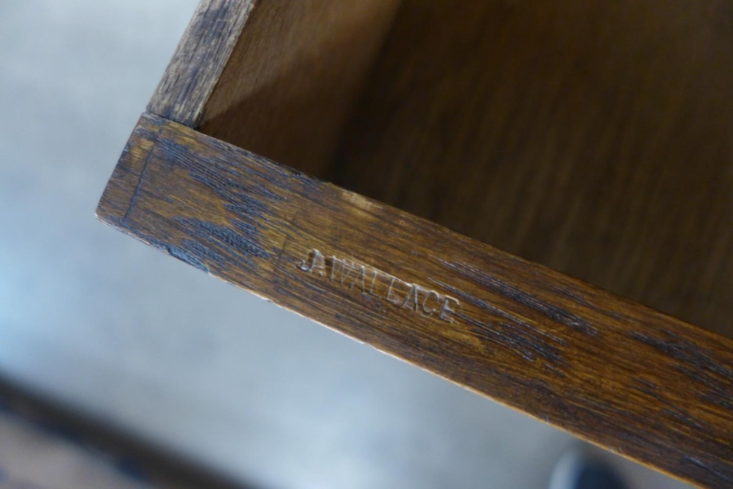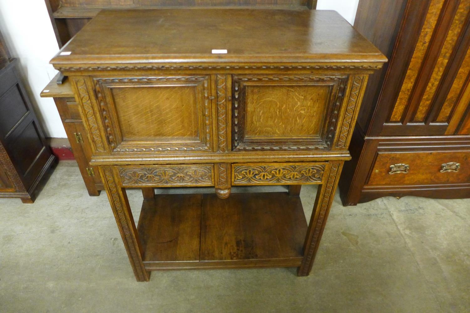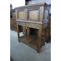 A 17th Century style carved oak credence cupboard on stand, signed J. Wallace, 112cms h, 88cms w, 44cms d
