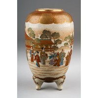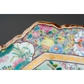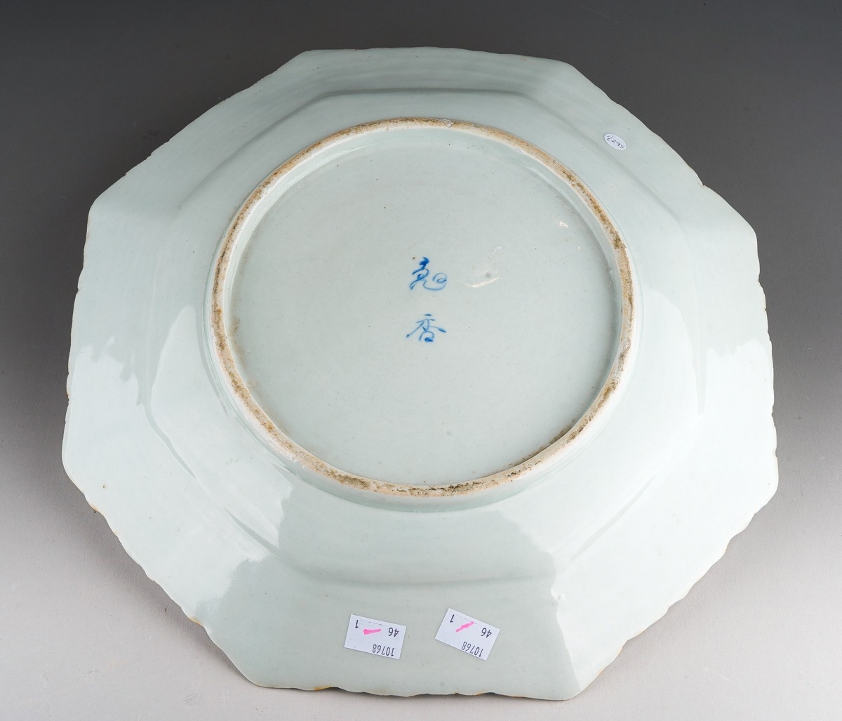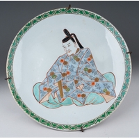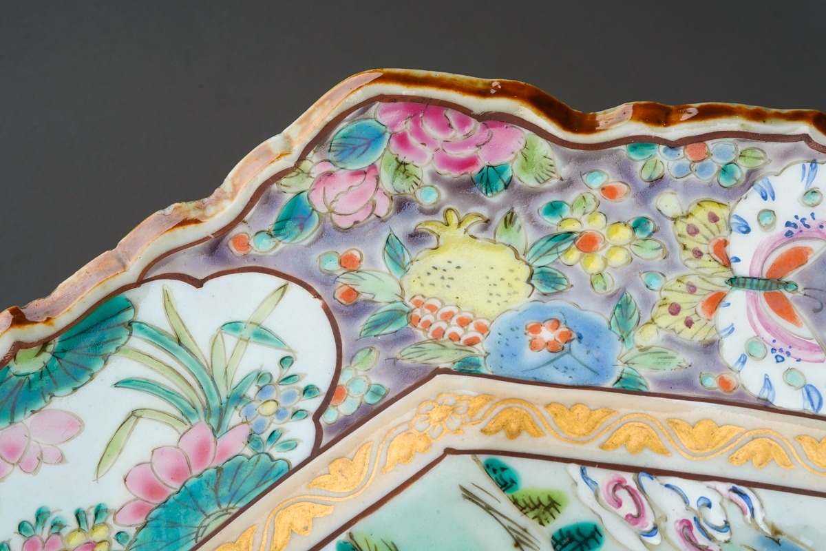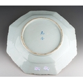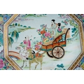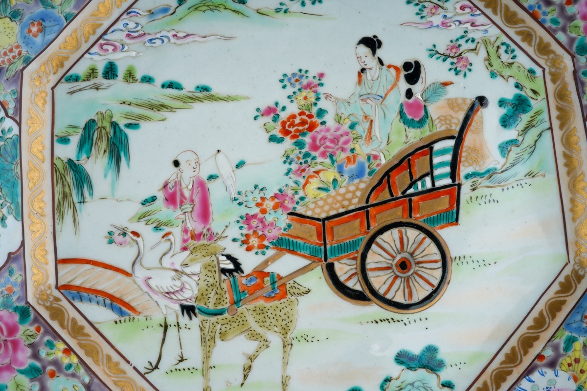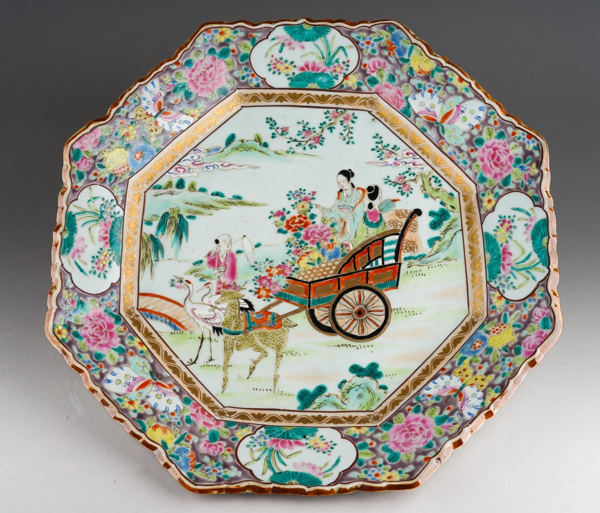 A Japanese famille rose octagonal plate (Meiji period, 1868 - 1912), wavy rim, deep border of flora and fauna surrounding the centre panel enamelled with two figures in a cart being drawn by a deer, man and cranes by a bridge, two blue character marks to underside, width 36cm