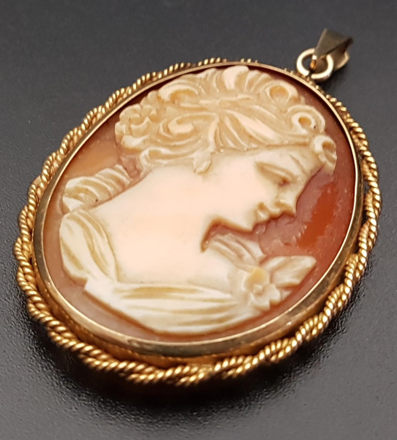 depicting a female bust in profile, in nine carat gold mount, approximately 5cm high (including suspension loop)
