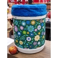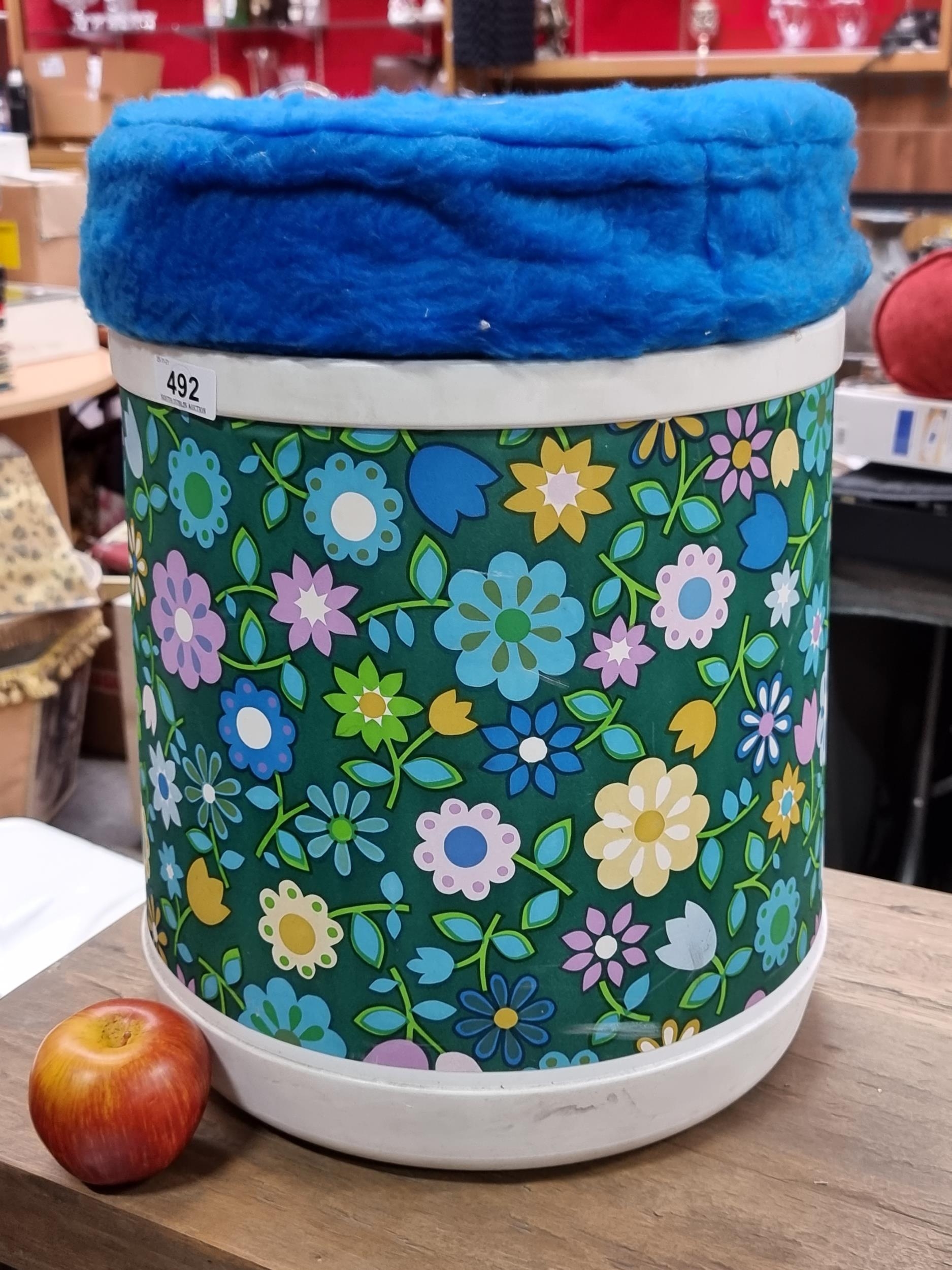 A 1970s Plysu Floral Laundry Basket with plush cushioned blue top. Fun, retro, kitsch piece in vibrant green and blue tones, can be used as a stool for additional seating.