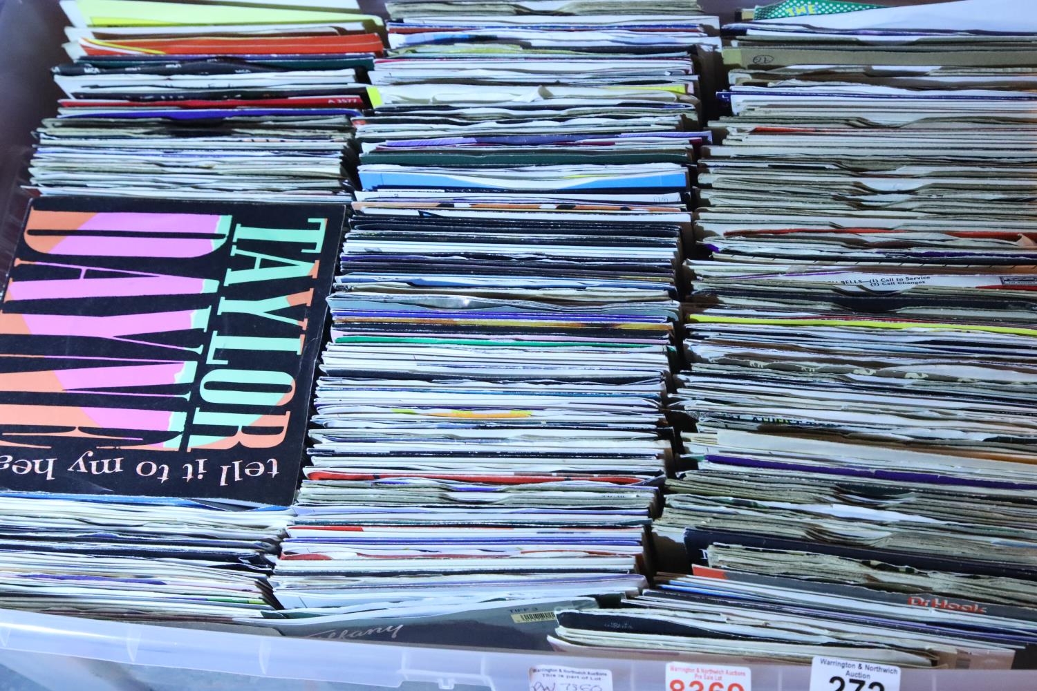 Box containing a large quantity of 7" singles including Salt N Pepa, Taylor Dayne etc. Not available for in-house P&P