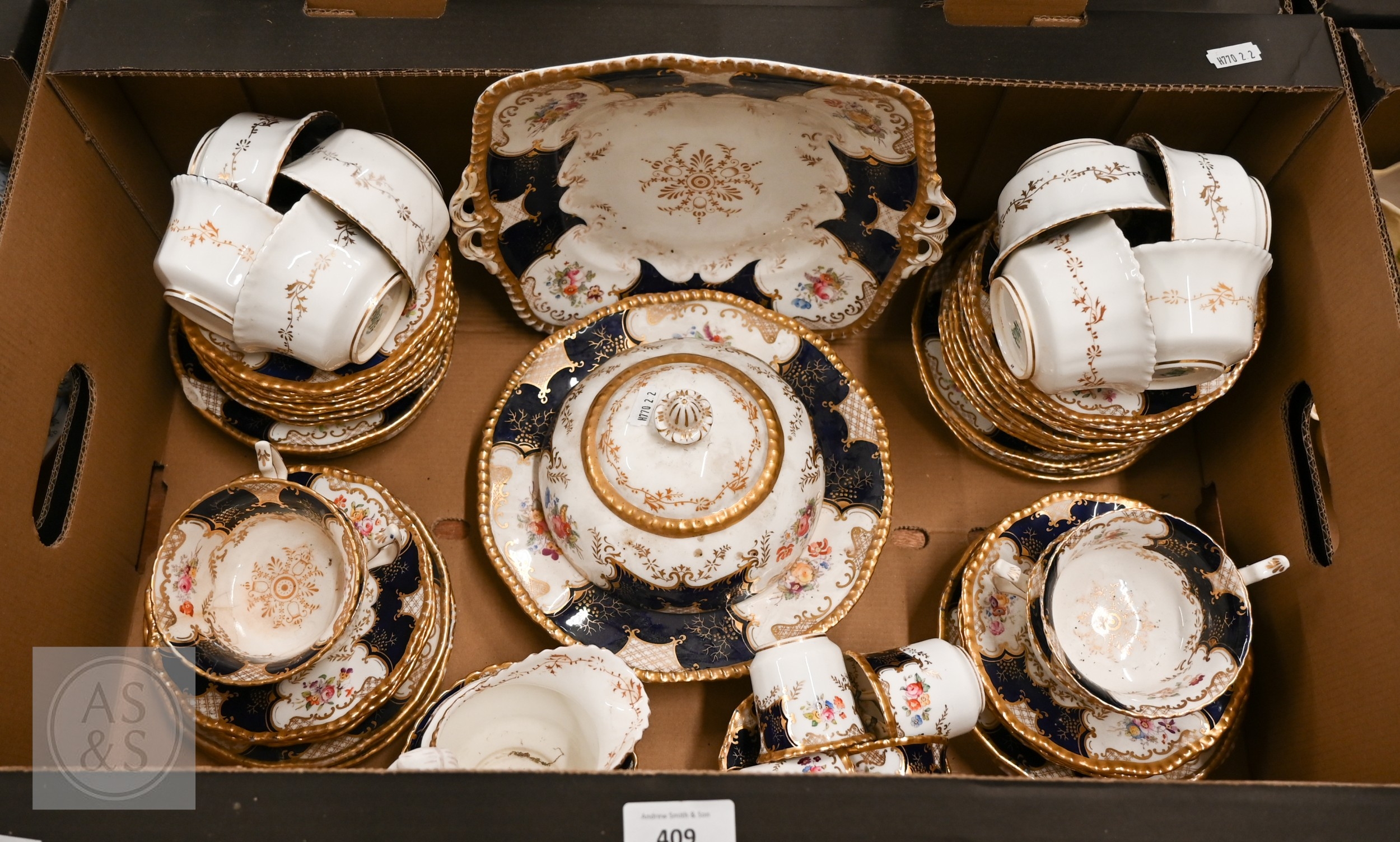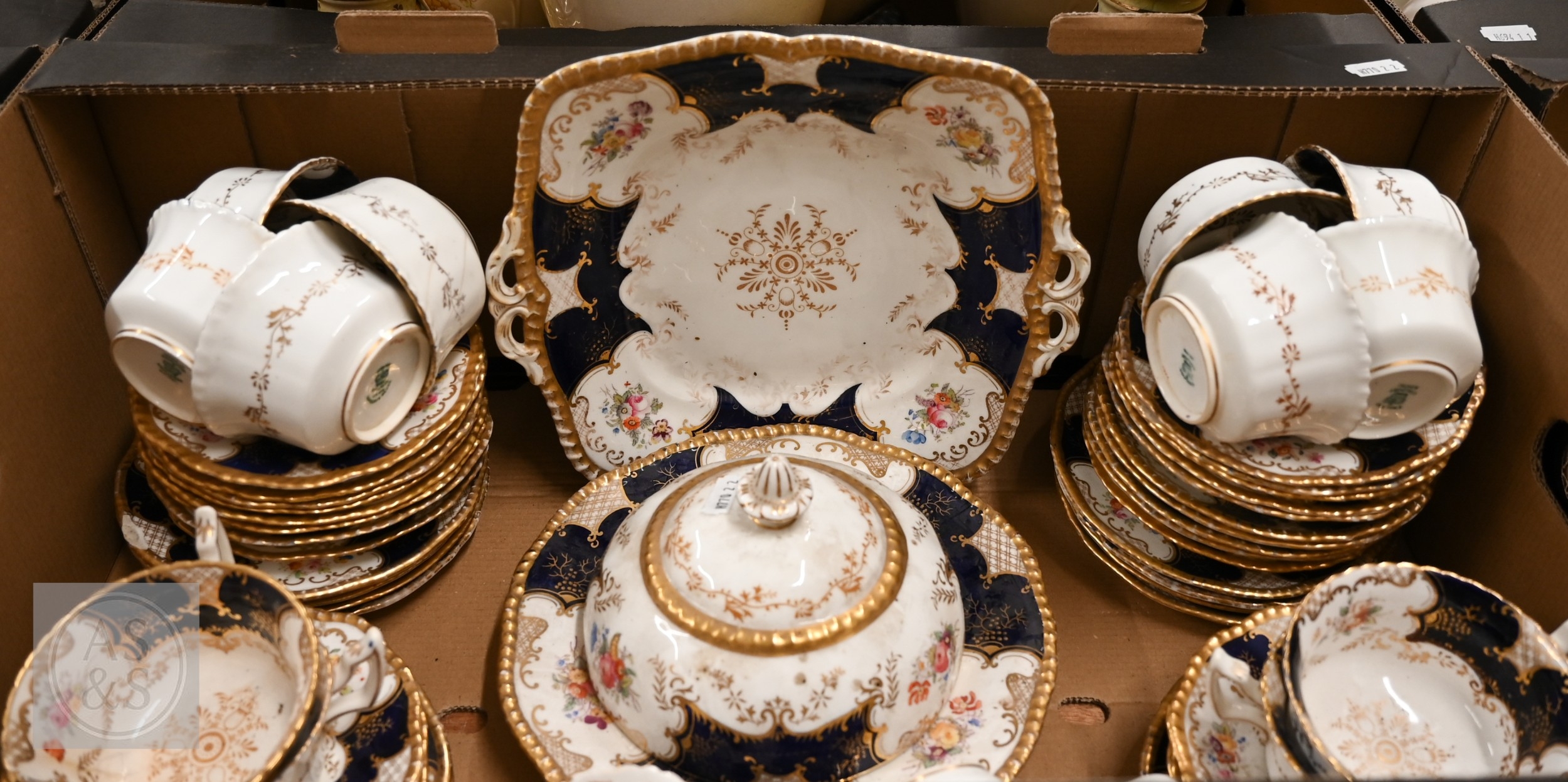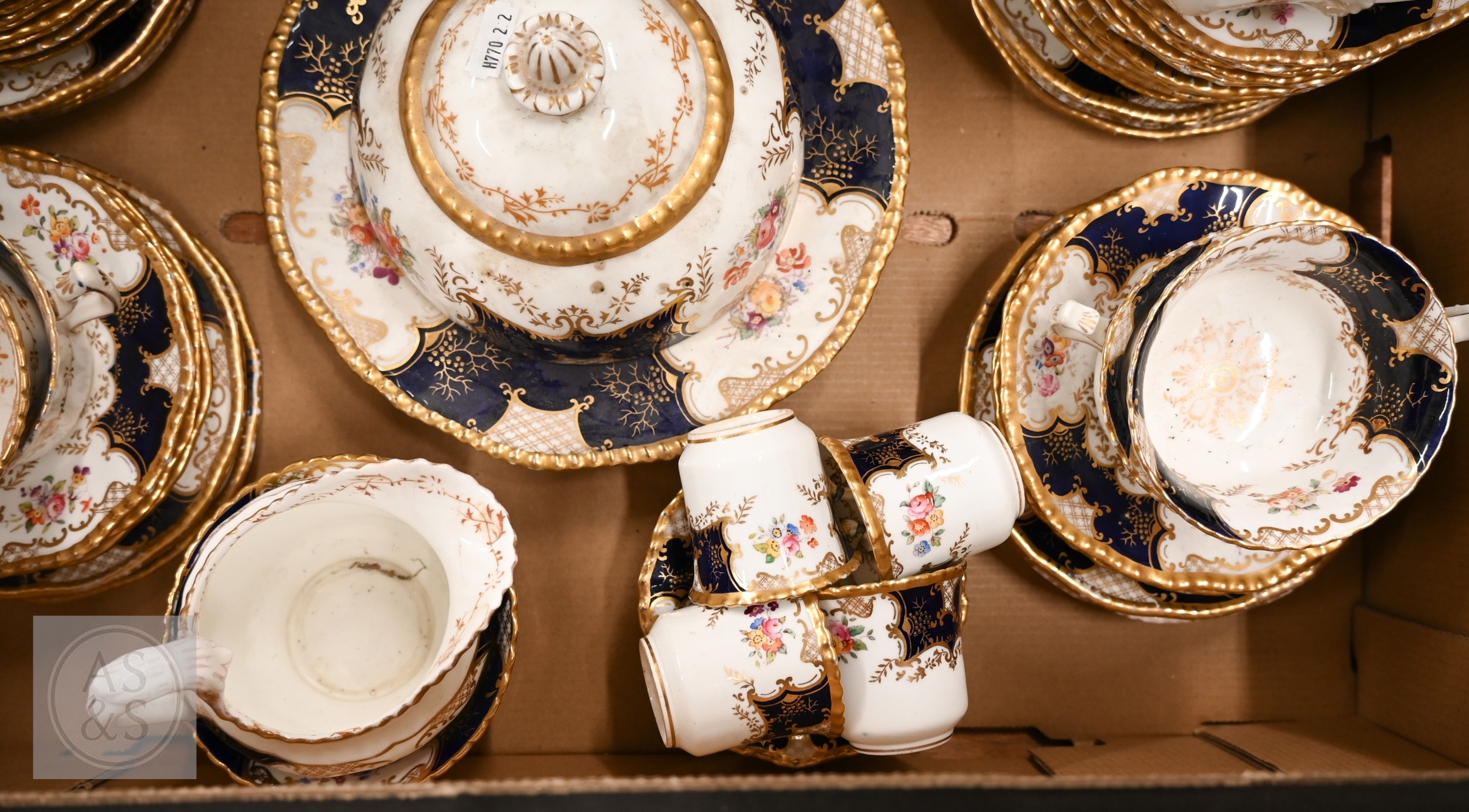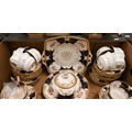 An Edwardian Coalport blue and gilt part tea/coffee service, printed and painted with floral sprays, 60 pieces (box)