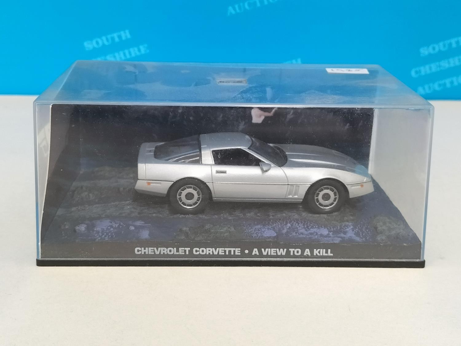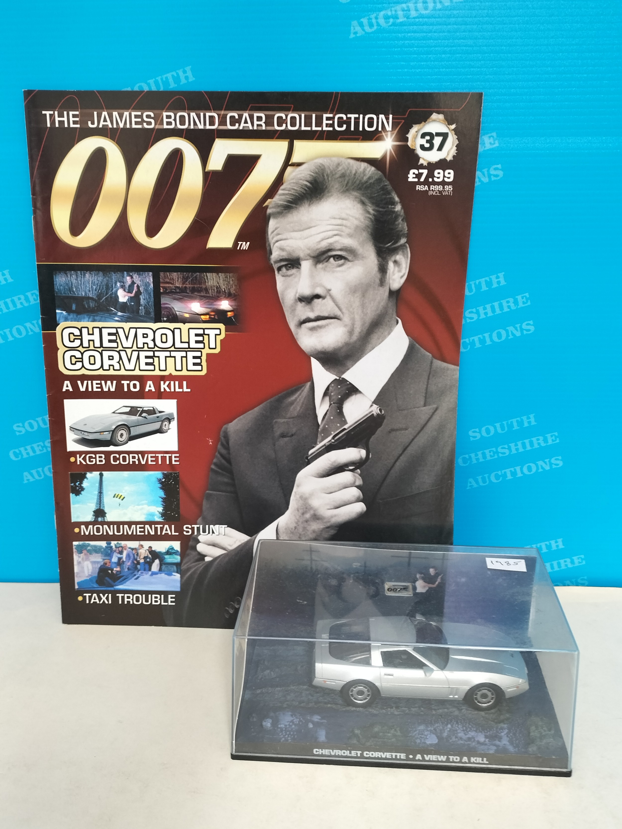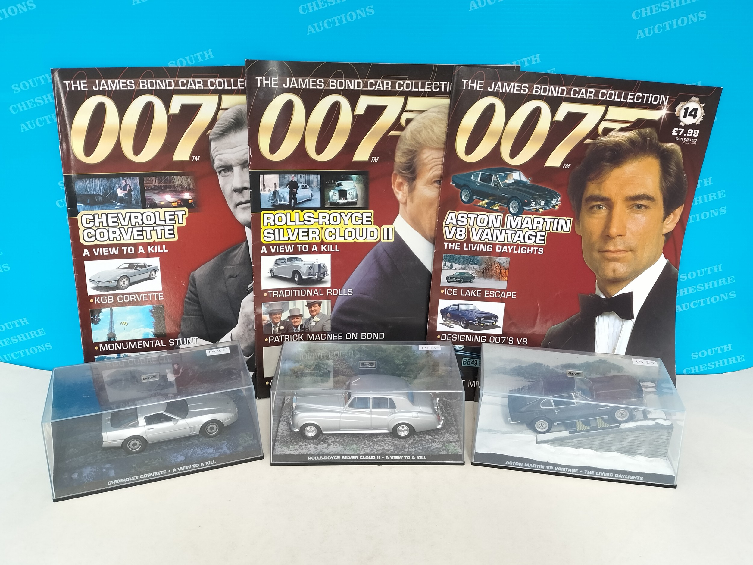 Eaglemoss James Bond 007 Cased Die-Cast Vehicles (3) with Magazines to include 1987 'The Living Daylights' Aston Martin V8 Vantage and 1985 'A View to a Kill' Rolls Royce Silver Cloud II and Chevrolet Corvette.