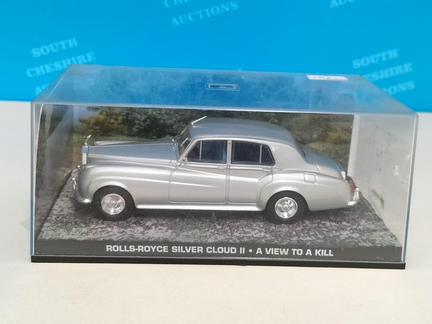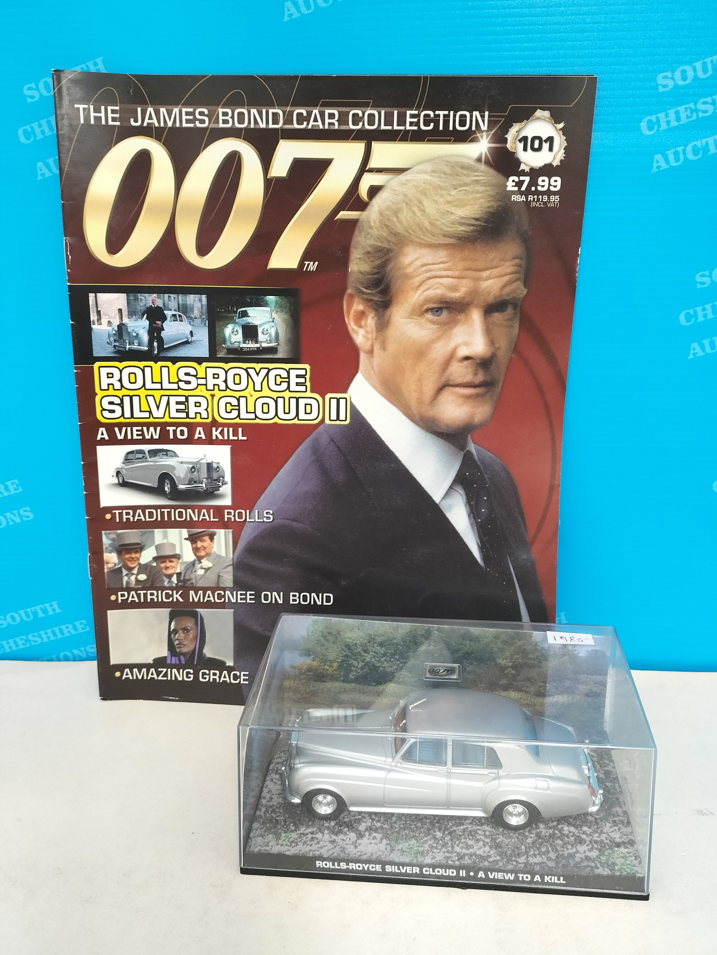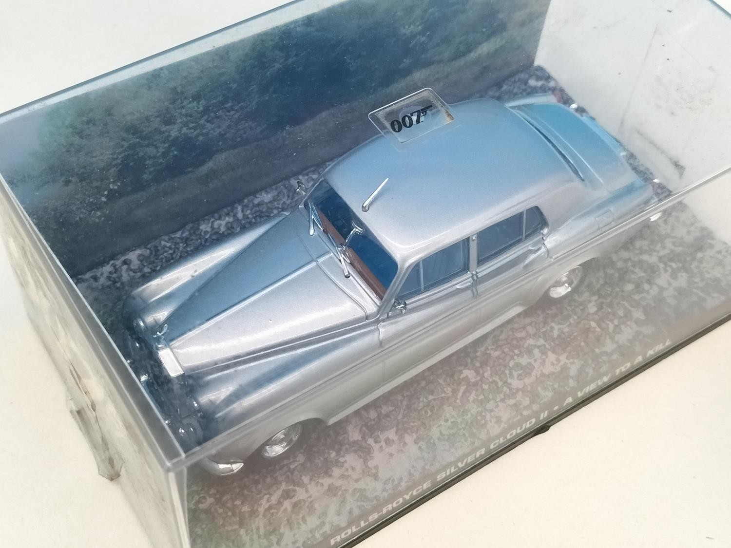 Eaglemoss James Bond 007 Cased Die-Cast Vehicles (3) with Magazines to include 1987 'The Living Daylights' Aston Martin V8 Vantage and 1985 'A View to a Kill' Rolls Royce Silver Cloud II and Chevrolet Corvette.