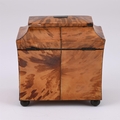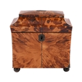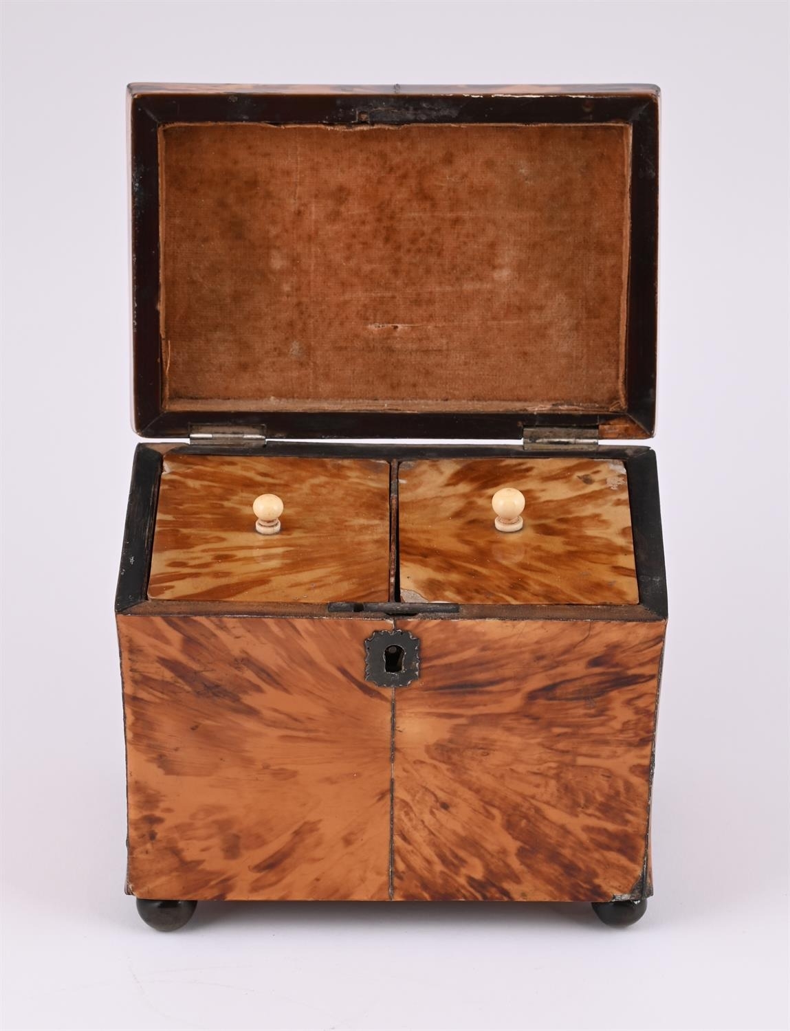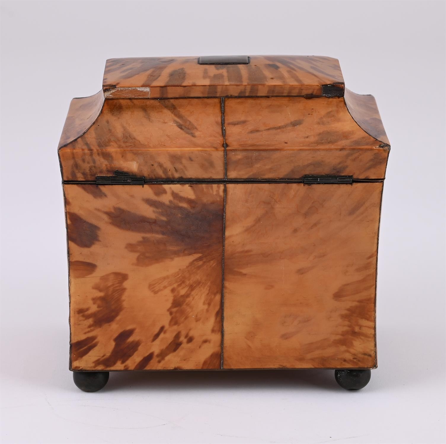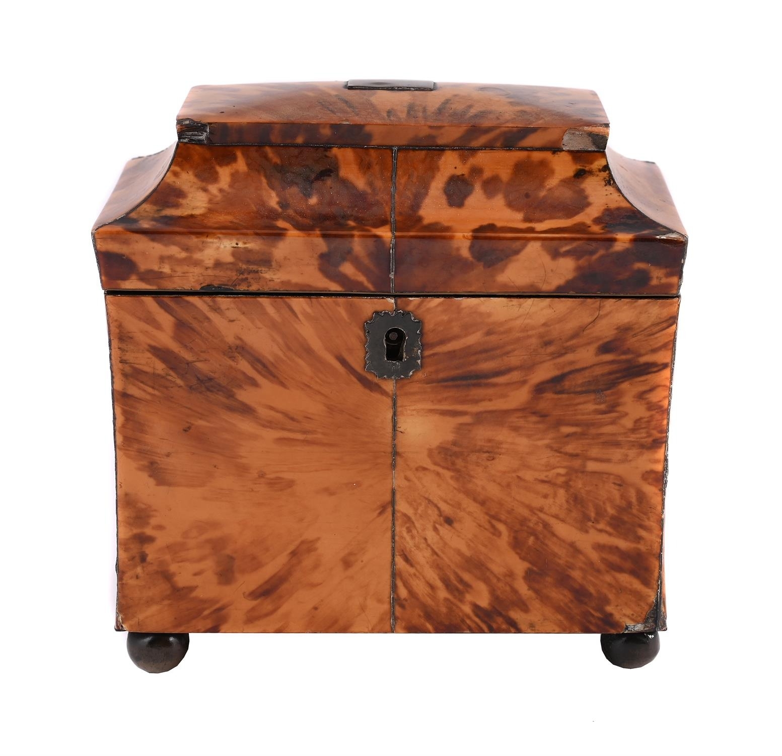 Y A GEORGE III TORTOISESHELL TEA CADDYLATE 18TH OR EARLY 19TH CENTURYWith two internal lidded compartments 16cm high, 16cm wide, 10.5 cm deep