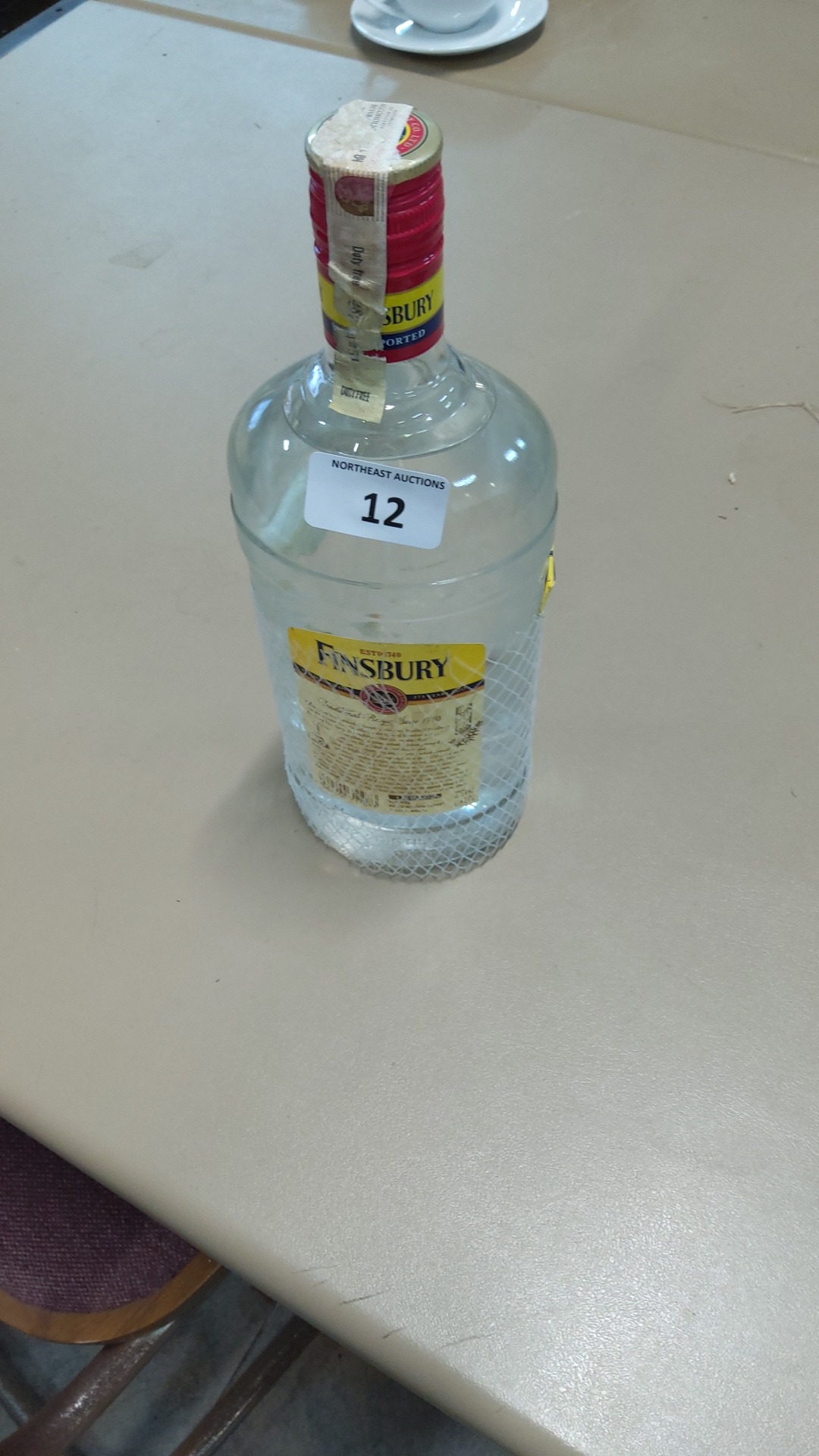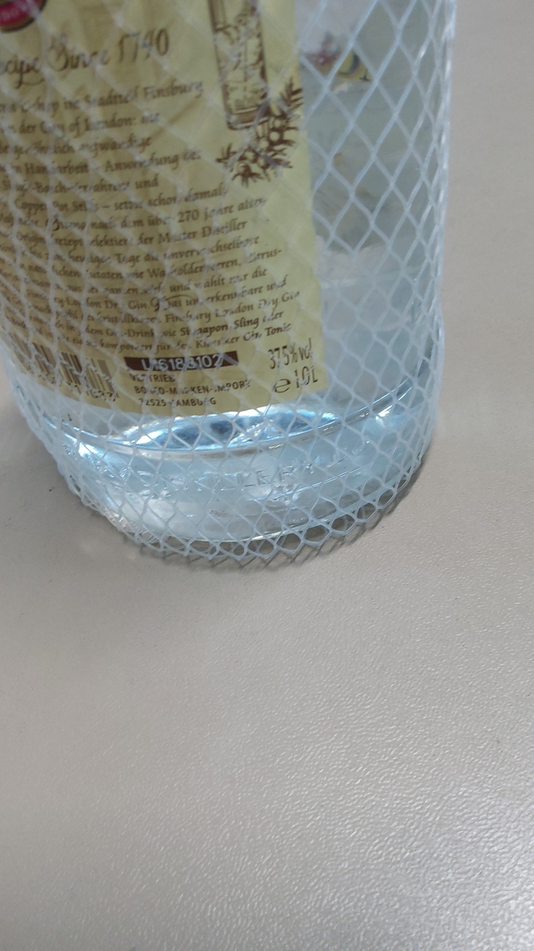 Unopened 1-litre bottle of Finsbury London Dry Gin, 37.5 % ABV, presented in protective net sleeve.