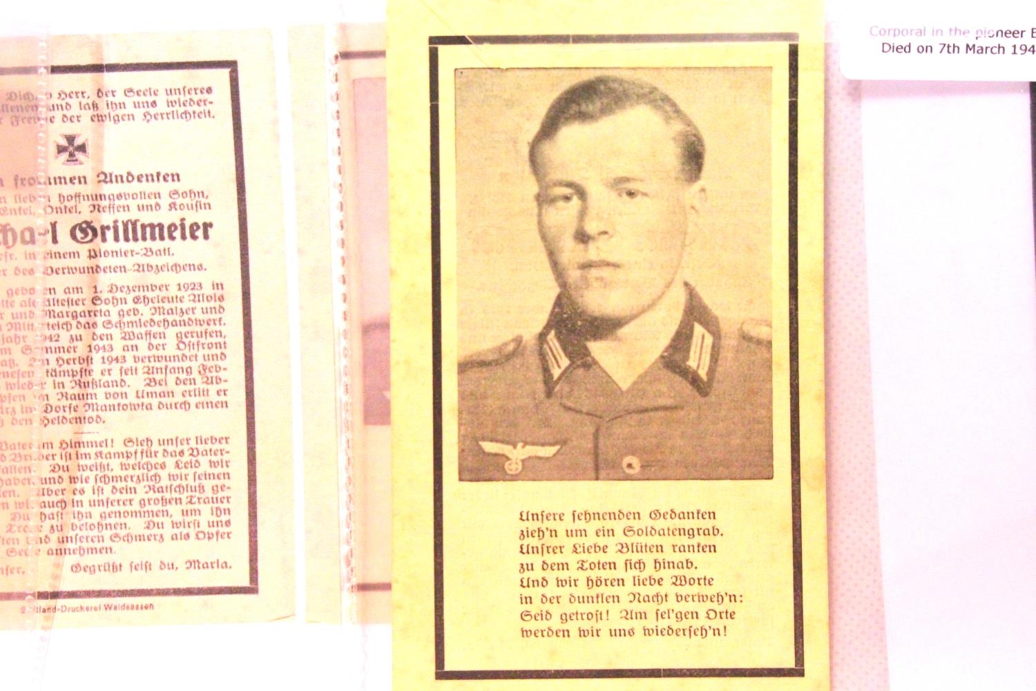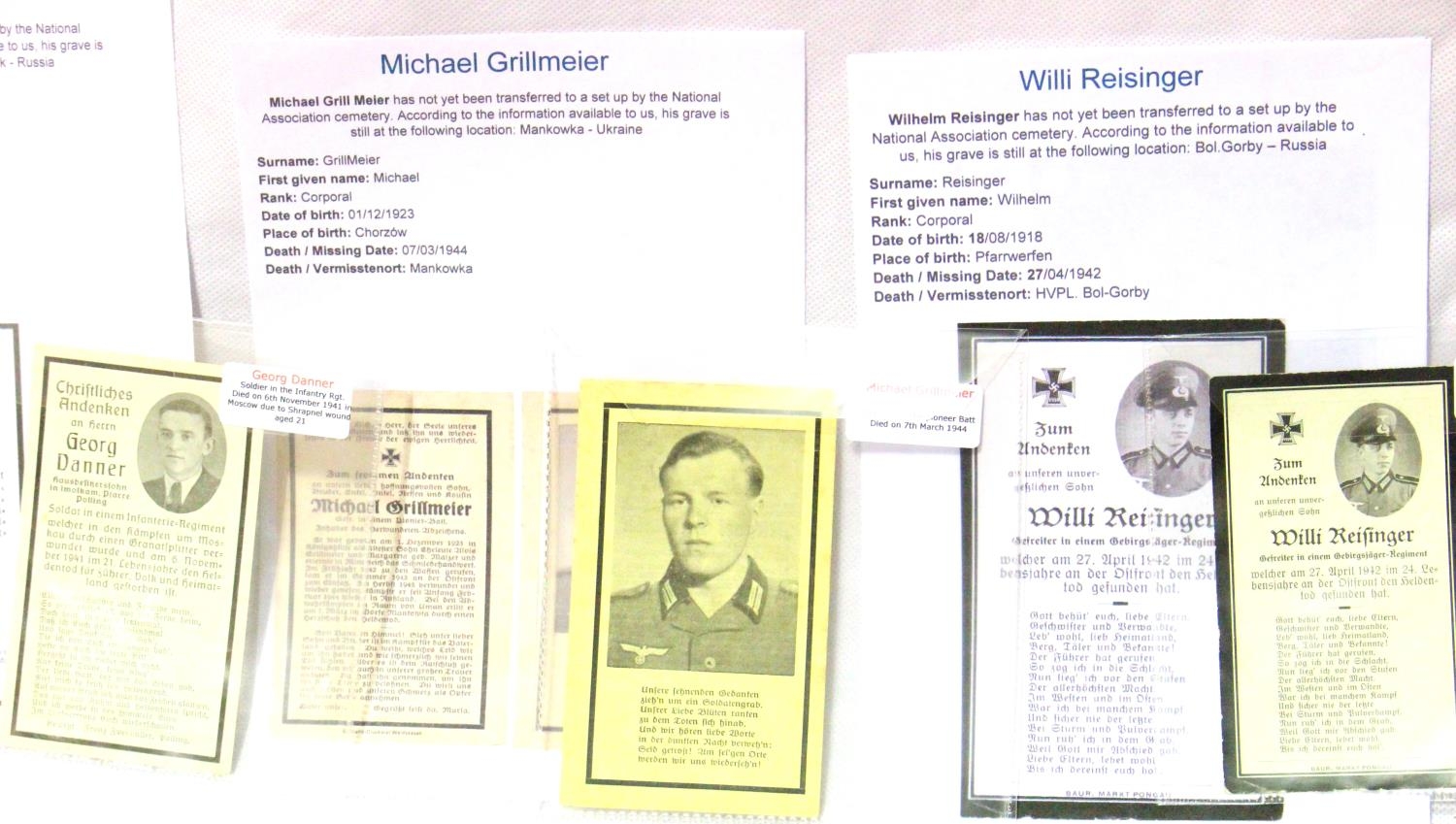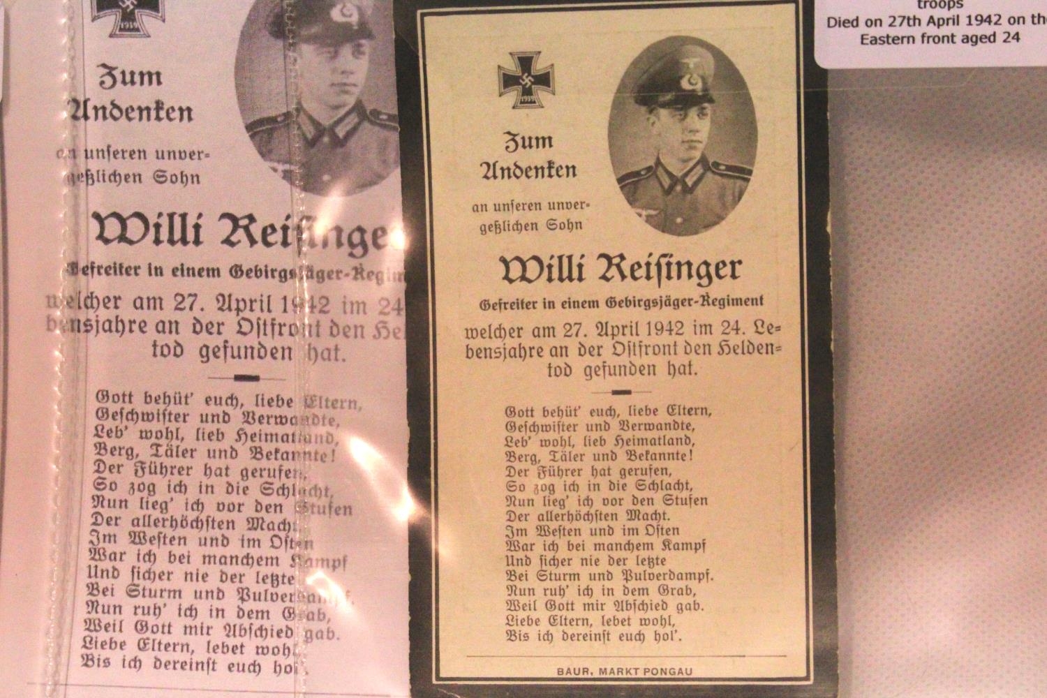 Three German WWII wartime obituary notice cards, relating to Wilhelm Reisinger, Michael Grillmeier and Georg Danner, with information. P&P Group 1 (£14+VAT for the first lot and £1+VAT for subsequent lots)