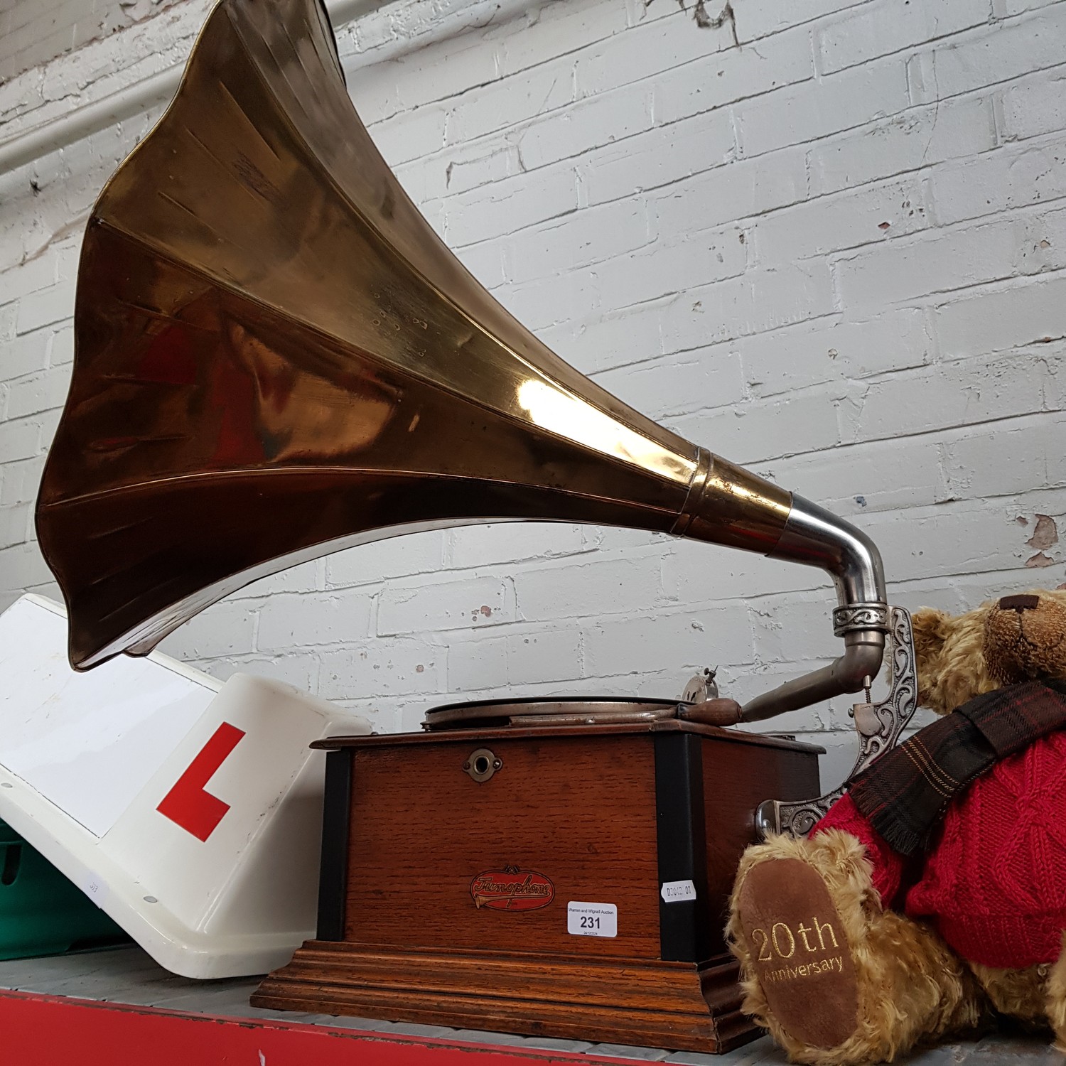 A Junophone oak cased gramophone with brass trumpet.