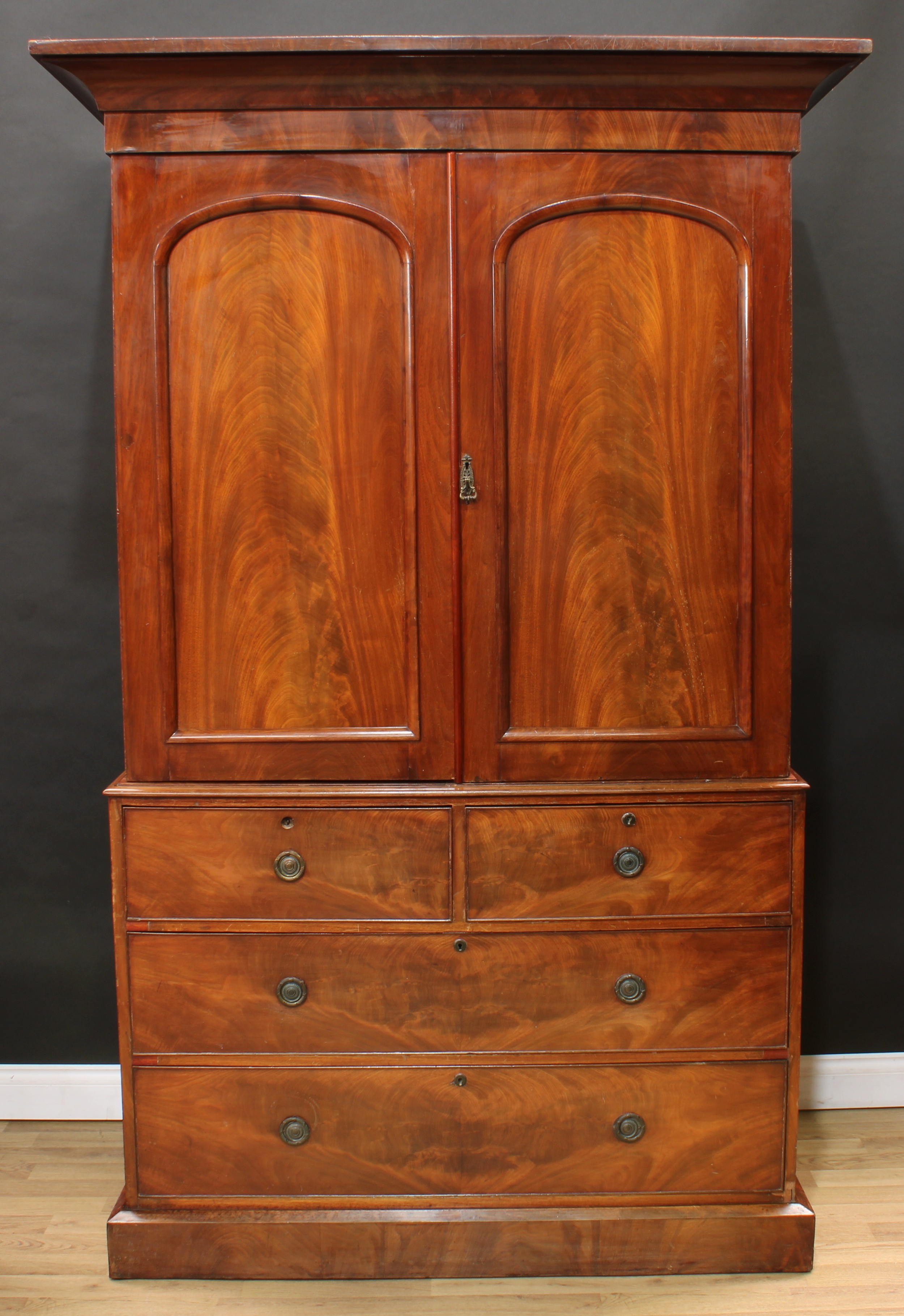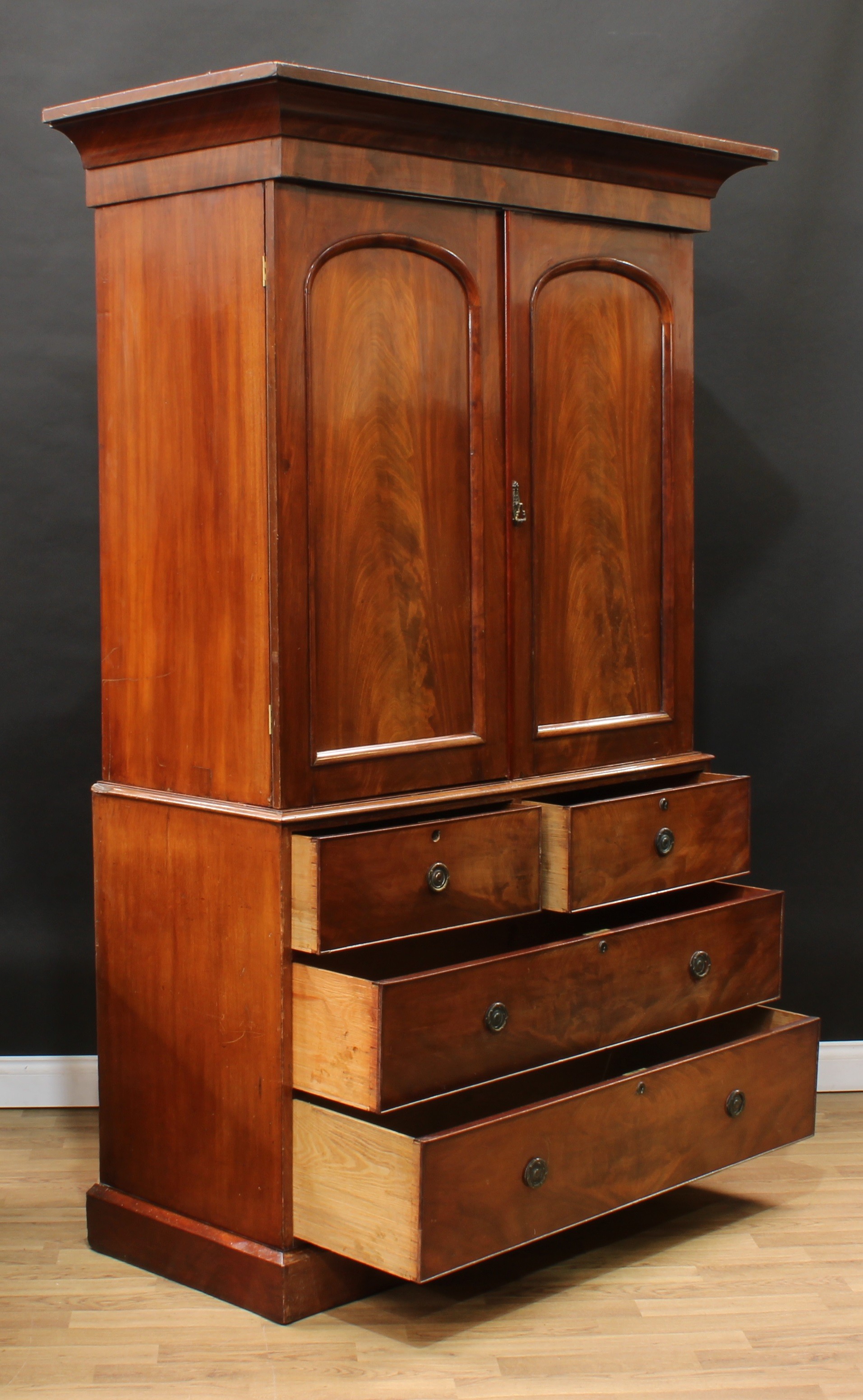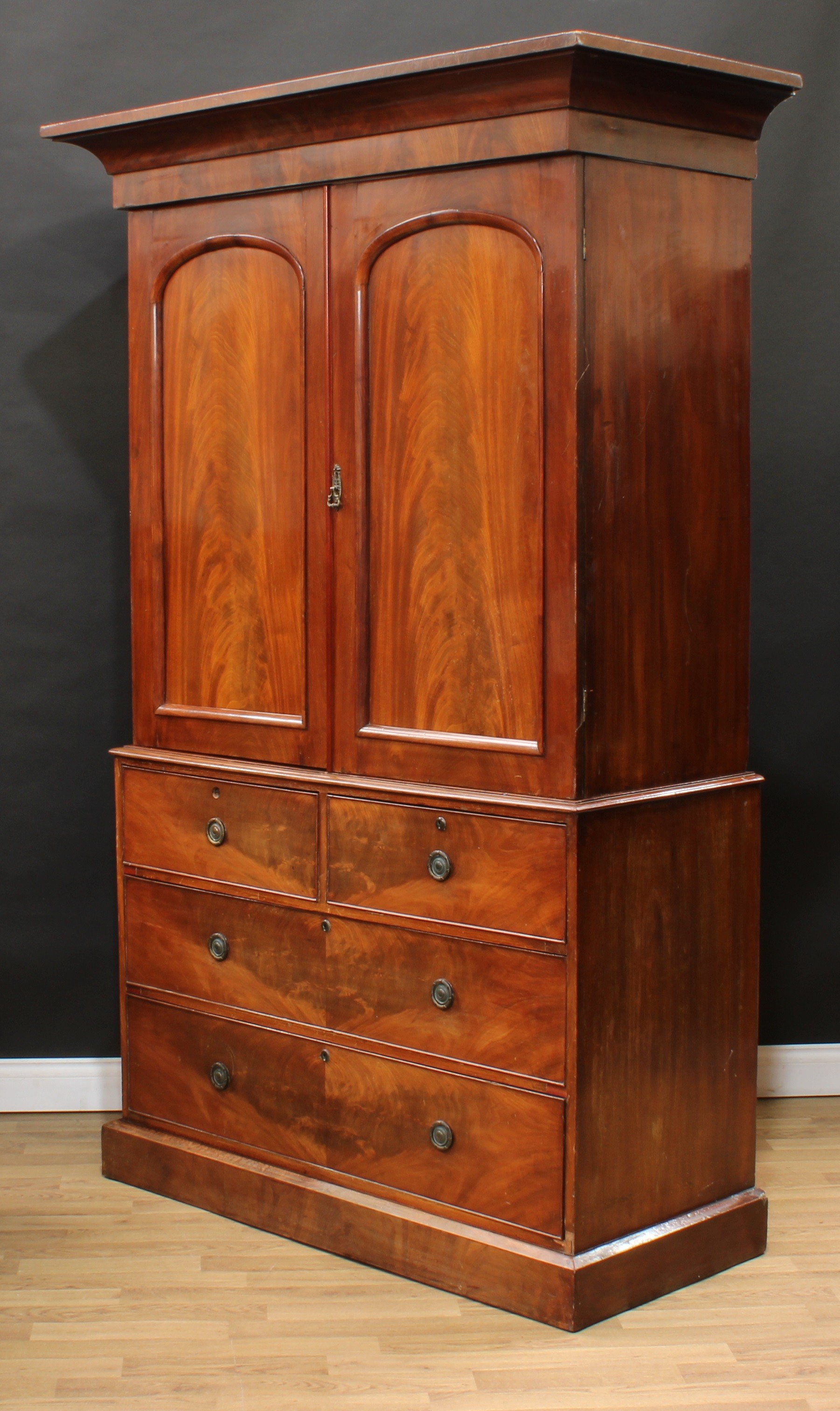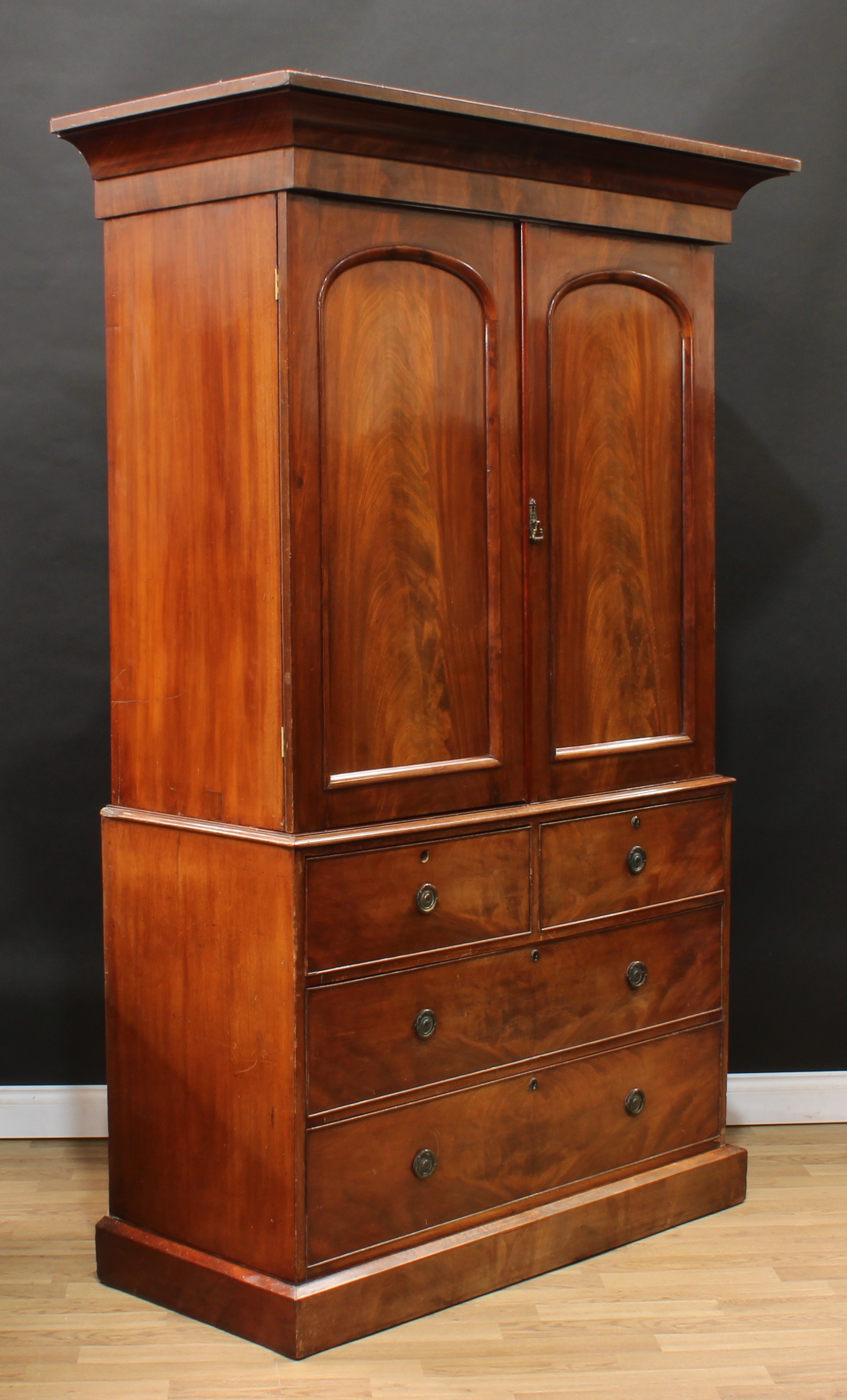 A Victorian mahogany linen press, concave moulded cornice above a pair of arched panel doors enclosing four sliding trays, the base with two short over two long drawers, ring handles, circular draught-pressed escutcheons, plinth base, 213cm high, 137cm wide, 63.5cm deep