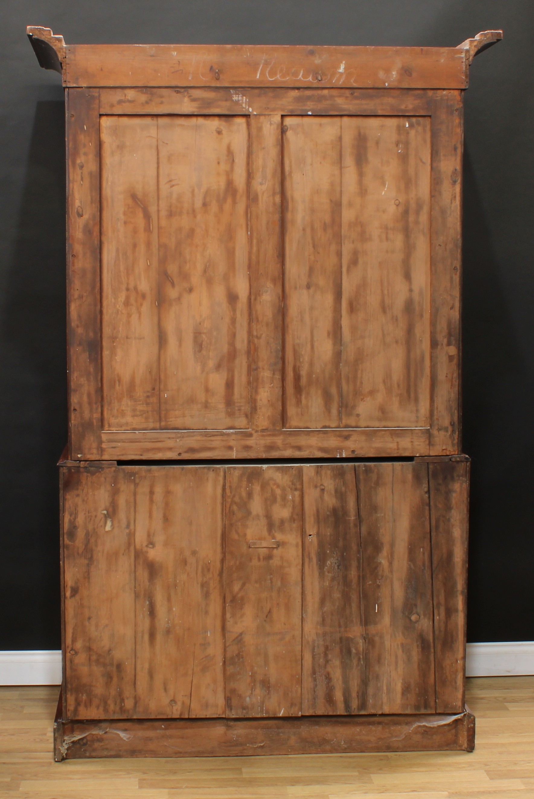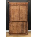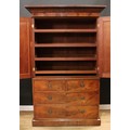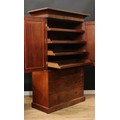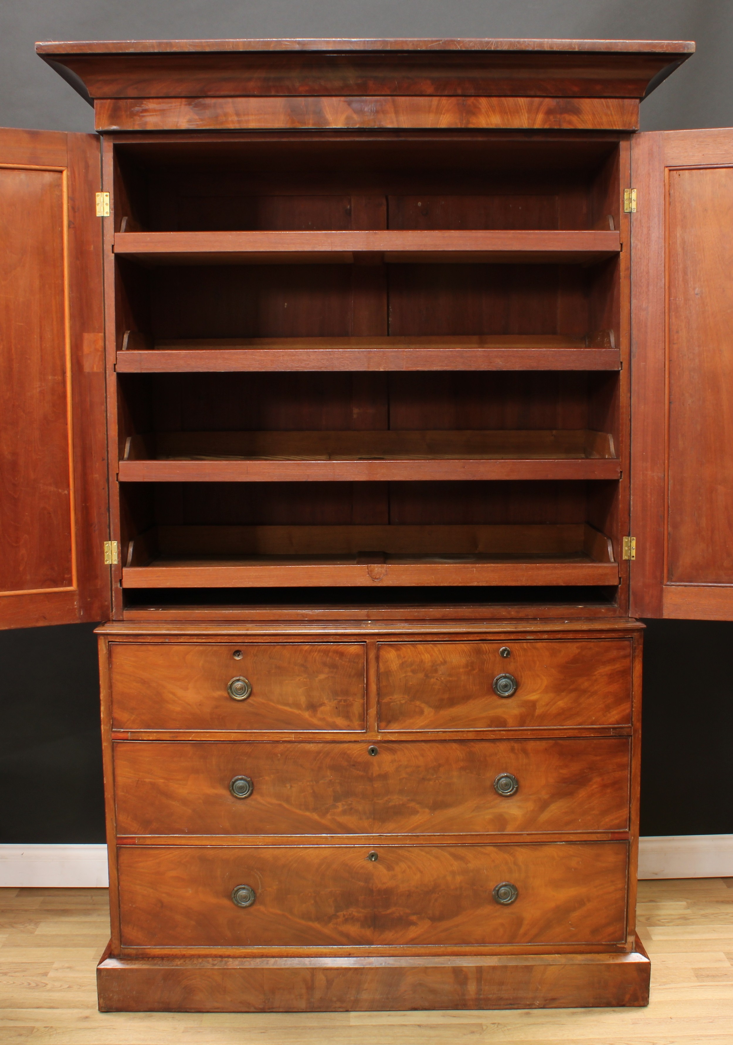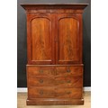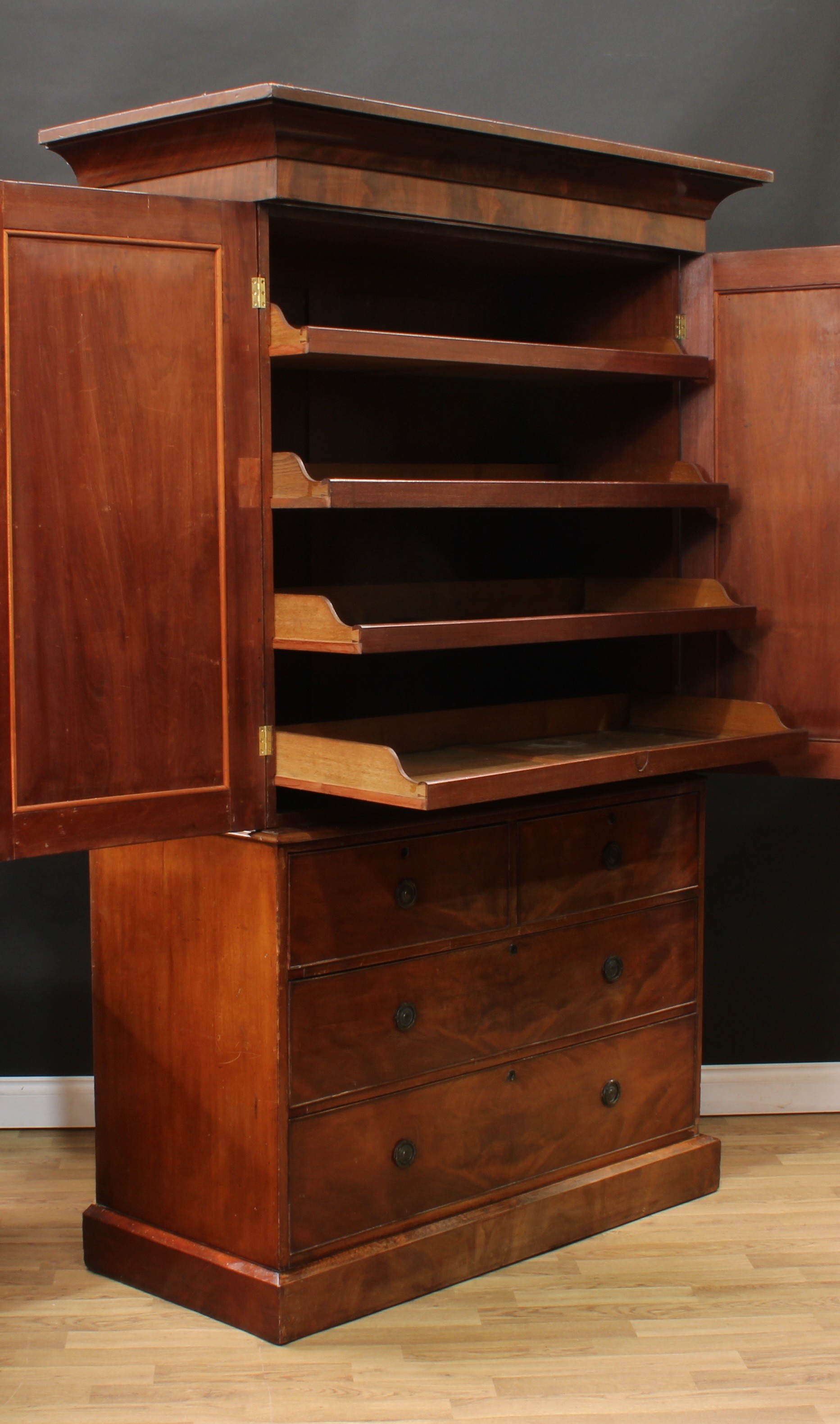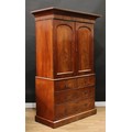 A Victorian mahogany linen press, concave moulded cornice above a pair of arched panel doors enclosing four sliding trays, the base with two short over two long drawers, ring handles, circular draught-pressed escutcheons, plinth base, 213cm high, 137cm wide, 63.5cm deep