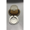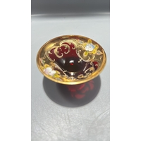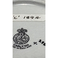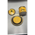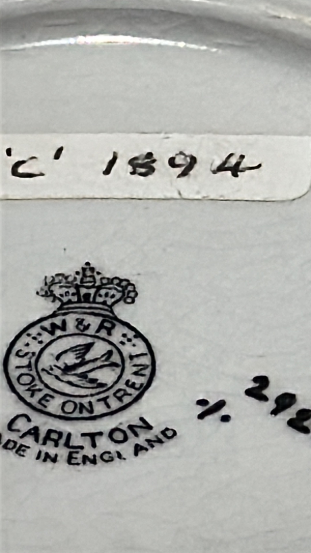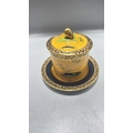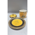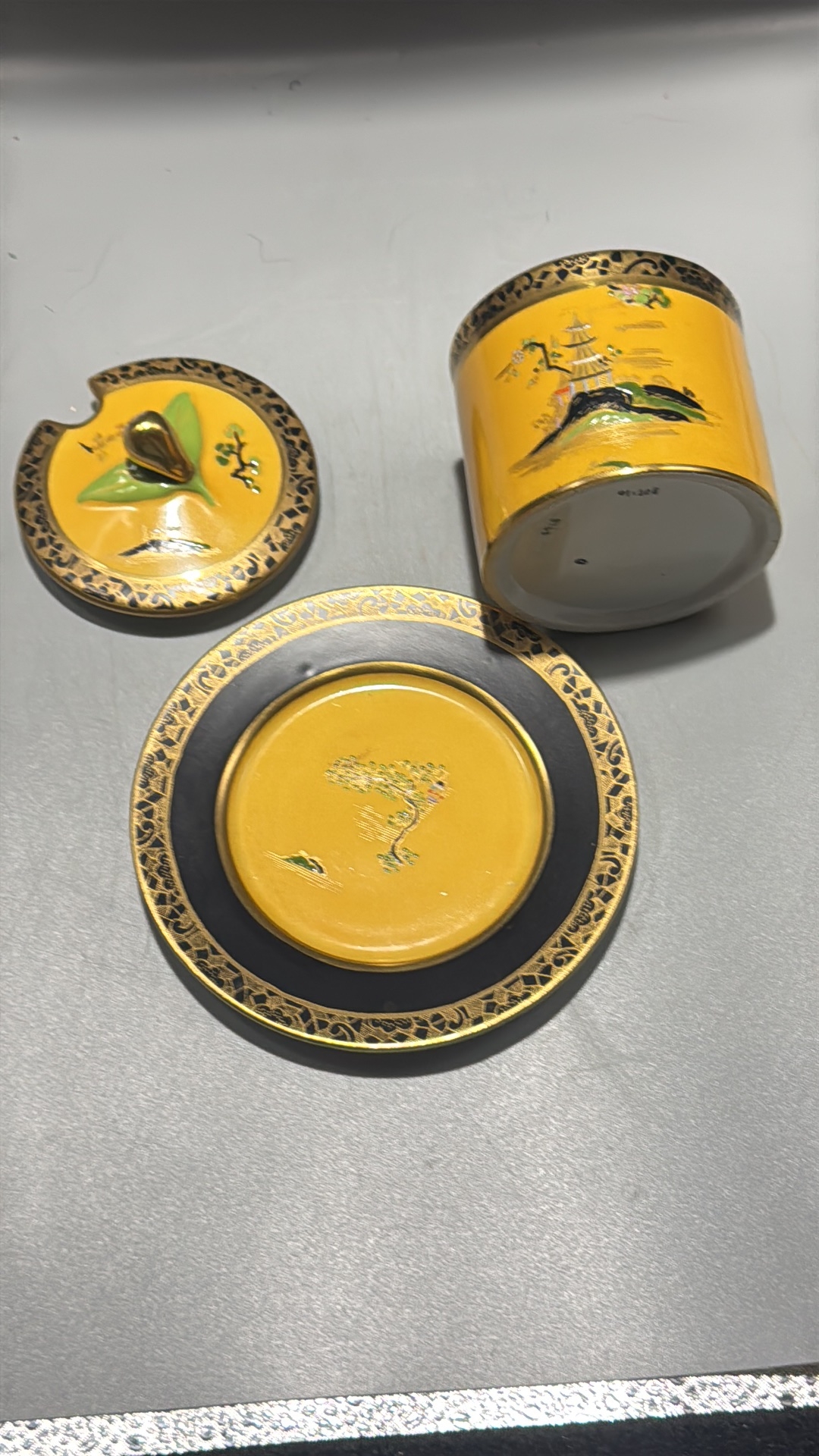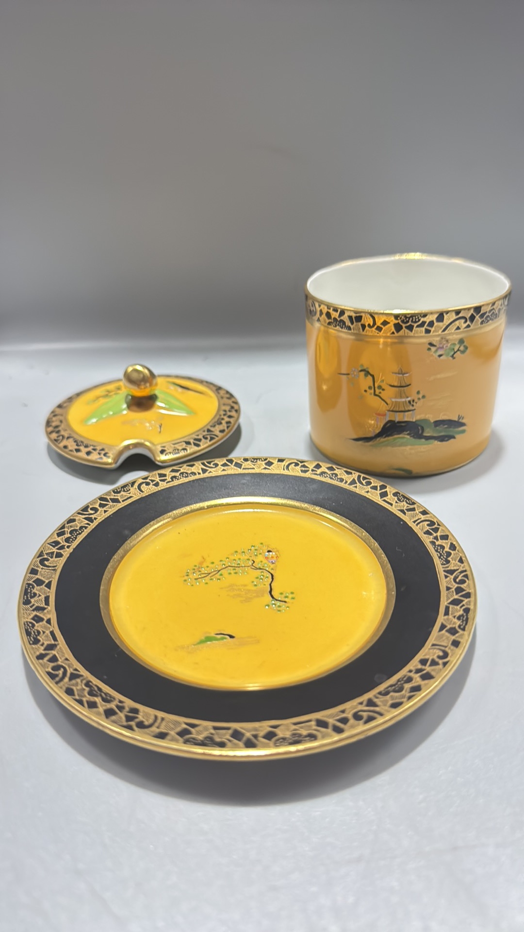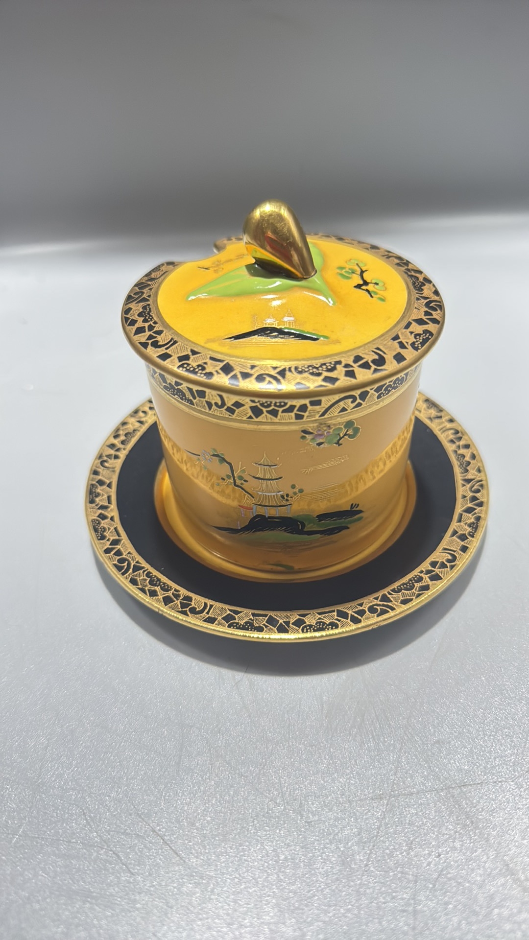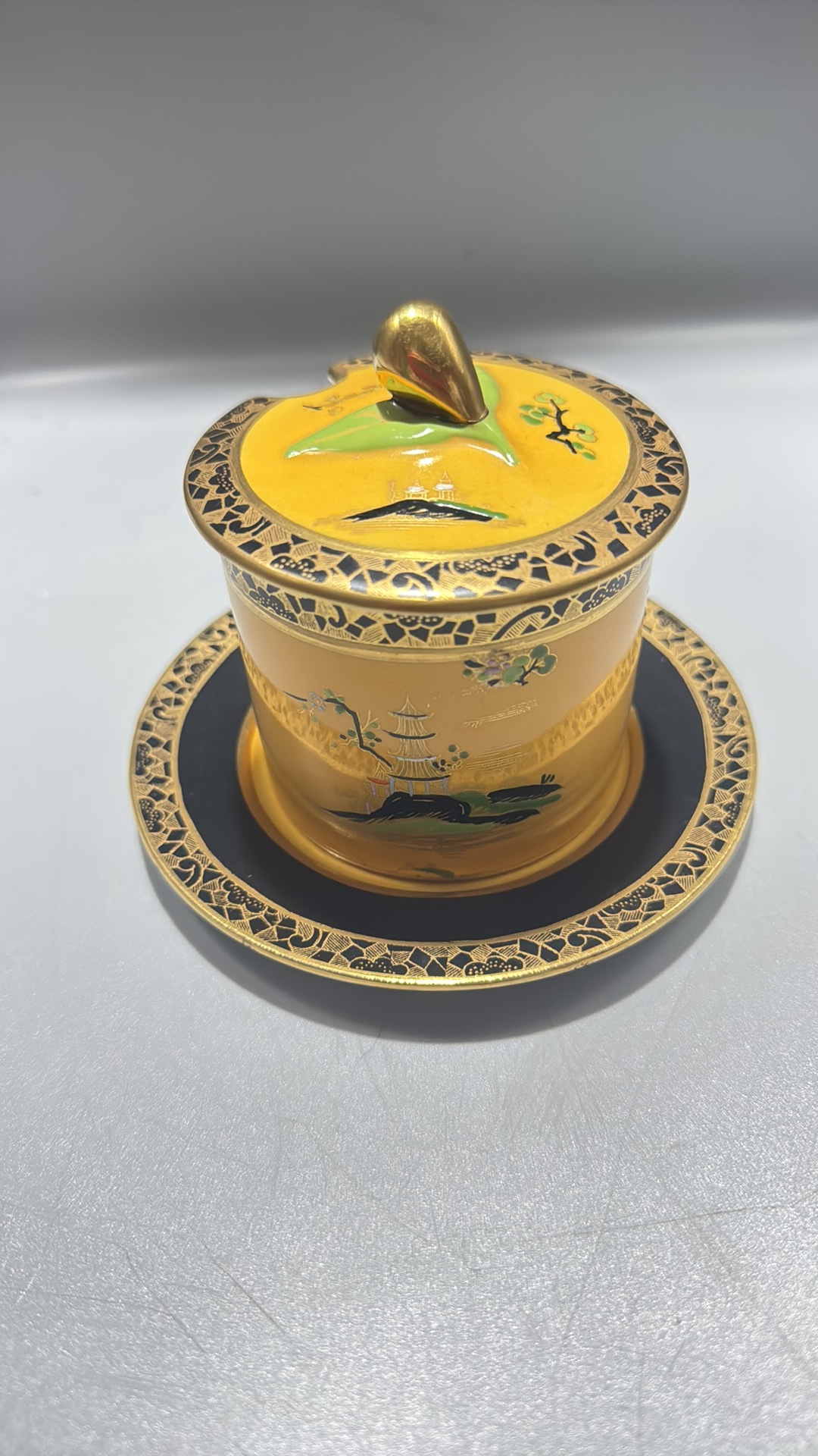 Carlton Ware preserve pot and matching saucer, hand-painted pagoda, tree and landscape chinoiserie, black and gilt geometric borders. Founded in 1890 by Wiltshaw & Robinson in Stoke-on-Trent, Carlton Ware became renowned for vibrant lustre glazes and Art Deco chinoiserie wares, popular through the 1920s-50s.