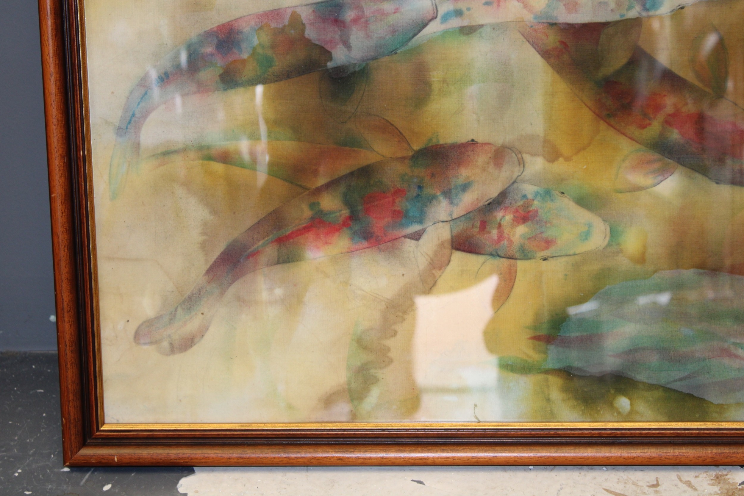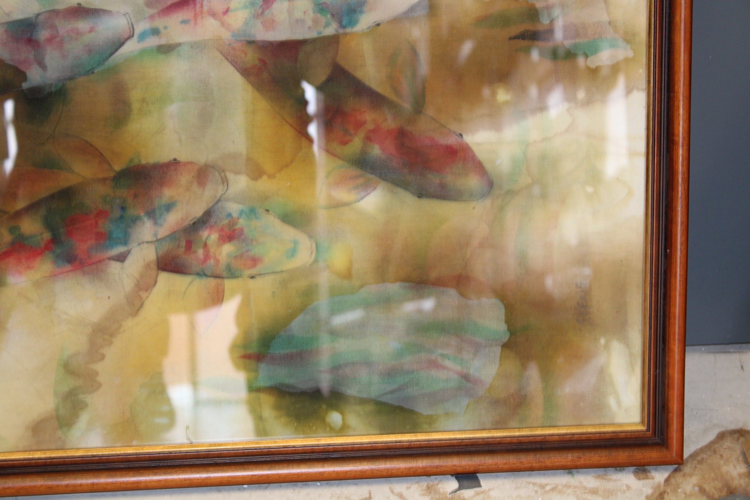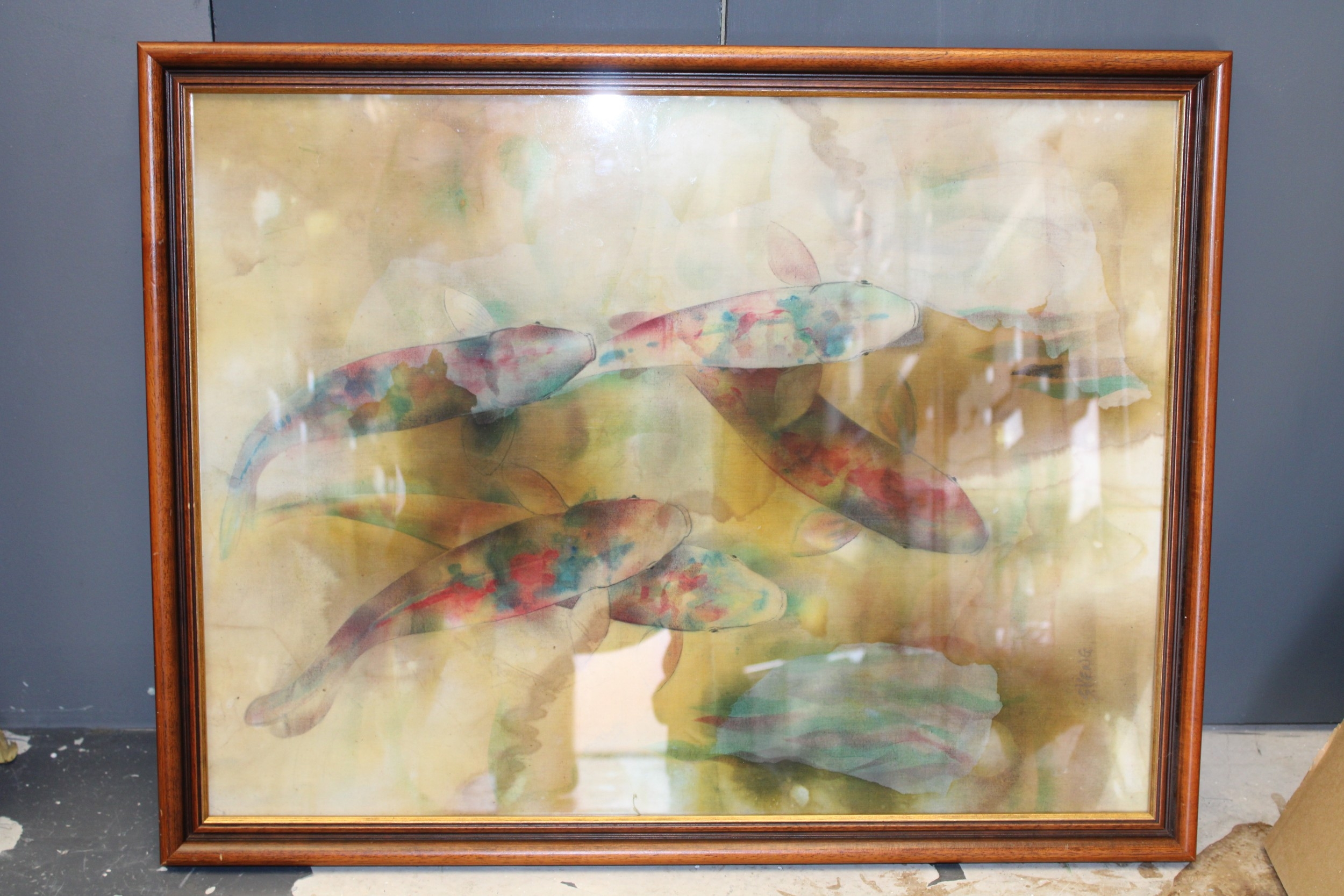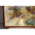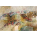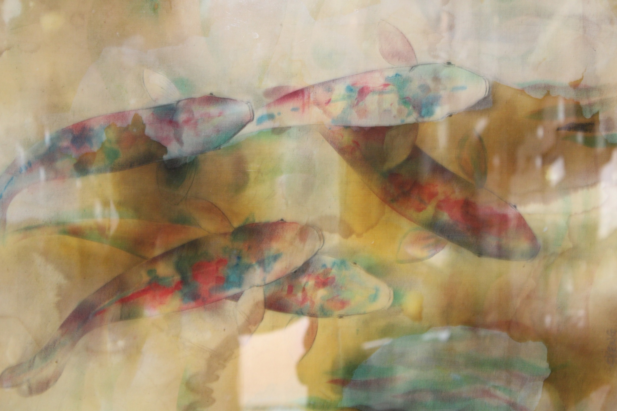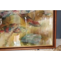 Batique artwork of fish viewed from above, 58cm x 44cm.