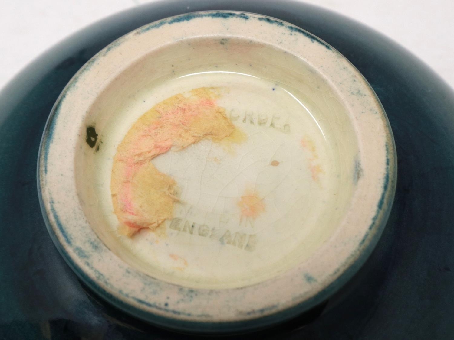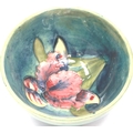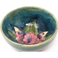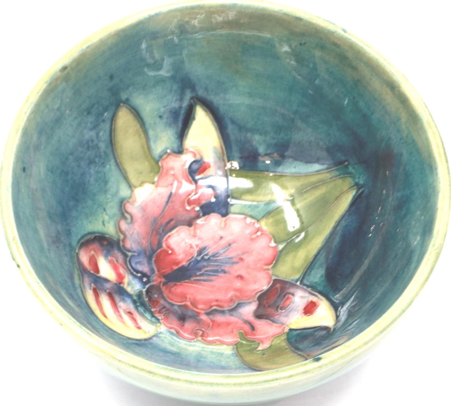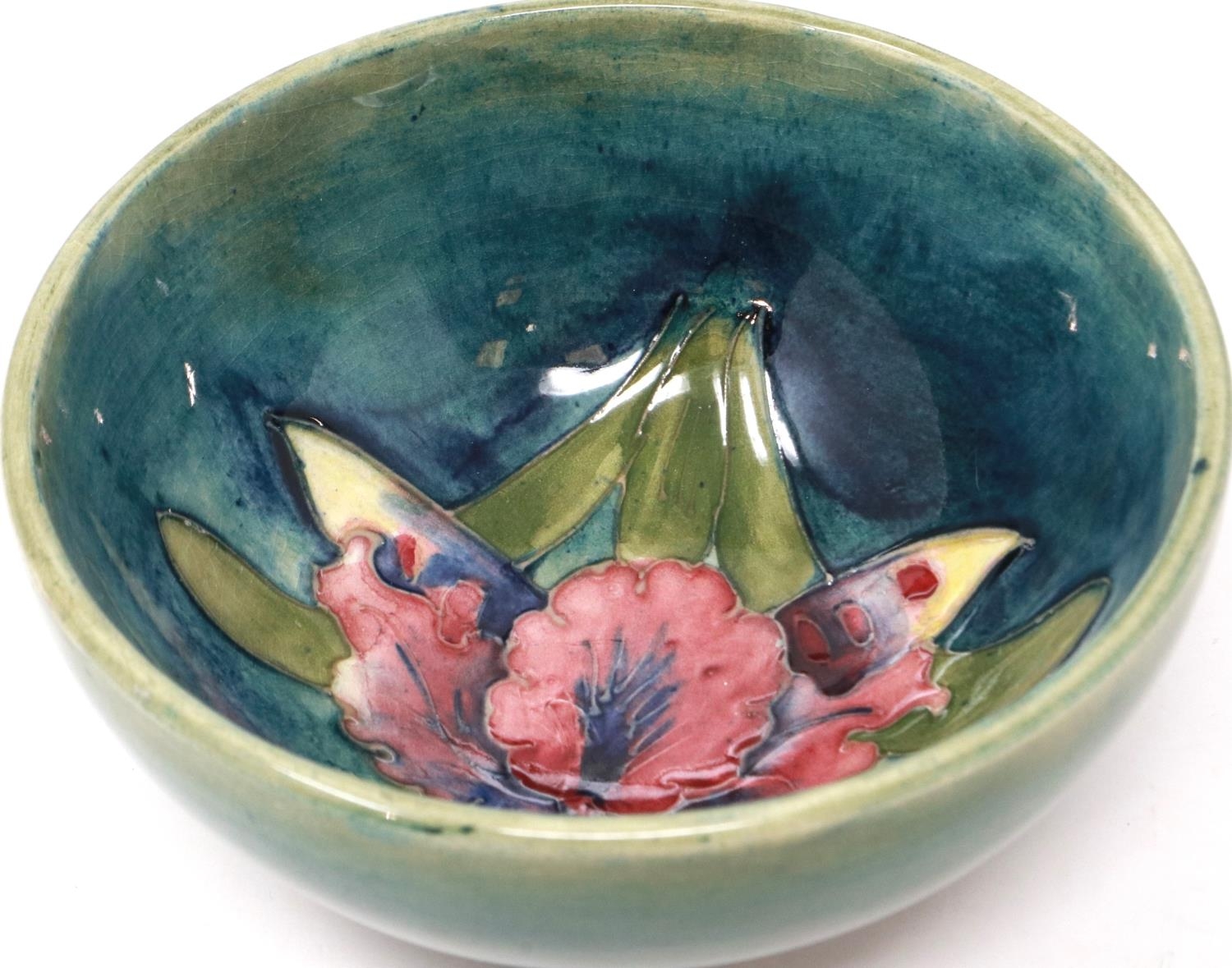 Moorcroft footed bowl in the Iris pattern, D: 11 cm, small chip to rim and heavy crazing throughout, sticker to the Late Queen Mary been removed. P&P Group 1 (£14+VAT for the first lot and £1+VAT for subsequent lots)