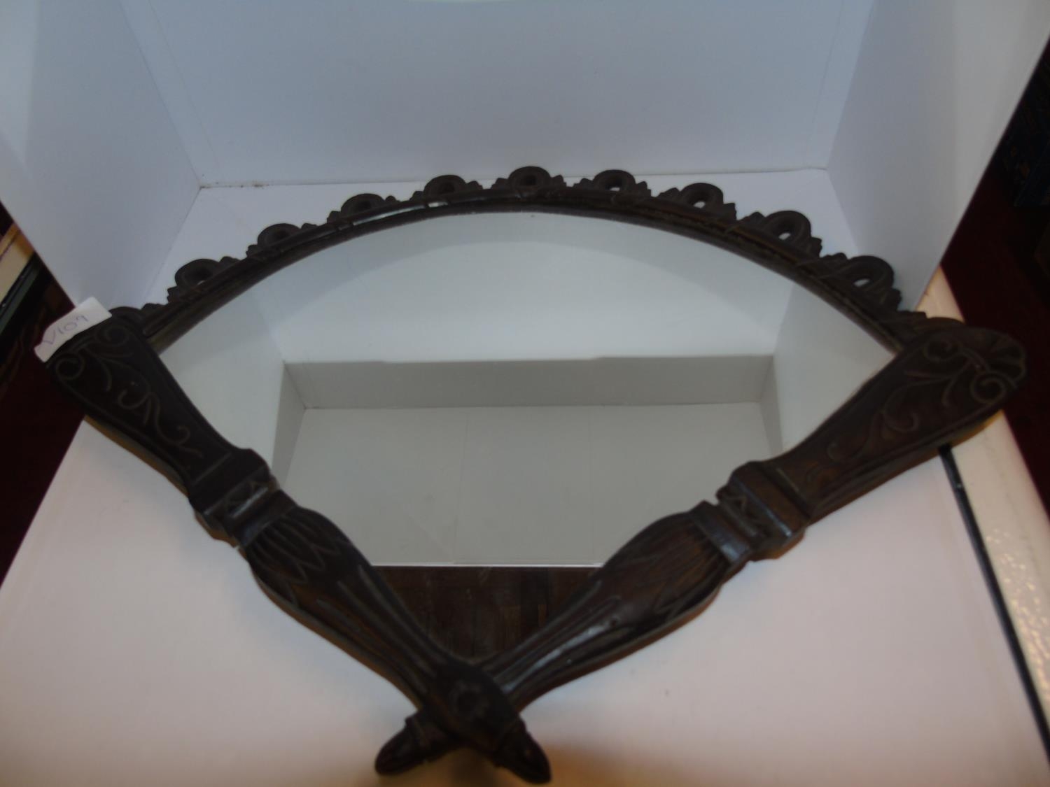 A fan shaped hand carved tramp art style mirror