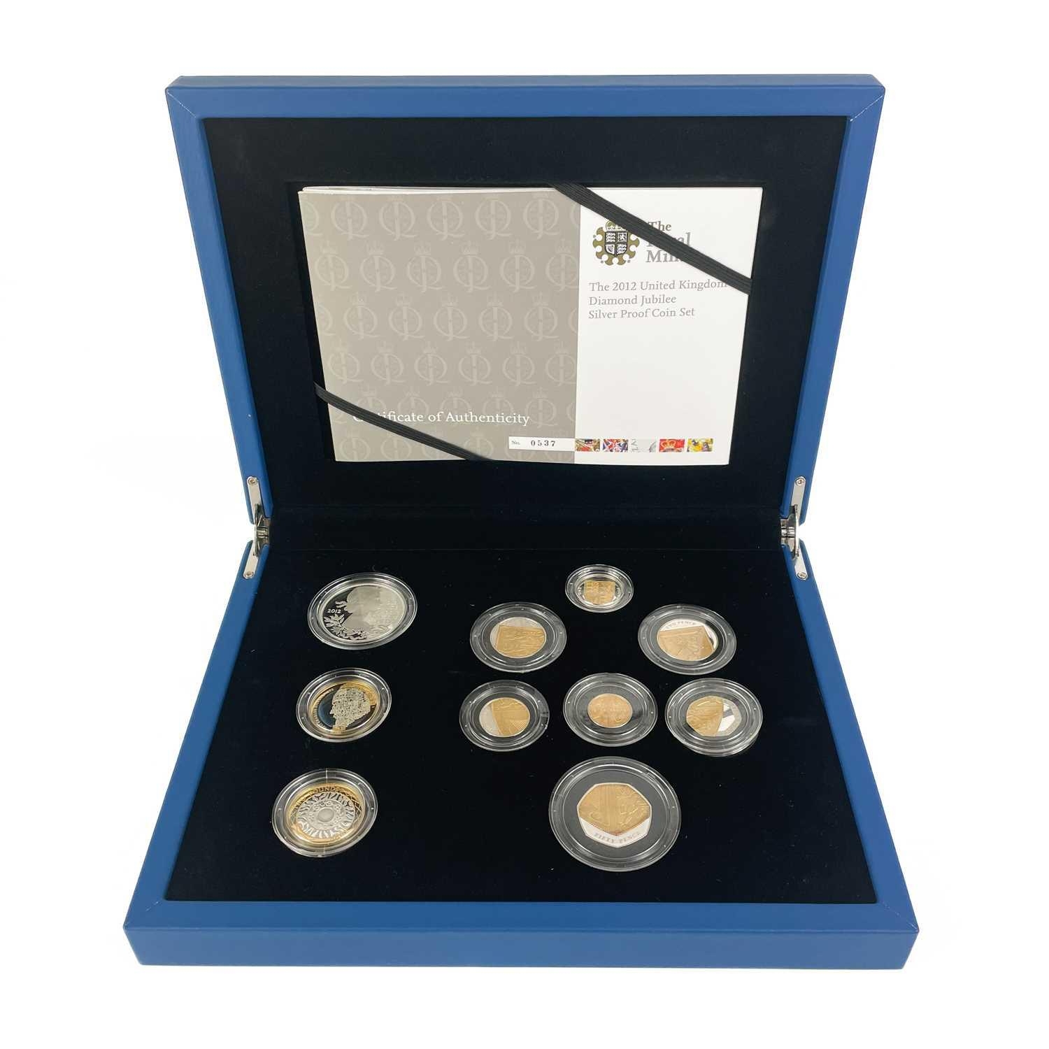 Royal Mint UK. Silver proof. 2012 Diamond Jubilee coin set. Comprising 10 coin gold tinted silver proof set from 1 pence to five pounds. Together with Certificate of Authenticity. An attractive set. Inner box in excellent condition. Outer box slightly scuffed.