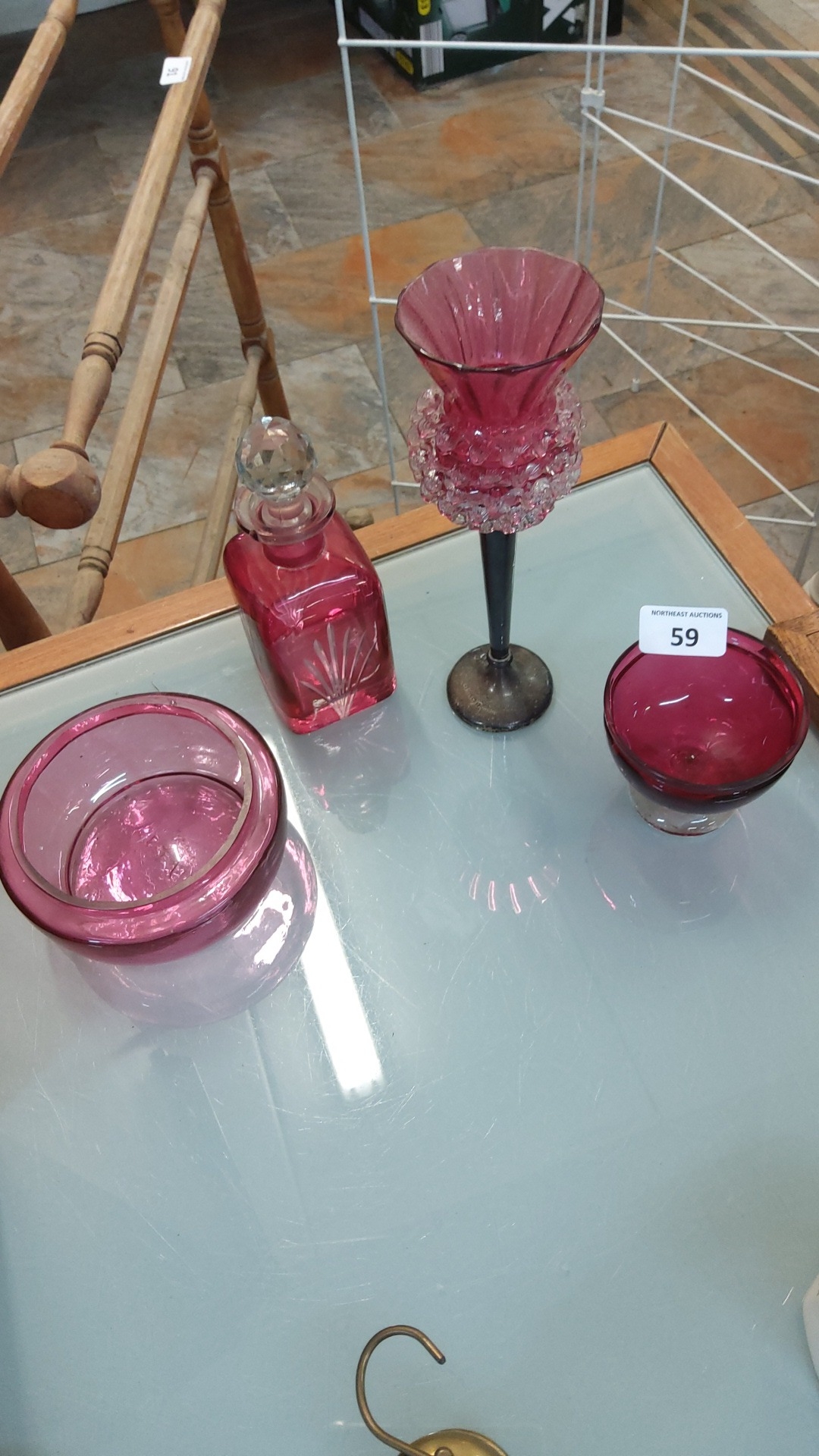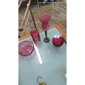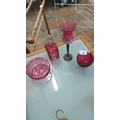 Set of four cranberry glass items comprising a faceted stopper scent bottle with cut decoration, a flared vase with applied raspberry prunts on a dark stem, a small bowl, and a rounded bowl or posy holder.
