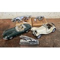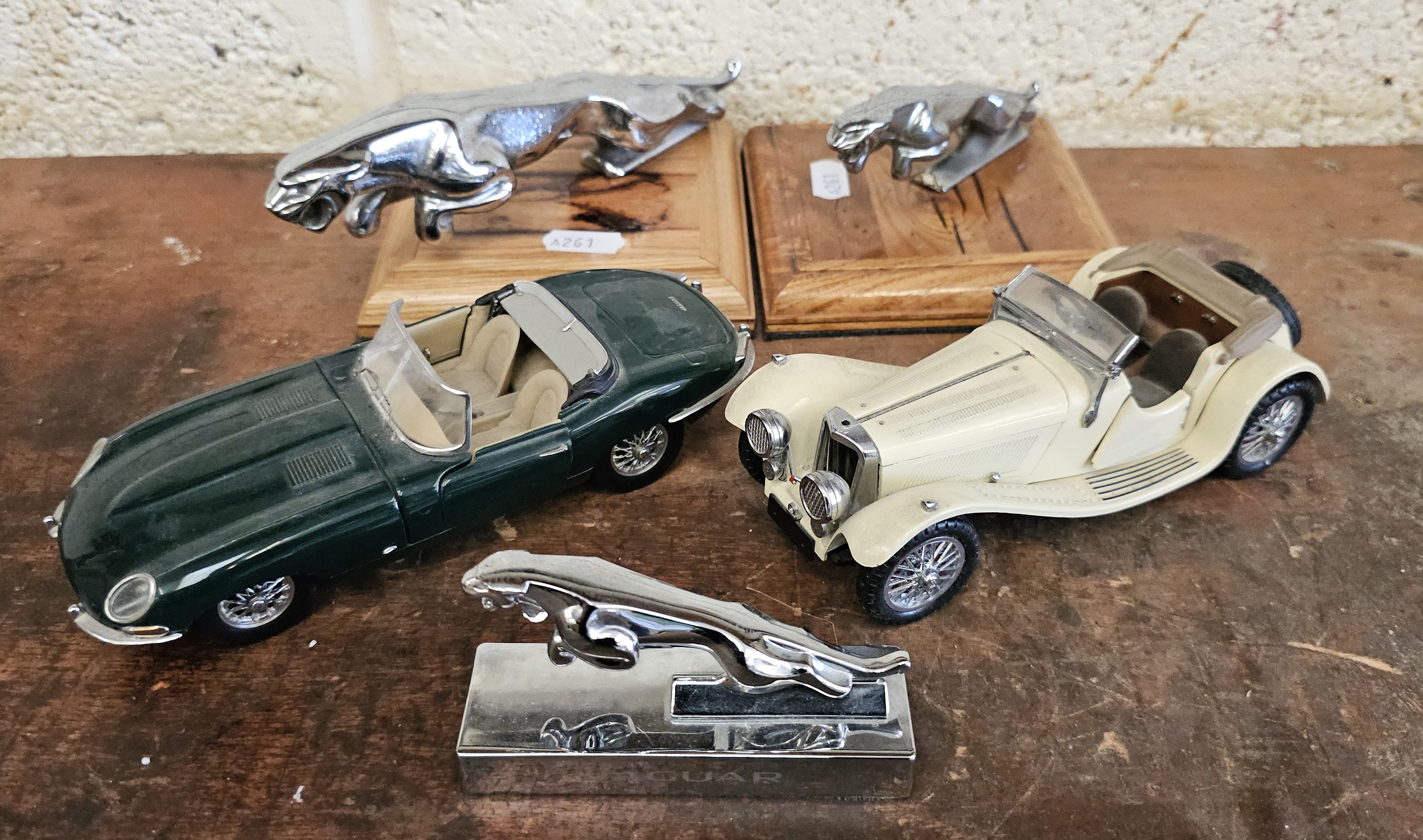 Two Franklin Mint die cast cars, Jaguar E Type and SS100, and three Jaguar leaping cats (5)
