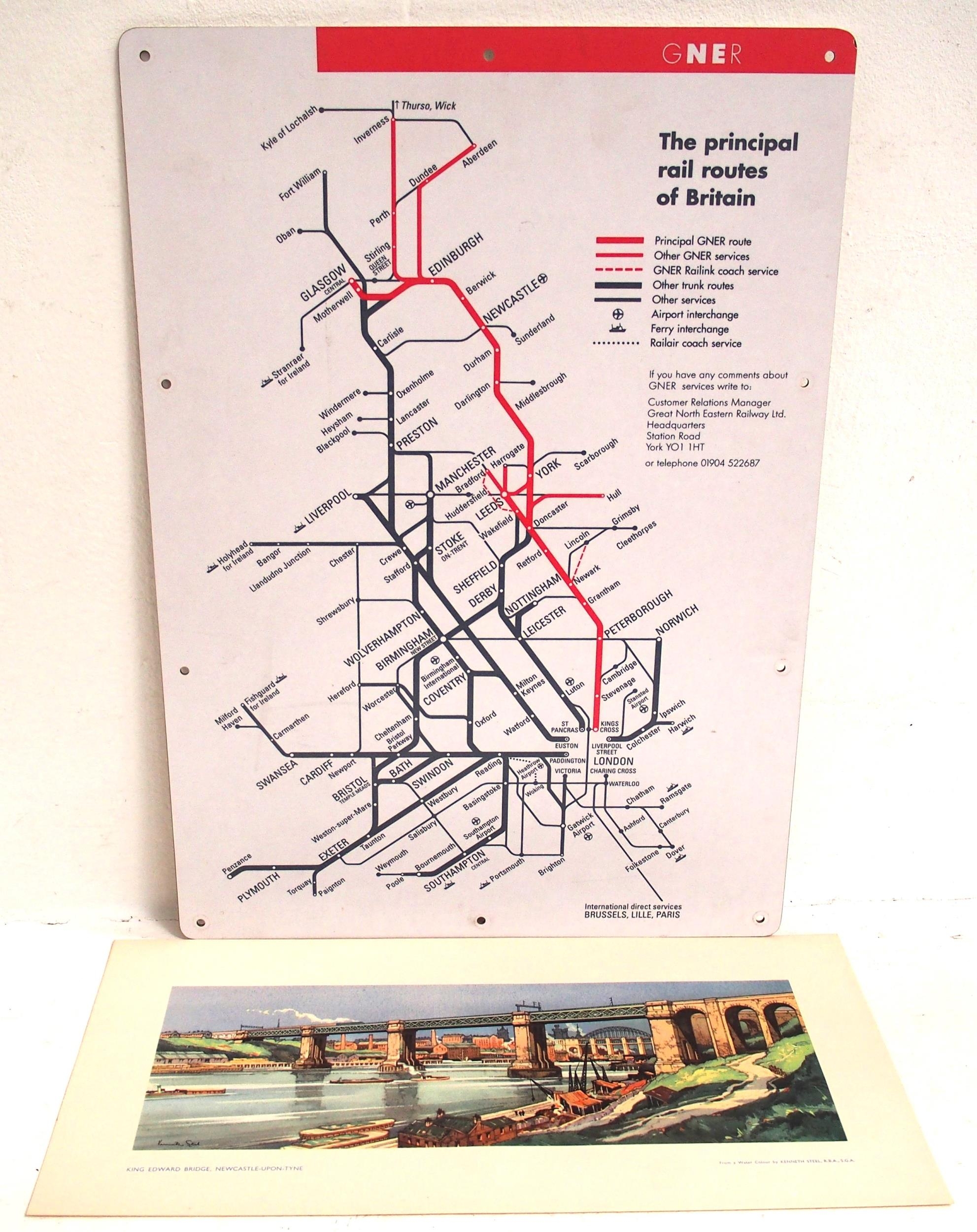 GNER "THE PRINCIPLE RAIL ROUTES of BRITAIN" map on Formica 16½"x 23½", good condition, BR unframed carriage print "KING EDWARD BRIDGE NEWCASTLE UPON TYNE" by Kenneth Steel, good condition. (2) (D1) (Dispatch by Mailboxes/Collect from Banbury Depot)