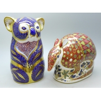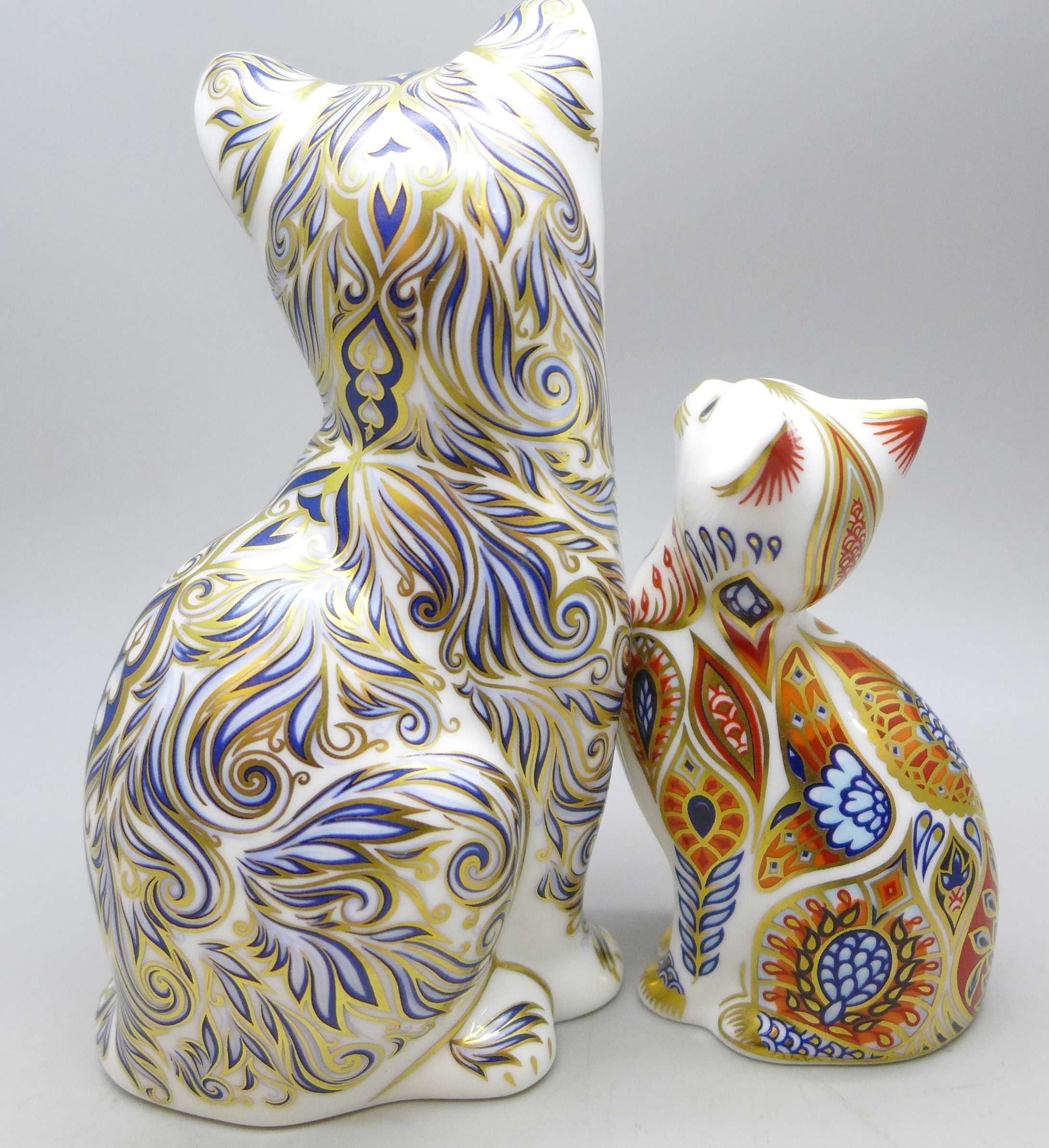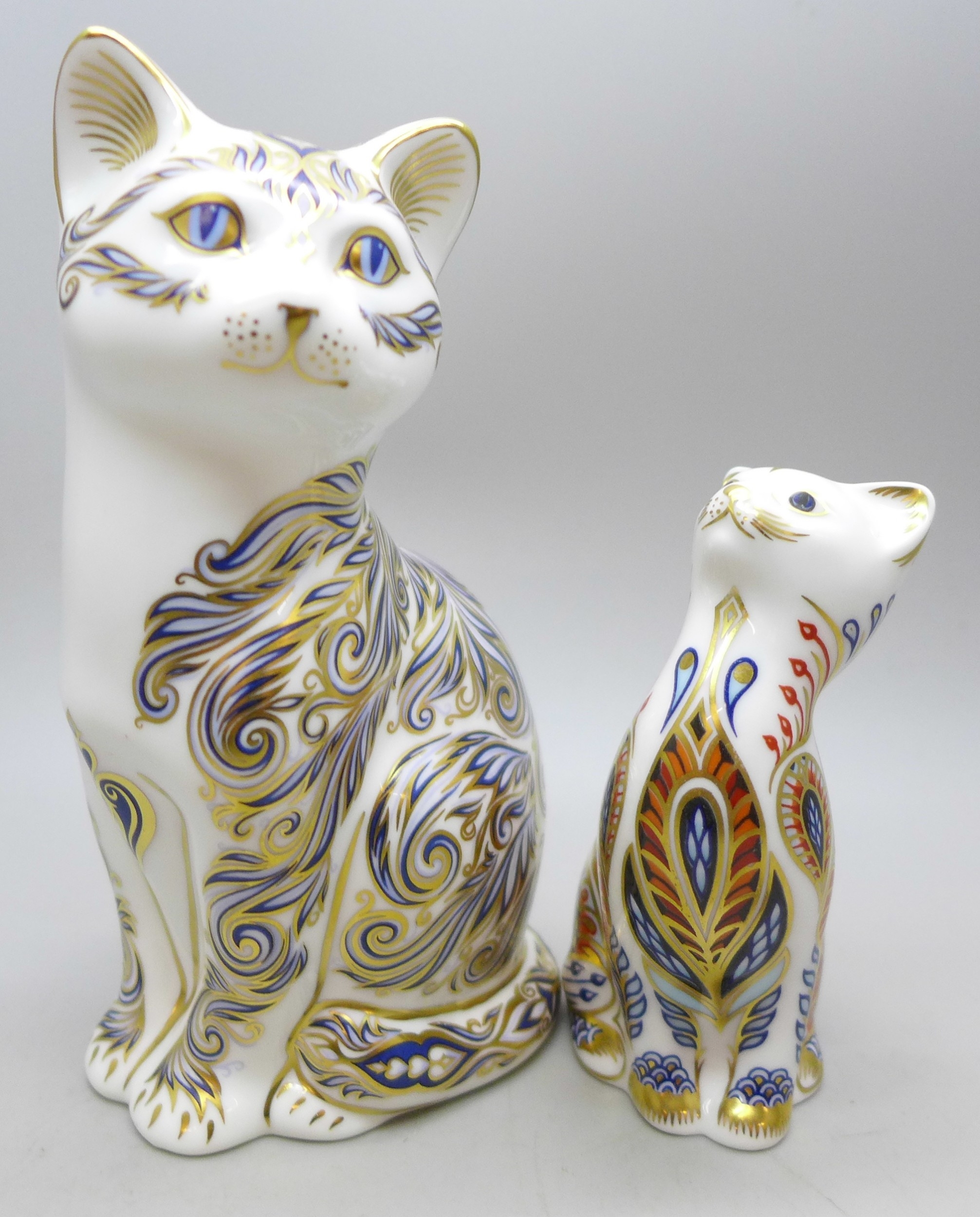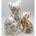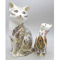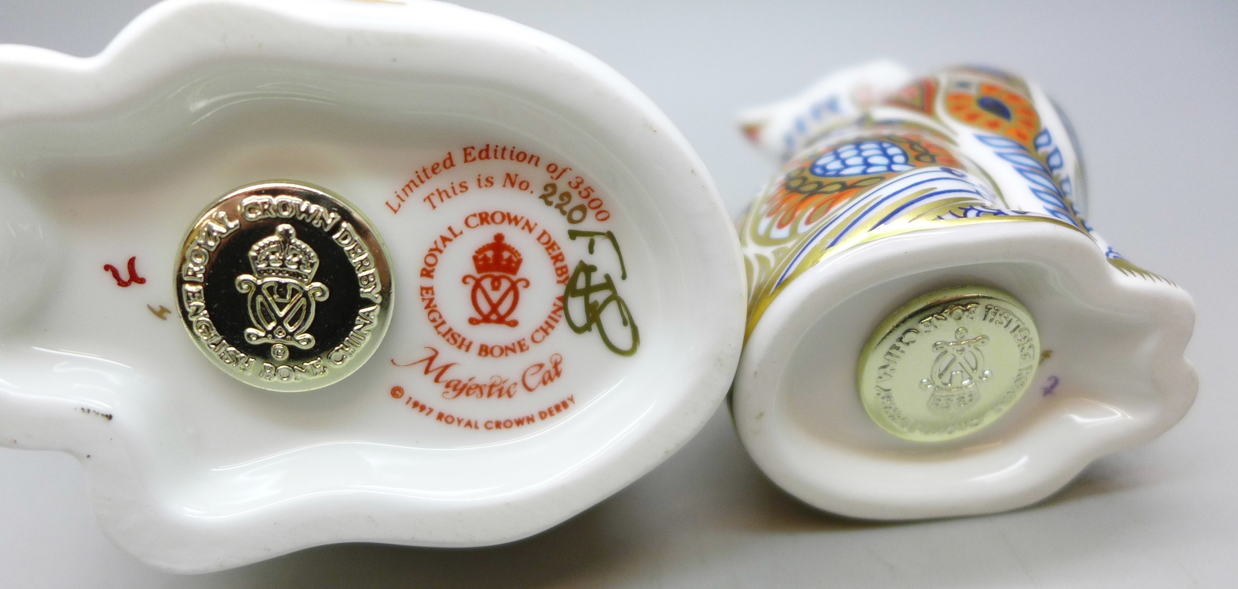 A Royal Crown Derby limited edition Majestic Cat paperweight figure no. 220/3500 and another Royal Crown Derby cat paperweight, both with stoppers