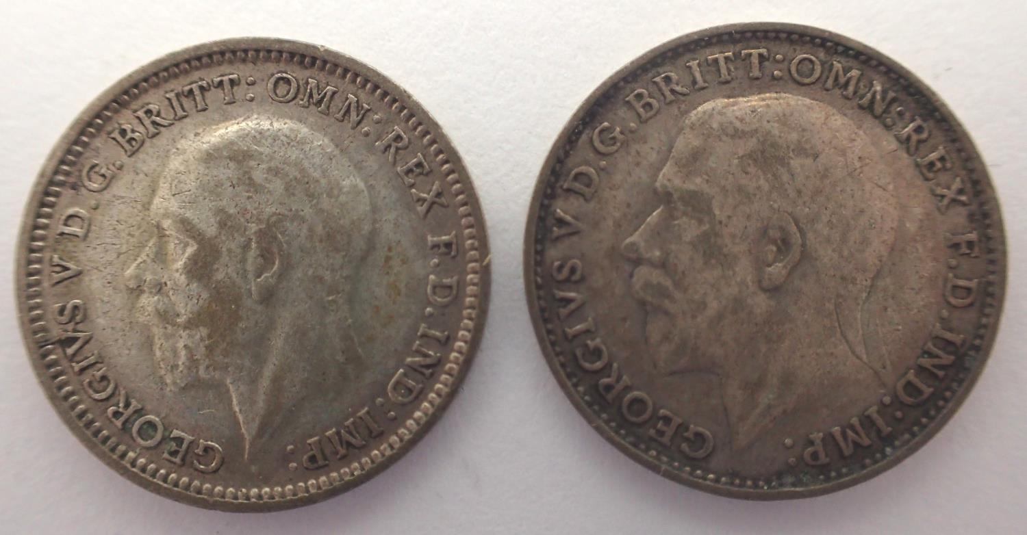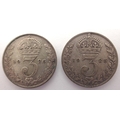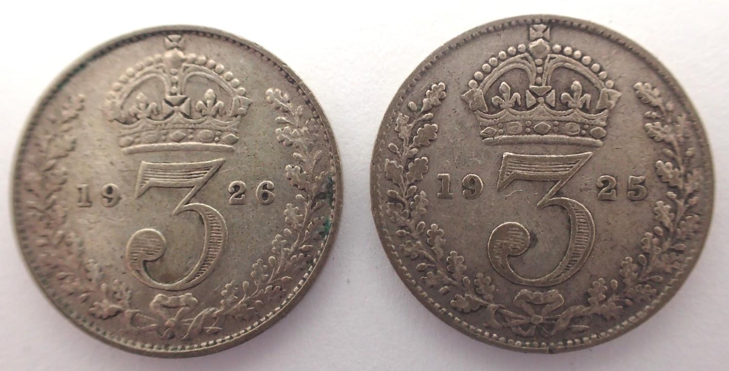 1925 and 1926 silver threepences of George V (2). P&P Group 1 (£14+VAT for the first lot and £1+VAT for subsequent lots)