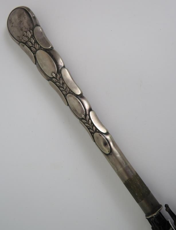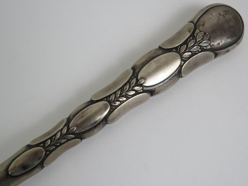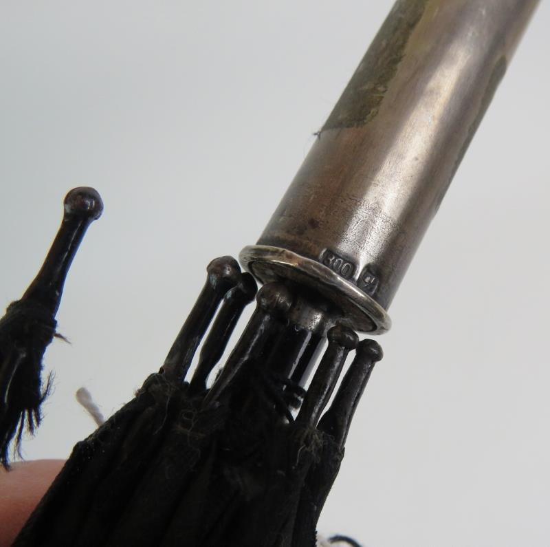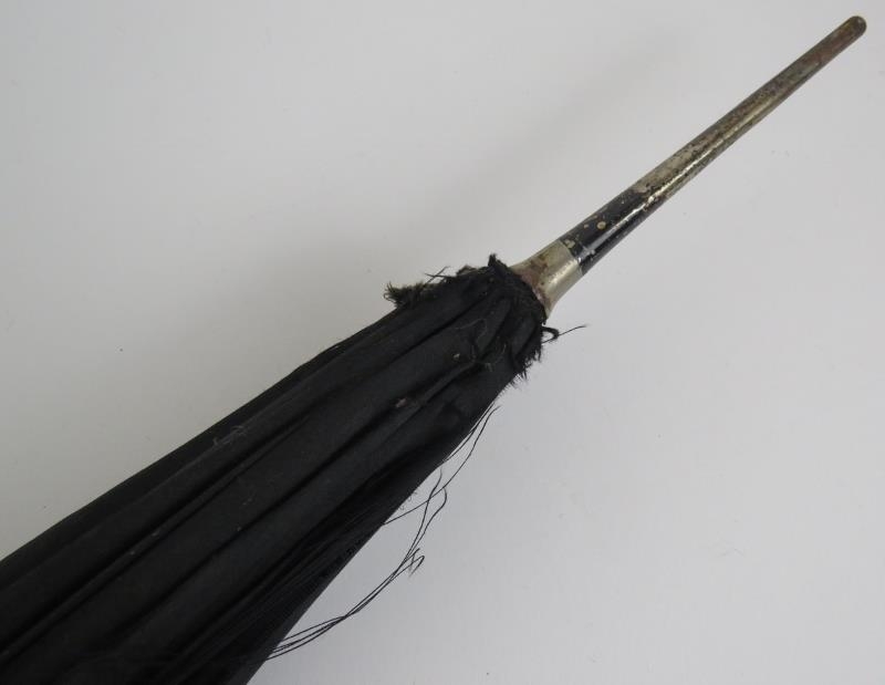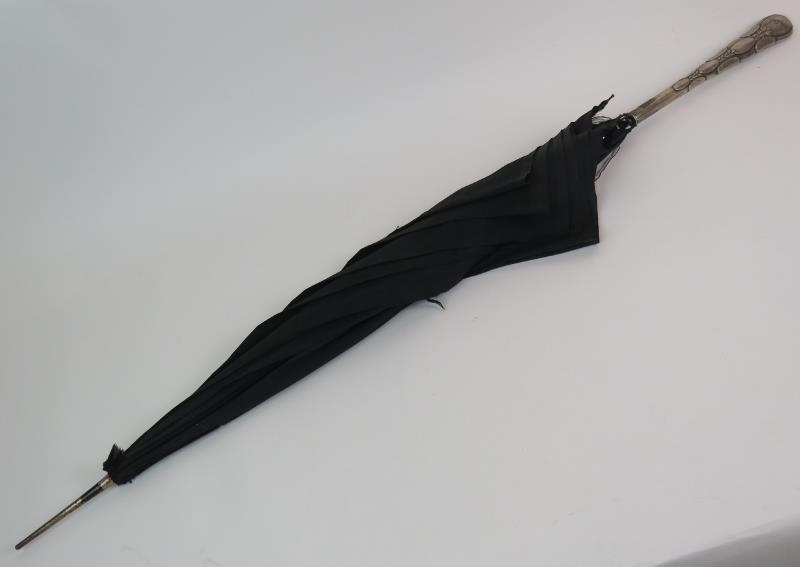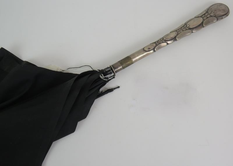 An Art Nouveau continental silver handled umbrella/parasol c1920s with continental 800 marks. Overall length: 98cm.