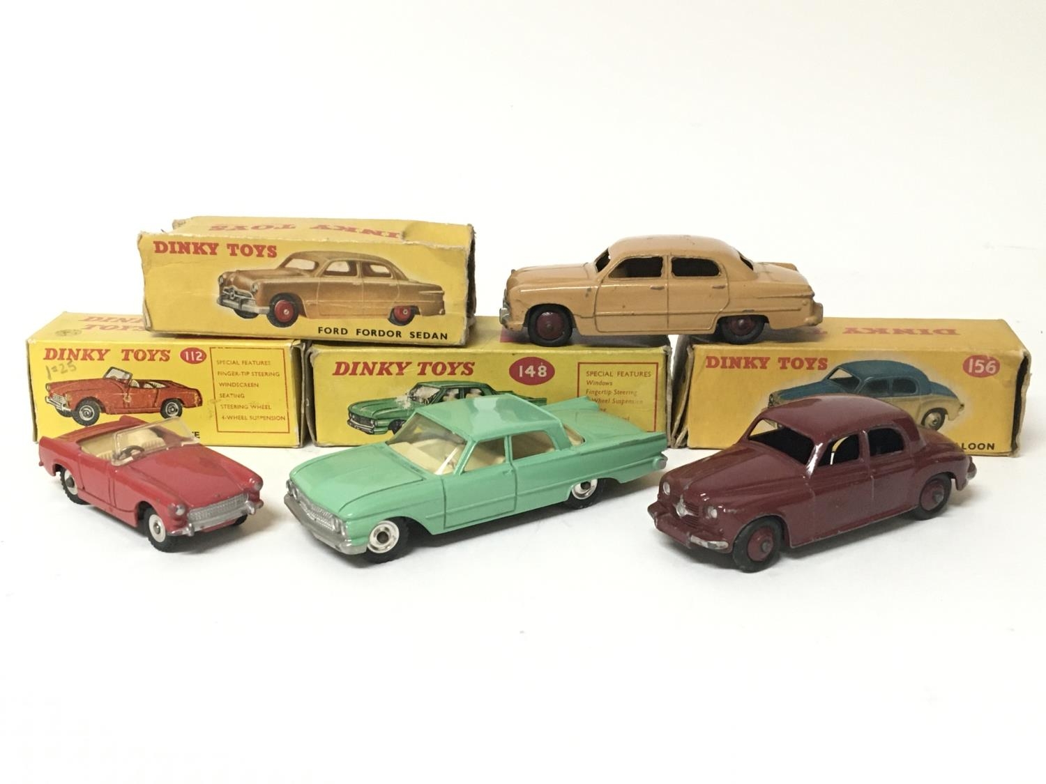 Dinky toys, #156 Rover 75 saloon, #112 Austin Healey sprite, #170 Ford fordor sedan and #148 Ford Fairlane, boxed
