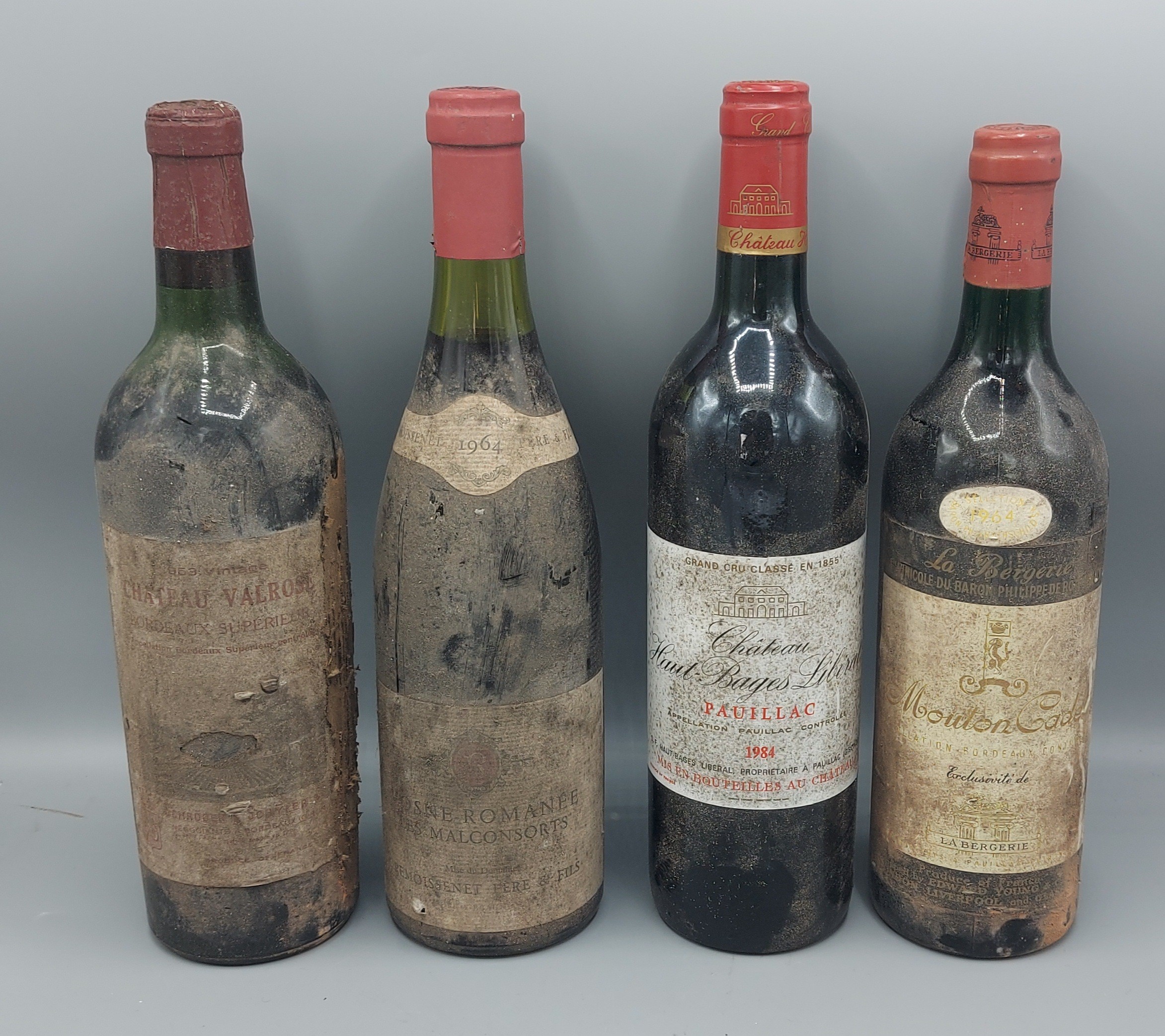 One bottle Vosne-Romanée Cru Les Malconsorts Domaine dated 1964 red wine together with one bottle Baron Philippe de Rothschild La Bergerie, Mouton Cadet dated 1964, red wine, one bottle Château Haut Bages Libéral Grand Cru Classé, Pauillac deted 1984, red wine, and another bottle Chateu Valrose, Bordeaux Superieur, red wine, (4)