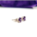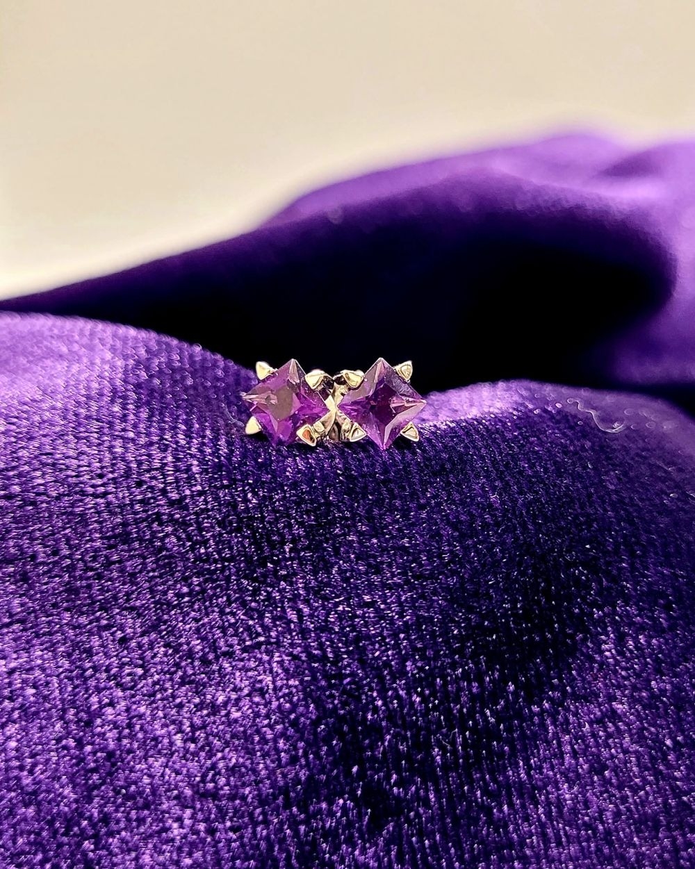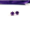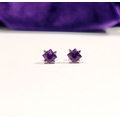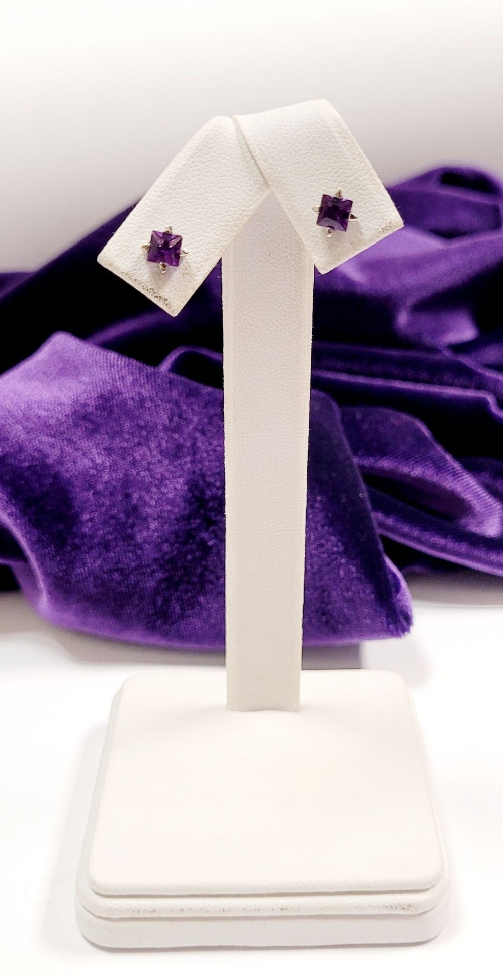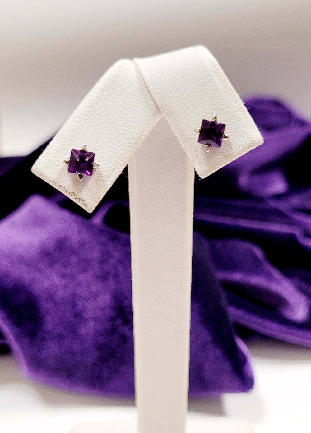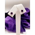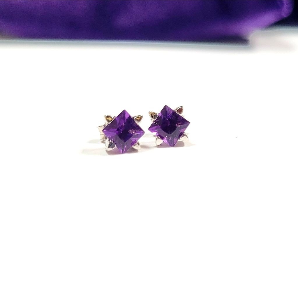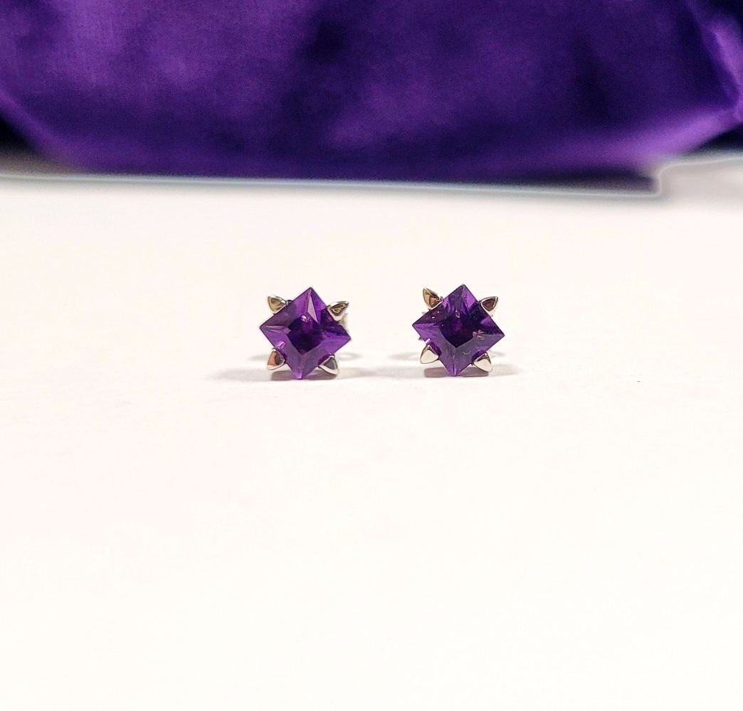 A PRETTY PAIR OF 18CT WHITE GOLD PRINCESS CUT AMETHYST STUD EARRINGS, a gorgeous bright purple tone to the stones a perfect contrast to the white gold setting. Each stone is 0.4 x 0.4mm.
